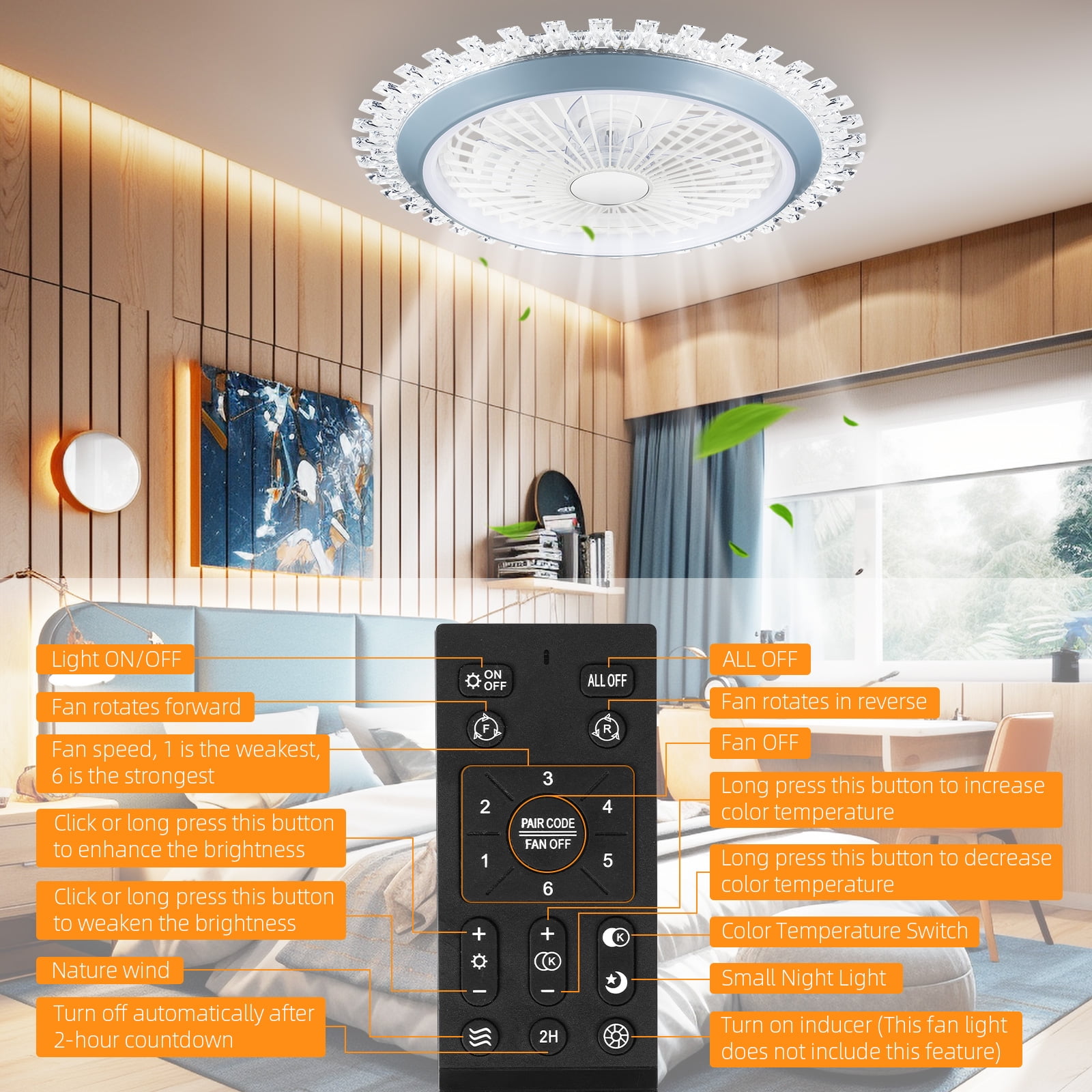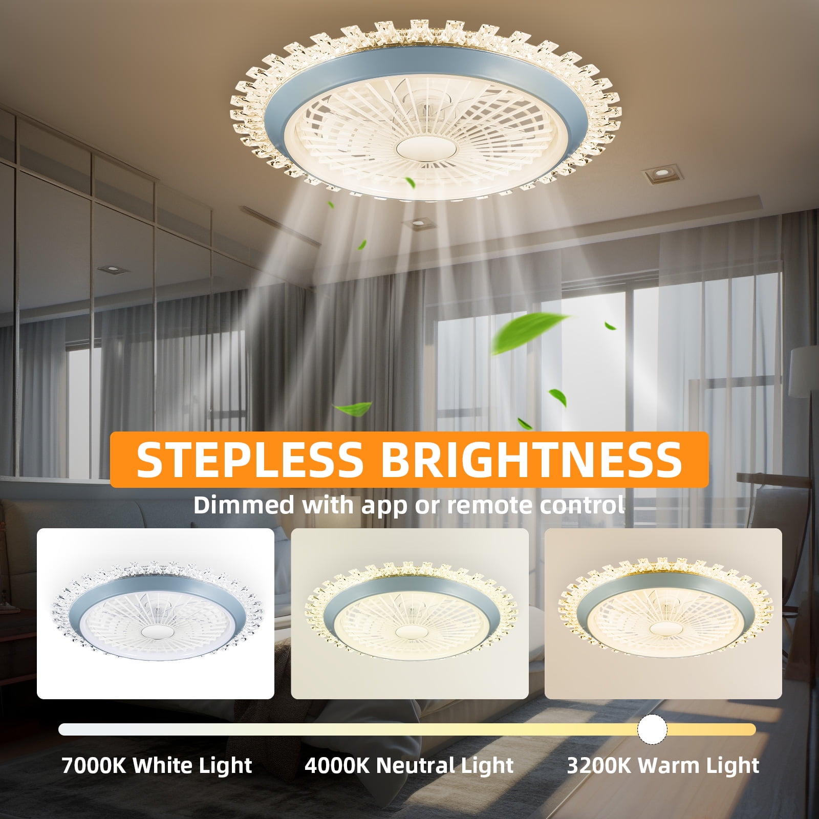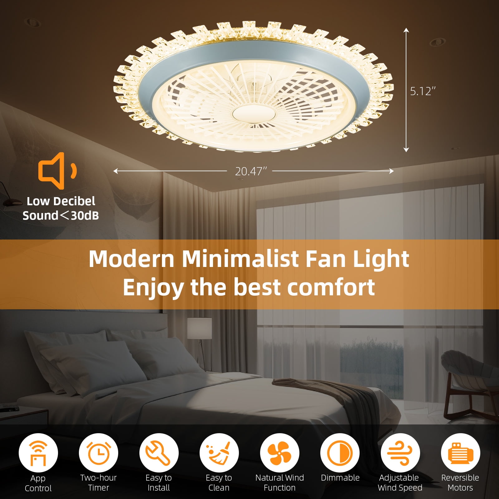 ????2-in-1 Modern Ceiling Fans with Light: This is a modern ceiling fan light that can be used for both purposes. On the one hand, it can bring you a refreshing coolness in summer, and on the other hand, it can light up light for you in the dark. Stylish and elegant in design, it is an ideal low profile ceiling fan with light for decorating bedrooms, living rooms, dining rooms, kitchens, children’s rooms, study rooms, and other places. ????Remote & APP Control: You can freely adjust the lighting brightness, 3 color temperatures (white medium warm), wind speed (6 gears), timer settings, night light mode, natural wind mode and other functions through the remote control or APP (downloaded through the QR code in the manual). ????Powerful Pure Copper Motor: The motor is the core component that affects the performance of the ceiling fan light. Our enclosed ceiling fan with light is made with a silicon steel motor with pure copper winding coils. This motor runs with a smooth and fluid current, low motor friction, low noise and a longer service life. Both forward and reverse rotation are possible. ????Low Noise Small Ceiling Fan Light: This flush mount ceiling fan light has very low noise and will not affect sleep. With natural wind mode, the wind blown out is very soft and comfortable. And also equipped with a small night light mode, the light is not dazzling at all. Let it quietly accompany you through every happy night! ????Safe Enclosed Ceiling Fan with Light: The safety factor of enclosed ceiling fan light is higher than that of open ceiling fan lights. Because the protective casing outside the enclosed ceiling fan light can avoid accidental injury to users caused by the detachment of the fan blades. This safety is particularly important for indoor ceiling fan light. ????Worry Free Purchase: If you have any dissatisfaction or encounter any problems during use, please feel free to contact us at any time. Customer service is available 24 hours a day. Color : Black Material : Alloy Steel, Copper Style : Modern Light fixture form : Ceiling Room Type : Living Room, Bedroom Indoor/Outdoor Usage : Indoor Power Source : Corded Electric Special Feature : Remote Controlled Control Method : App, Remote Shade Material : Alloy Steel Item Package Quantity : 1 Item Weight : 7.54 pounds Package Dimensions : 22 x 22 x 7.5 inches Packaging: 1* Ceiling Fan Light 1*Remote Controller