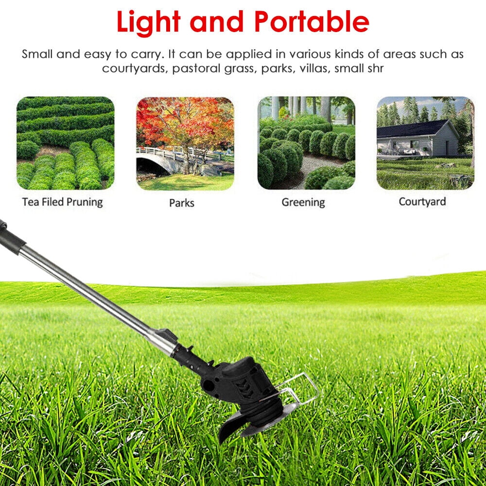 1.????POWERFUL & LIGHTWEIGHT – 3 in 1 Weed wacker, grass trimmer/edger equipped with a 900W high-power pure copper motor, up to 8000r/min no-load speed. With a 2000mAh lithium battery, it can run for up to 40 minutes. Weight only 3.9Ibs, and easy to handle for women and the elderly. The double control switch ensures safer operation. 2.???? 3 TYPES OF BLADES – Our weed wacker comes with three types of blades to handle any job. The circular saw blade is great for cutting thorny shrubs, small vines, and saplings in narrow gullies. The stainless steel flat blade is perfect for cutting thick grass and weeds, while the nylon blade is best for delicate grass, mowing lawns in circular yards and lots, flower beds, walkways, and patios. 3.???? ADJUSTABLE CUTTING ANGLE & HEIGHT – Our weed trimmer shaft is designed to be smoothly adjustable between a height of 35 inches and 49 inches, enabling you to work comfortably and with good posture. The angle of the weed eater’s machine head can also be adjusted from 0 to 90 degrees, allowing you to easily trim sloped lawns and other tight areas your mower cannot reach. 4.???? HIGH-EFFICIENCY BATTERY – This Weed Wacker is equipped with TWO 2.0Ah Batteries, each one working time 1-2 hours (depending on your working load) complete the weeding task in one go! Our battery weed eater capacity inner is 10% higher than other cordless brush cutters, with multiple protection functions for a safer and longer life! 5.???? EXTEND BATTERY LIFE – Please charge the battery fully the first time you use it. Charging before it runs out to extend the service life. Please unload the battery immediately after use to keep the power off.