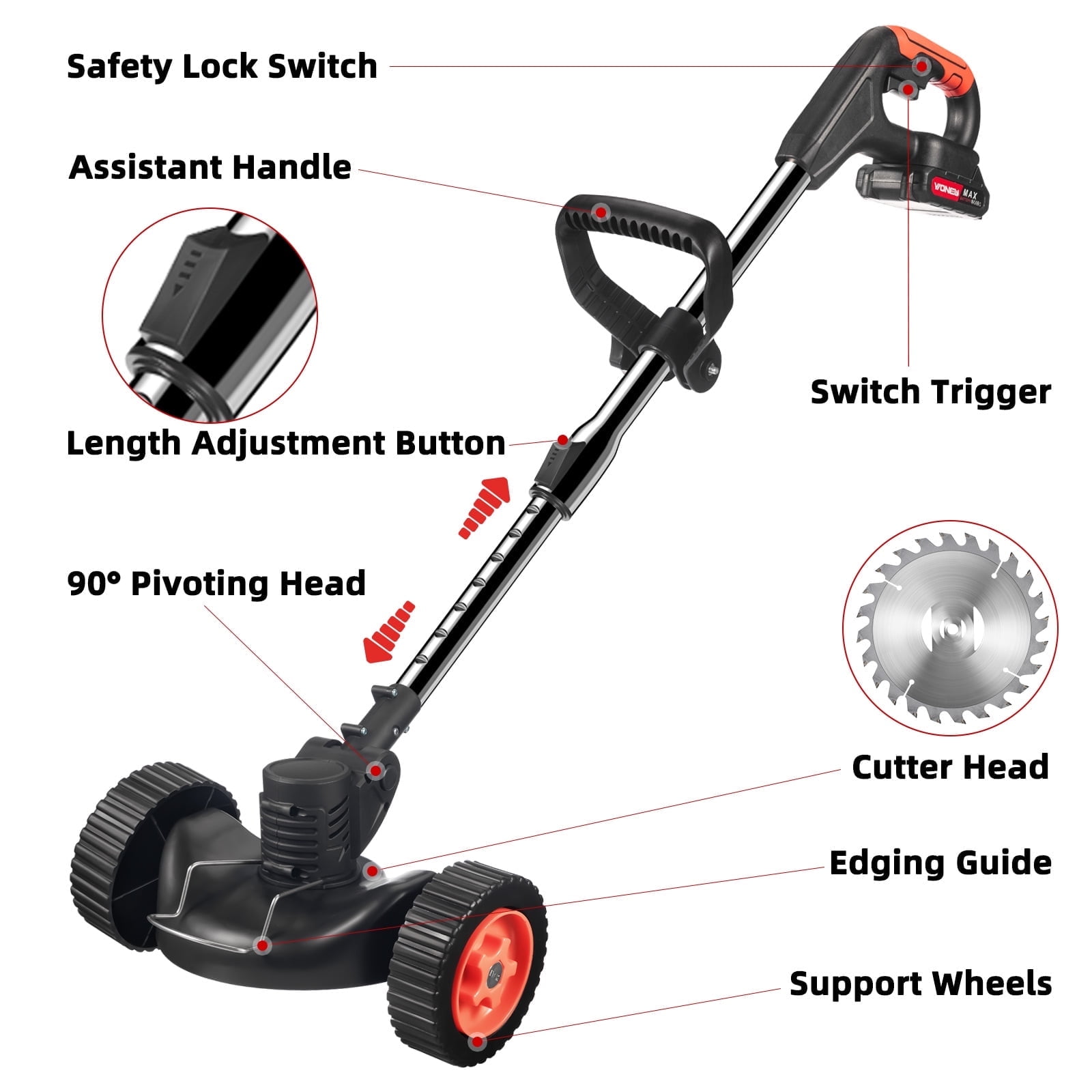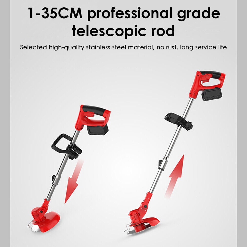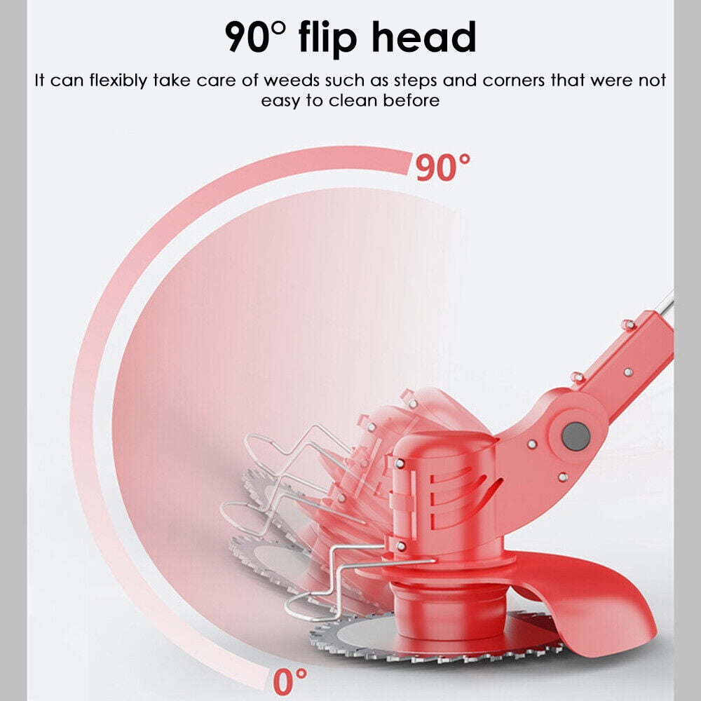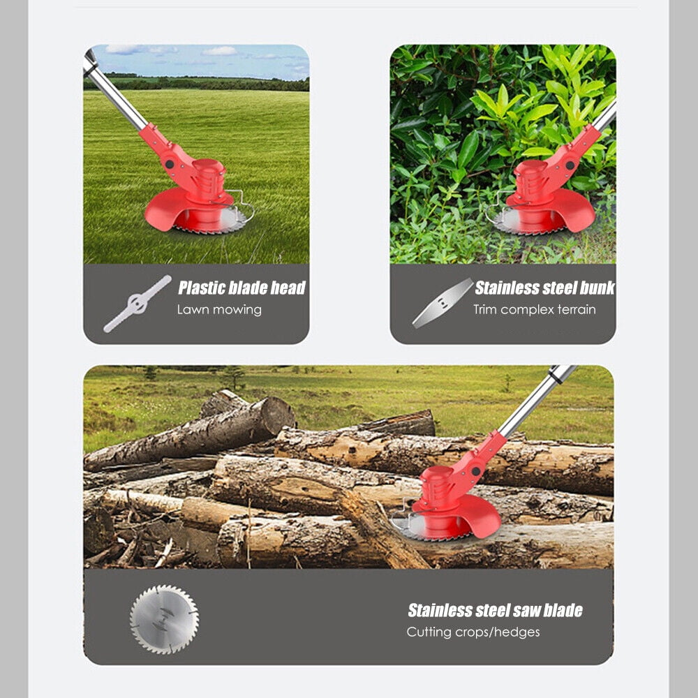 Specifications: 【High-power and high-efficiency lawn mower】The electric lawn mower is cordless, with a power of 800W and a motor speed of 21,000 rpm. Includes two rechargeable 2000mAh high-capacity 21V batteries. This battery-powered electric weed killer will be one of the comfortable and flexible tools in lawn mowing. Improve your work efficiency, finish your work quickly and reduce stress. Weed wacker battery power supply does not use any gasoline, so it is quieter, safer and more environmentally friendly. 【3-IN-1 3 kinds of blades for lawn mower】There are 3 different types of blades for electric cordless lawn mower. Multi-purpose: plastic blade is suitable for cutting grass on soft lawn; Stainless steel metal blade is suitable for pruning weeds and small shrubs; 40-tooth alloy saw blade is very suitable for cutting thick shrubs, branches and seedlings. To avoid damaging the blade, please choose the correct blade when weeding. ) 【Adjustable length and upgraded wheel design】The battery-driven lawn mower is equipped with an adjustable lever, which can be freely adjusted between 35.65 and 50.69 inches. Meet the weeding needs of people with different heights. It is worth mentioning that our cordless brush cutter has also upgraded its wheels. The triangular structure of the bracket is more stable, ensuring that it can work in the most complicated environment. Wider tires allow you to push the lawn mower more smoothly. 【Portable cordless lawn mower is easy to use】The lawn edger is completely cordless, and there are no entangled cables or wires. Lightweight and compact design, weighing only 3.28 pounds, is easy to carry and can be easily used by women and the elderly. At the same time, it is equipped with a safety lock design. Anti-collision metal protection ring can prevent the grass trimmer from colliding and damaging the cutting blade. This is a friendly and worry-free electric cordless mower. 【Premium Weed Wacker& Professional Service】 Package includes 1 electric brush knife, 2 stainless steel blades, 1 alloy saw blade, 3 plastic blades, 2 batteries, 1 upgraded wheel, 1 goggles, 1 small rotary wrench, 1 weeding charger, 1 pair of gloves and 1 manual. Our service starts when you place an order, and 24-hour friendly customer service keeps you away from after-sales troubles. 【Double safety design lawn mower】The double switch design requires the user to press the safety lock and trigger at the same time to start this electric lawn mower, which effectively avoids wrong operation and greatly reduces the risks faced by you and your children. 【Humanized design】When working in the garden, you can freely adjust the angle of the mower head (0-90 adjustment) to cut sloping lawns or gaps that are difficult to clean, so as to obtain more comfortable and balanced control. Specification: 3-in-1 multifunctional lawn mower electric edger Material: aluminum+plastic Color: red Plug: USA Power input: 24V Battery: lithium battery, 24V Power: 800W Rotational speed: 21,000 rpm Charging time: 2 hours/battery Size: 35 x 5.9 x 4.1 inches Upgrade wheels: 1. Adjust the direction of the small buckle to adjust the wheel angle. 2. The triangular structure of the bracket is more stable, ensuring that it can work in the most complicated environment. 3. Wider tires can make you push the lawn mower more smoothly. The package includes: 1* Electric lawn mower 2* Stainless steel blade 1* alloy saw blade 5* plastic blade 2*24V battery 1* Herbicide charger 1* Upgraded wheels 1* Goggles 1* Small rotary wrench 1 pair of gloves 1* Manual