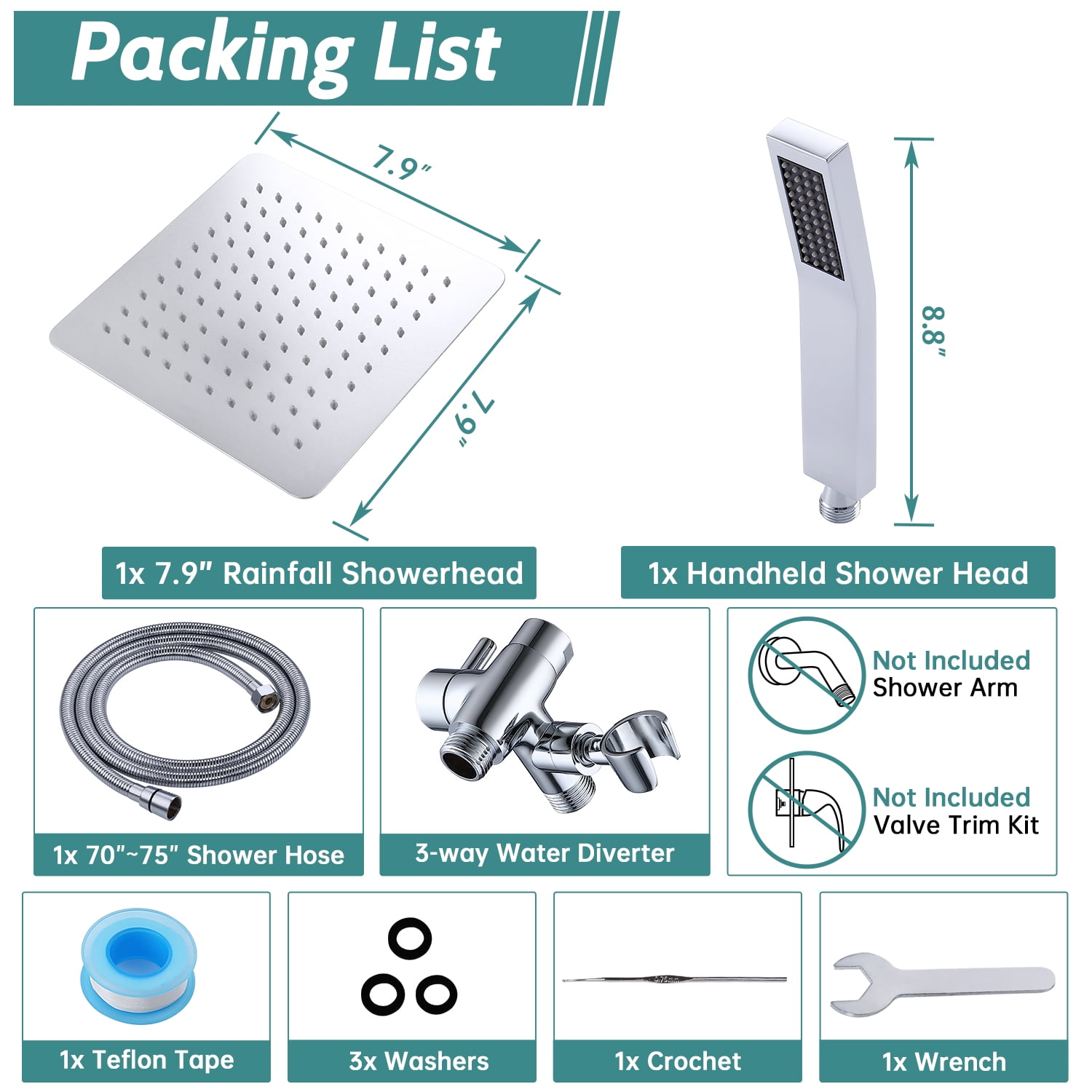 Rain shower head with handheld combo: The design of 2-in-1 double shower, provides you with multiple modes. Metal Diverter with Built-in Bracket: solid brass, no breaking. You can switch easily between the hand shower & the shower head, or both on at the same time. But when choosing both on at the same time, the water pressure is halved. If you want more water flow, you can use the crochet in the kit to remove the water restrictor, so you will get more water flow. 71″ Stainless Steel Hose: Super long flexible stainless steel hose, can stretch from 71 inches to 75 inches, allowing you to move and flush freely. It is more convenient for you to shower, bathe your kids, or clean your pets and toilet. Easy to install, only take minutes. Just follow the illustrated manual. A super quality Teflon tape is always helpful during your installation. The package comes with all the tools needed for installation. Brand Service: We provide customers with 3-year warranty after-sales service, if you have any questions about our products, please feel free to contact us, we will help you solve the problem, and in the first time to give you the most satisfactory reply. Package includes: 1* 8″ Rain Shower Head , 1* Handheld Shower Wand , 1* Flexible Hose , 1* Diverter with Built-in Bracket .