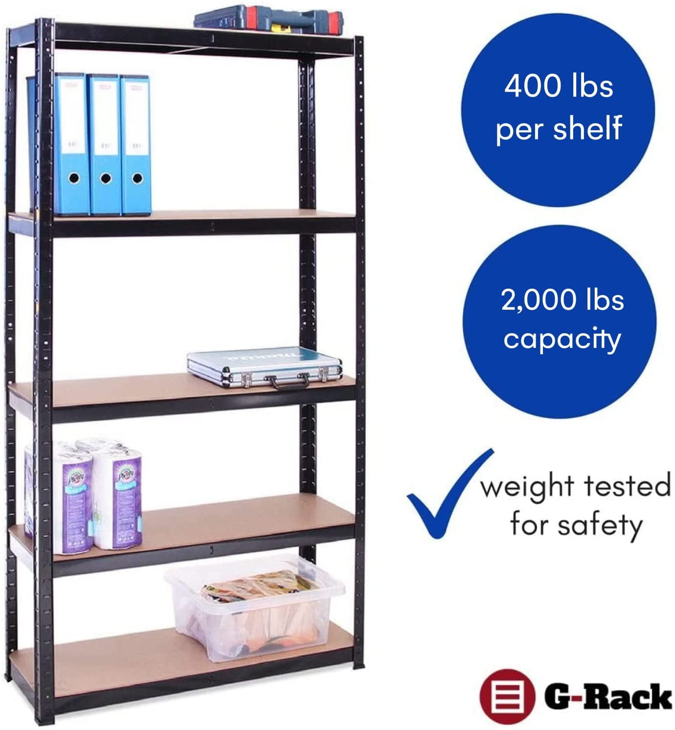 SINGLE PACK: 5 Tier 71 x 35 x 18 inches Black Shelving Unit FREE BAY CONNECTORS to connect your bays together safely & easily. STRONG & STURDY: each heavy duty shelving unit is fully tested and stable enough to hold a massive 2000lbs (that’s 400lbs per bay in total!). Plus nonslip rubber feet for optimum stability. EASY TO ASSEMBLE: quick and easy, our innovative boltless assembly system makes it easy for you to snap the racks safely together with no bolts or screws required. BUILT TO LAST: all G Rack shelving systems are made with high quality materials 0.2 inches moisture resistant MDF shelves plus rust resistant metal coating.