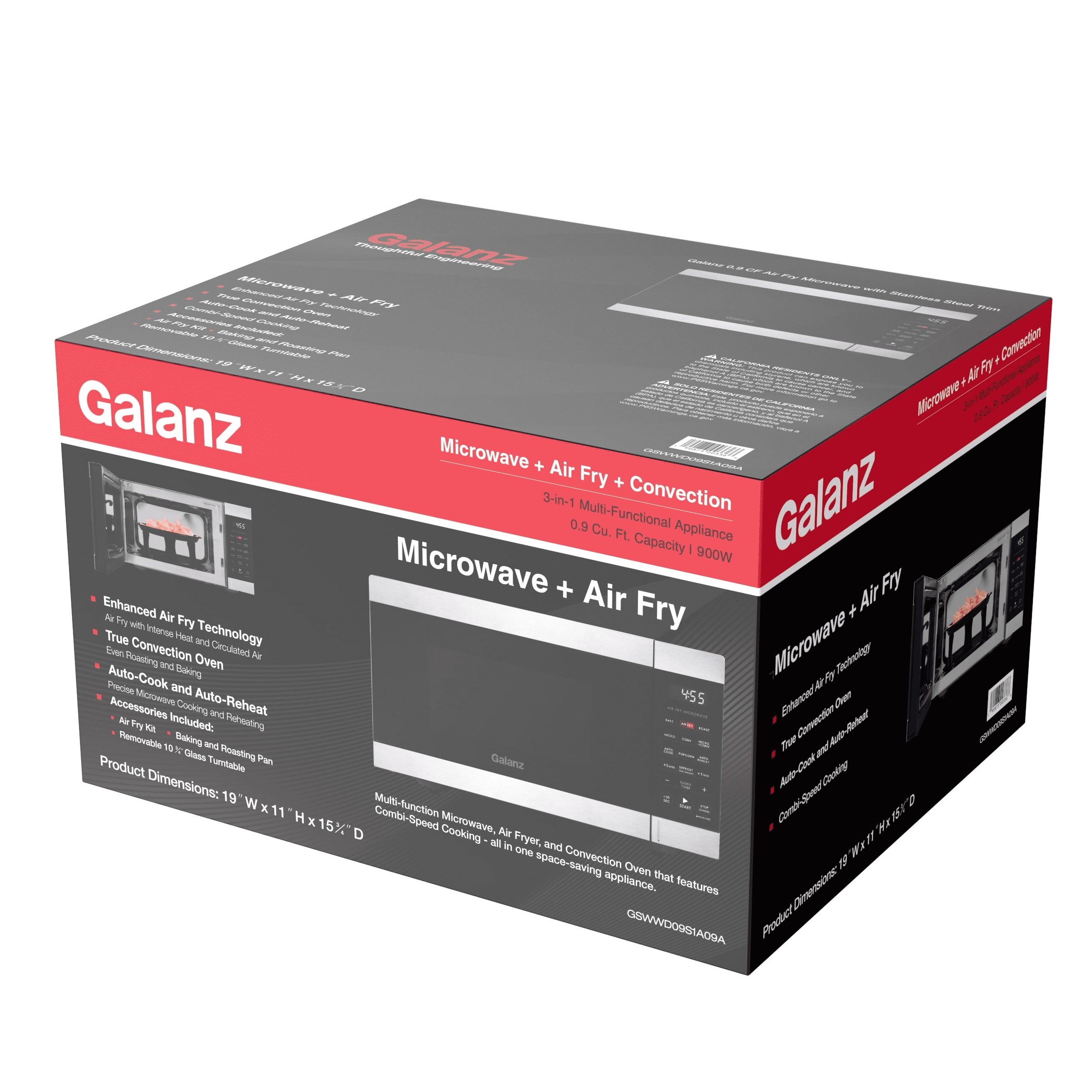 Galanz 0.9 Cu ft Air Fry Microwave Oven in Stainless Steel Multifunctional 3-in-1 Air Fryer, Convection Oven and Microwave Saves countertop space Combi-Speed Cooking – combines convection cooking and microwave cooking together 6 Auto-Cook and 8 Auto-Reheat programs True Convection technology circulates heated air as food spins 360° 900 Watts of power Condition: New Stock Number: GSWWD09S1A09B