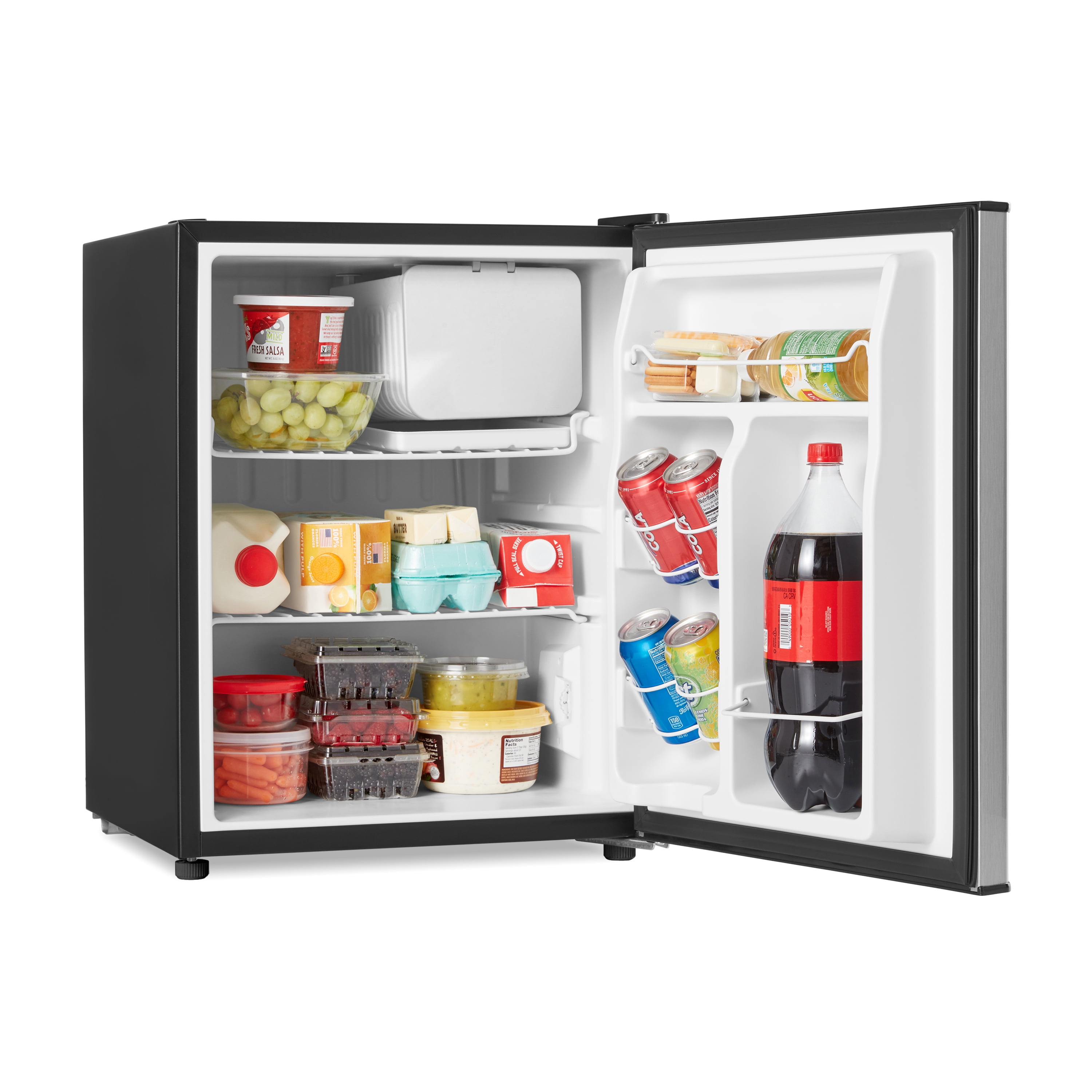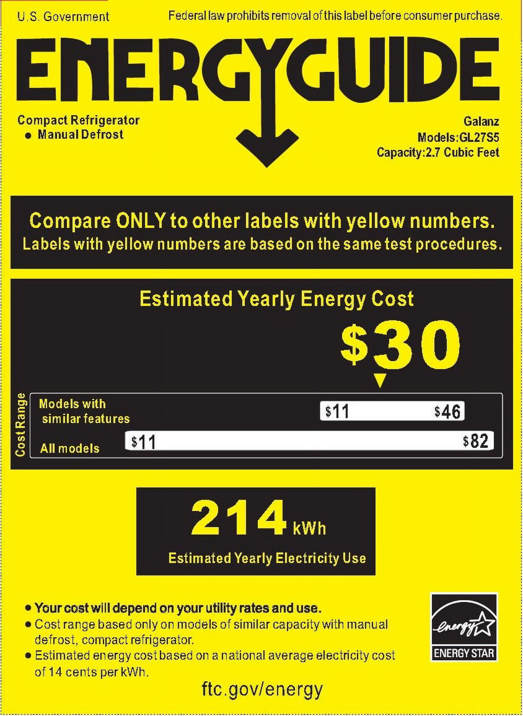 Color: Stainless Steel Look Compact Refrigerator Condition: New 2.7 Cu. Ft. capacity Product Dimensions: 19.7″ L x 19.1″ W x 24.7″ H One Door 2 wire shelves, slide-out Handy Can Dispenser Half-Width Freezer Reversible Door Mechanical Thermostat 2 adjustable leveling legs eStar Energy Efficiency Stock Number: GL27S5 WARNING: California Proposition 65 CALIFORNIA RESIDENTS ONLY WARNING: Cancer and Reproductive Harm
