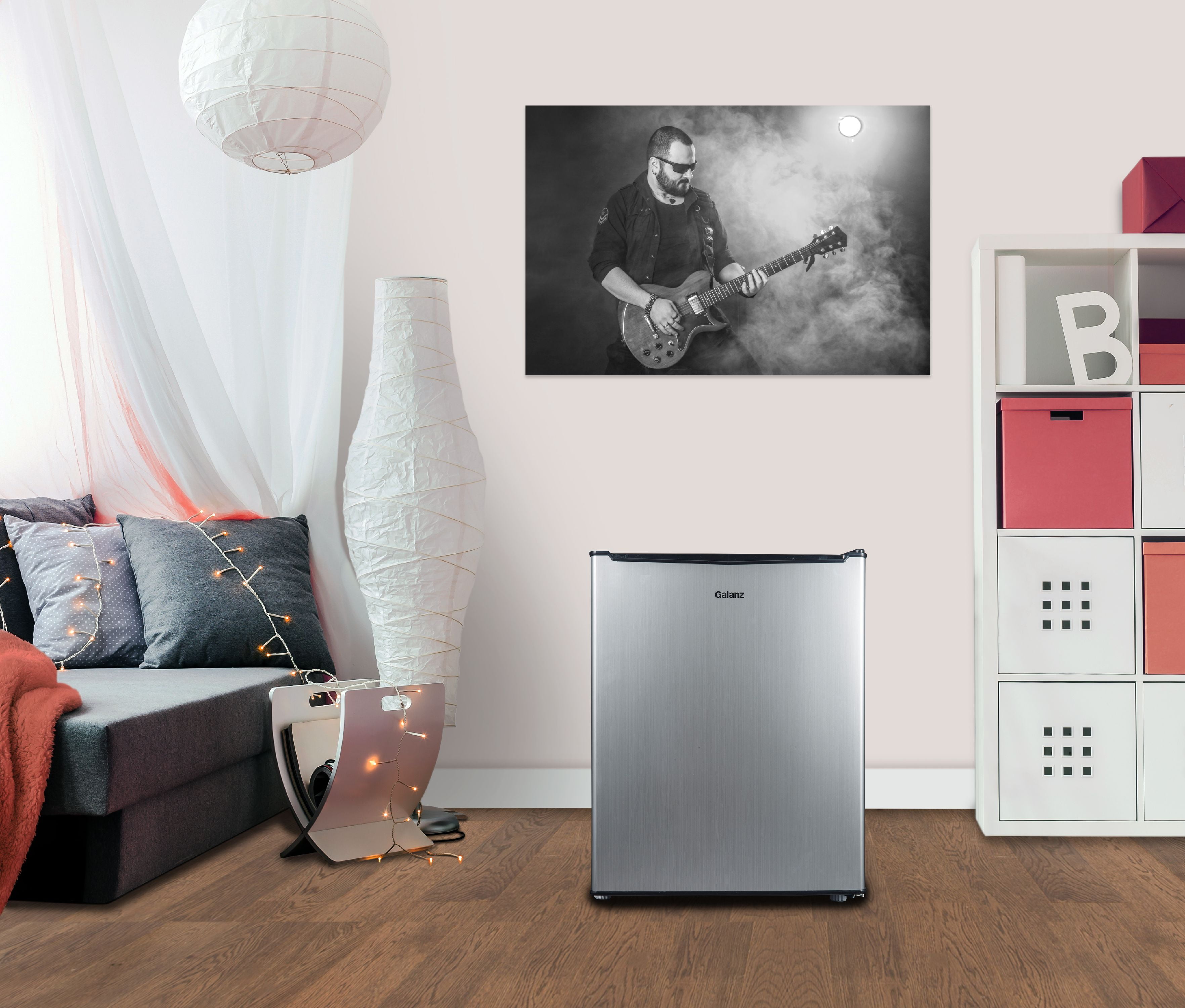 Galanz 2.7 Cu ft One Door Mini Fridge, Stainless Steel Look, New, Width 19.1″