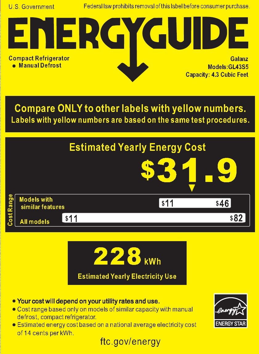 Galanz Single Door Mini Fridge 4.3 cu ft capacity Color: stainless steel look Product dimensions: 19.92″ W x 22.01″ D x 32.91″ H Adjustable mechanical thermostat control Full width chiller compartment 2 liter bottle door storage, 8 can dispenser 2 full slide out glass shelves, 1 crisper glass cover Reversible door, 2 adjustable leveling front legs Condition: New Stock Number: GL43S5