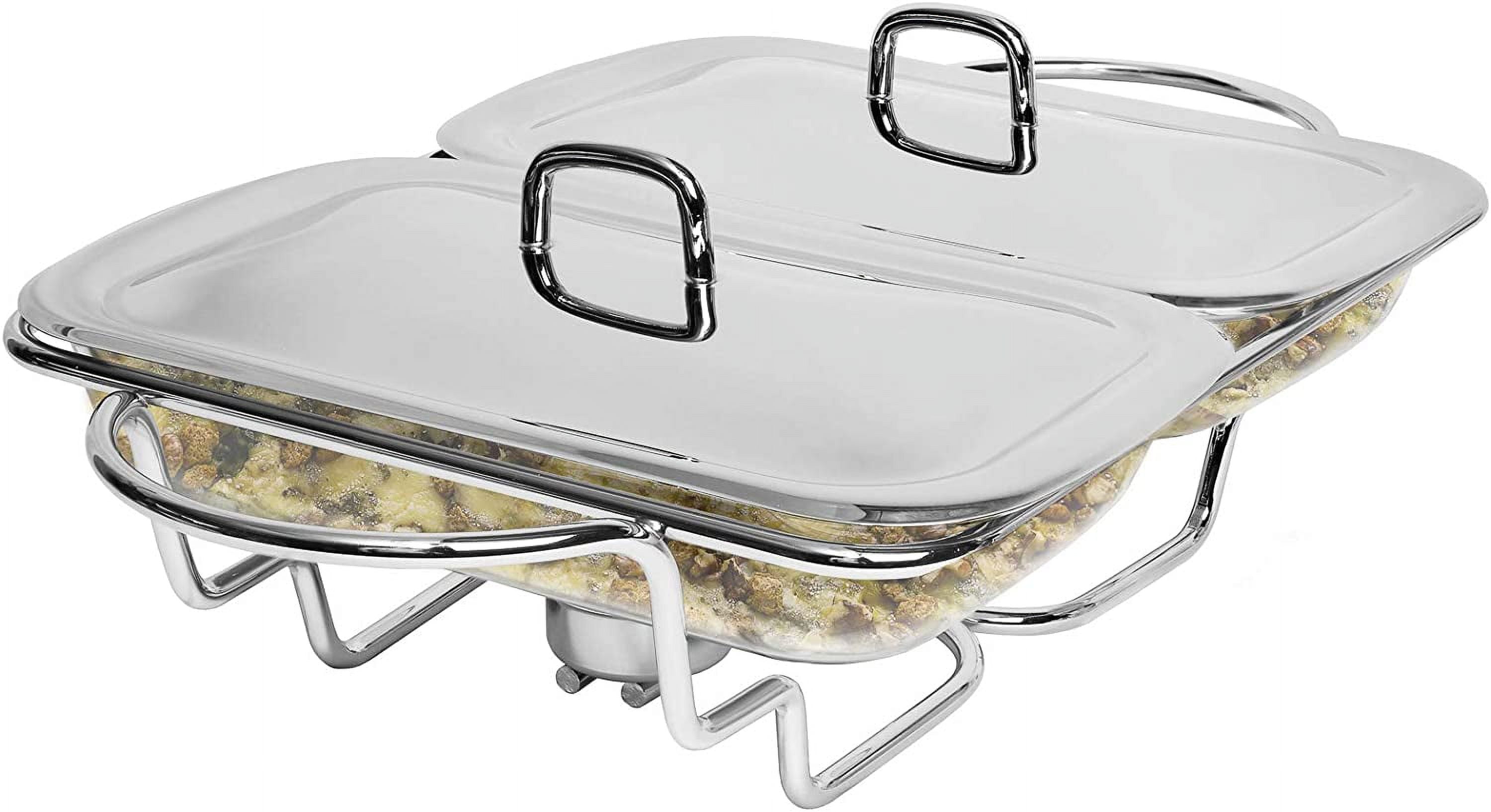 Upgrade your entertaining with the Galashield Chafing Dish Buffet Set, designed to keep your dishes warm and ready to serve. Featuring two European-made glass dishes, each with a 1.5-quart capacity, this set is perfect for serving a variety of hot foods. The glass dishes are oven safe up to 500°F and microwave-safe, allowing for easy reheating and serving flexibility. This set includes stainless steel lids and a stylish chrome-plated frame, adding a touch of elegance to your buffet setup. Two tea light candles (included) ensure your food stays warm throughout the event, making it ideal for parties, family gatherings, or special occasions. The glass dishes are dishwasher-safe for easy cleanup, making hosting stress-free. With dimensions of 20″ L x 12″ W x 5″ H and glass trays measuring 12″ L x 7″ W x 2″ H, this buffet set is as practical as it is stylish, ensuring your food stays warm and beautifully presented.