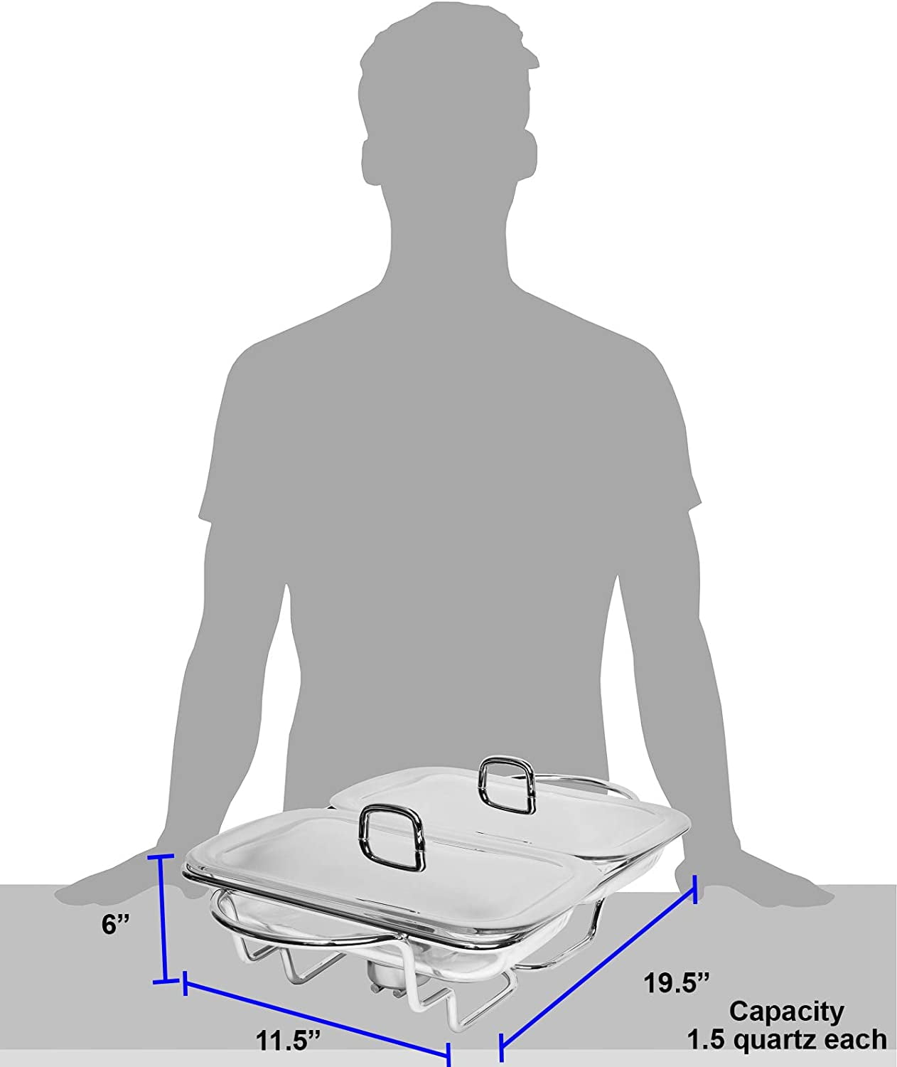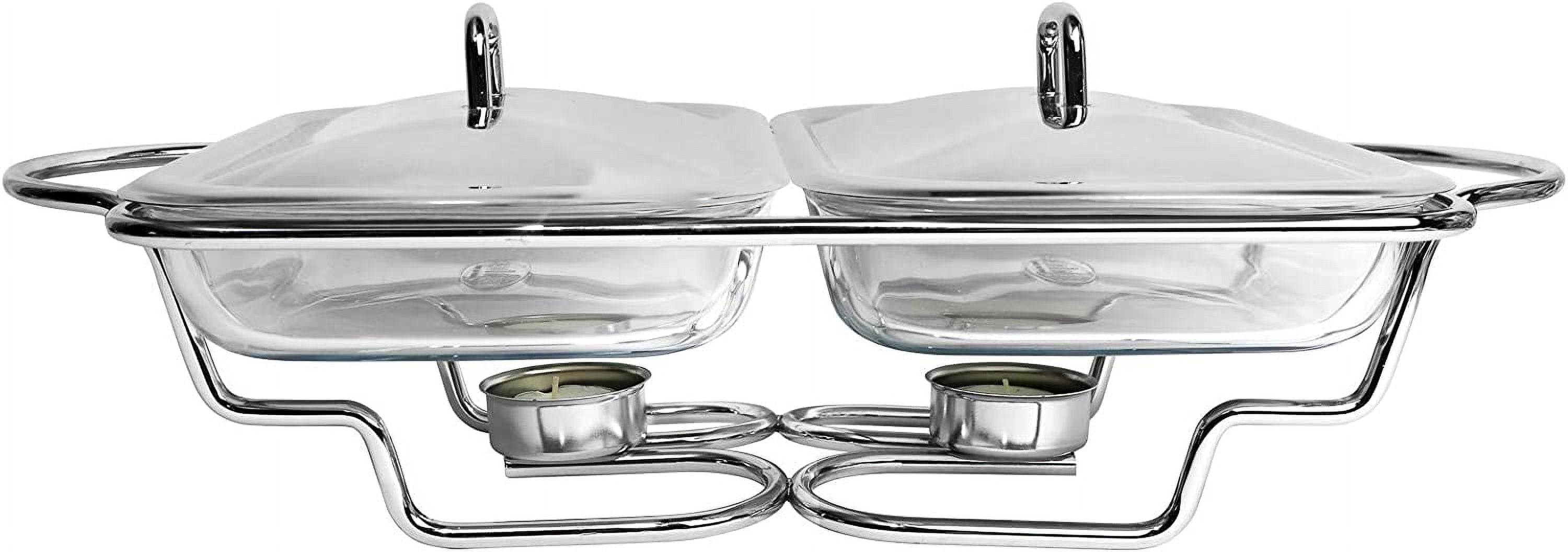 Microwave and oven heat-resistant European made 2 glass dishes – Oven safe to 500 degrees Fahrenheit. Stainless Steel lids, Chrome-Plated frame. Keeps food warm with tea light candles (2 tea light included). 2 x 1.5 quart glass dishes (dishwasher safe). Dimensions: 20″ L x 12″ W x 5″ H. Glass tray dimensions: 12″ L x 7″ W x 2″ H.