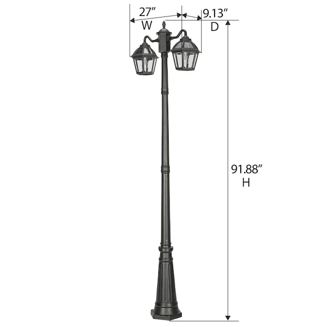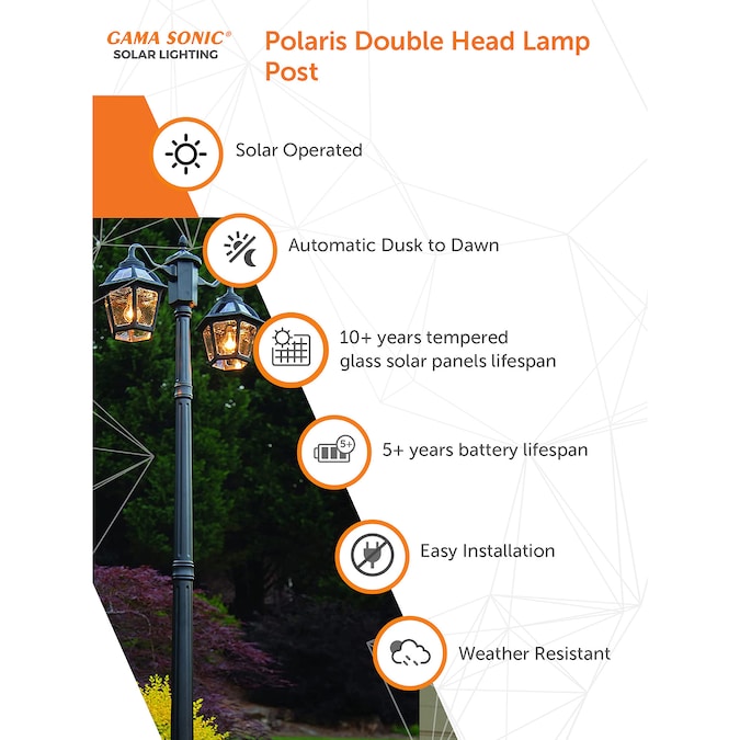 The Gama Sonic Polaris solar is a double headed solar lamp post that features a modern look with an urban industrial twist. The Polaris series was specially designed for coastal environment; its rigid resin finish is engineered with a high UV protection to withstand sun rays without fading. Installation takes minutes and comes with all necessary hardware needed for mounting this 92 inch tall lamp post. Stylish and easy to install, this solar powered lamp post is the perfect energy and money saving replacement for electric or gas-powered outdoor lighting. Constructed of weather-resistant, rust resistant cast aluminum and rigid resin with a black finish, the Polaris solar lamp post incorporates our cutting-edge GS solar LED light bulb and Morph technology. Since the light fixture morphs into a solar panel, it can harness more power from the sun allowing for a longer duration and brighter light. At dusk, this solar lamp provides a total brightness of 260 lumens in a warm white (2700K) color temperature for up to 12 hours on a full charge. No wiring is required. Just place this solar light in a spot with ample direct sunshine and let the sun do the rest.