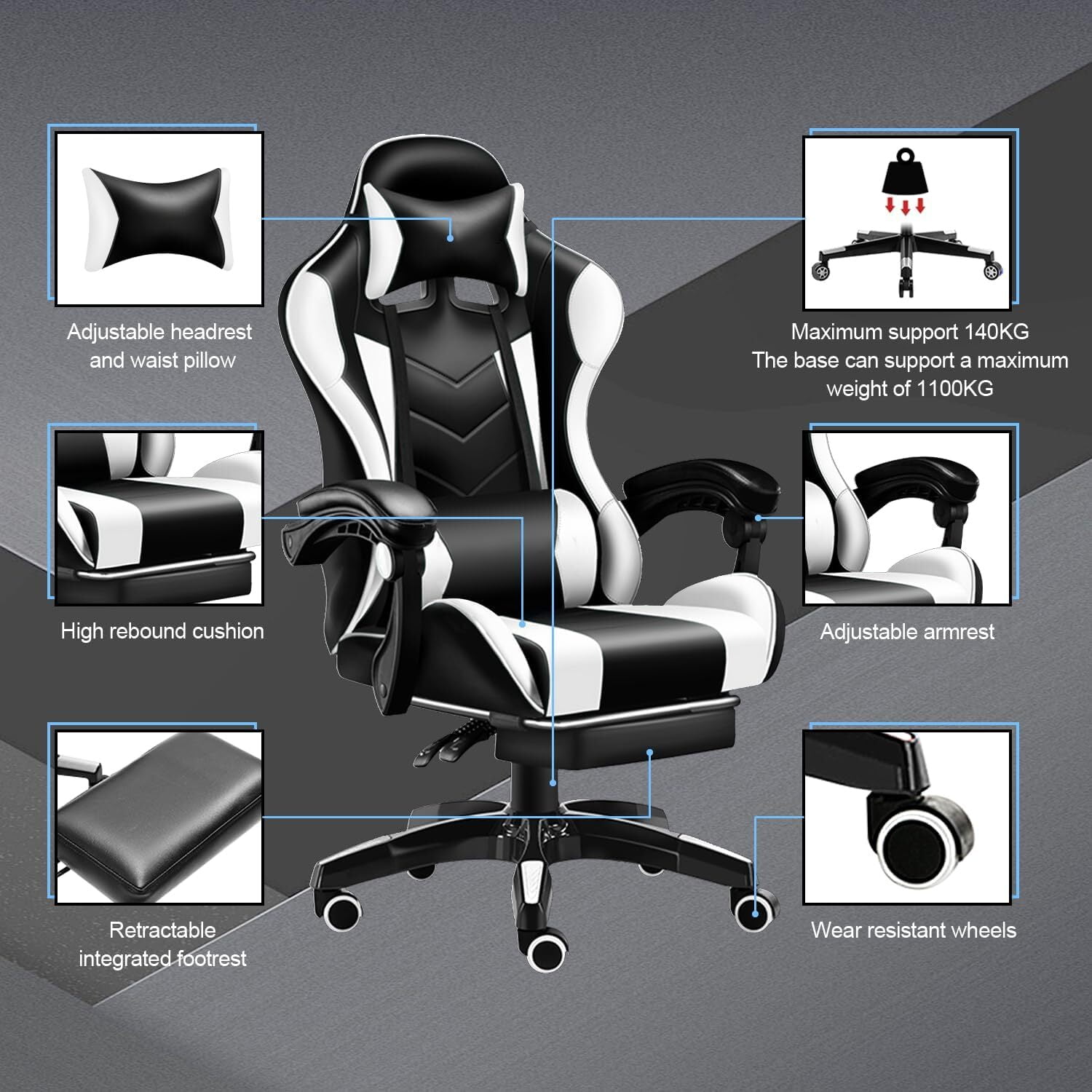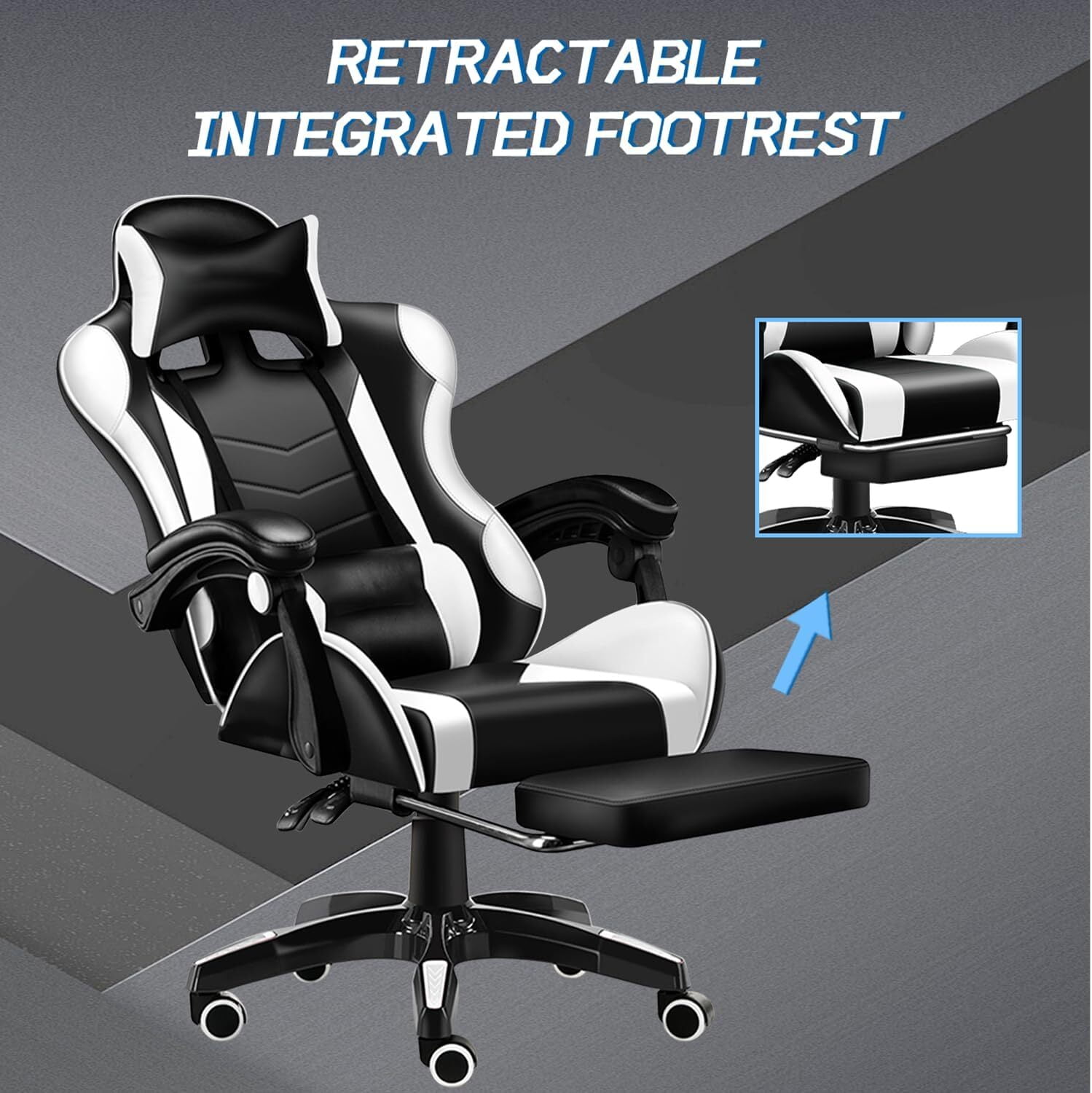Gaming Chair with Adjustable Footrest, Eighteentek High Back Office Chair with Lumbar Support & Adjustable Headrest Video Game Chairs for Adults Black & White