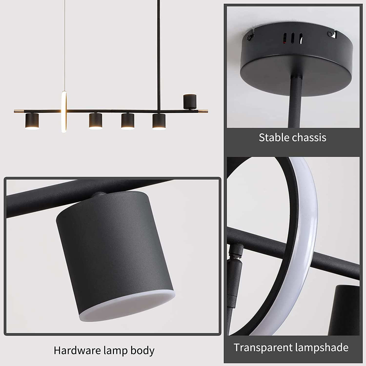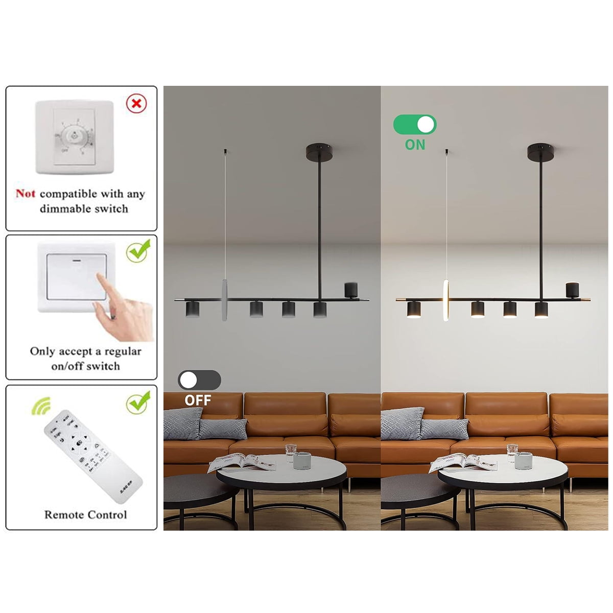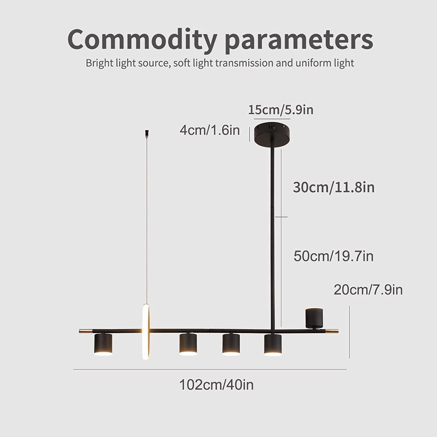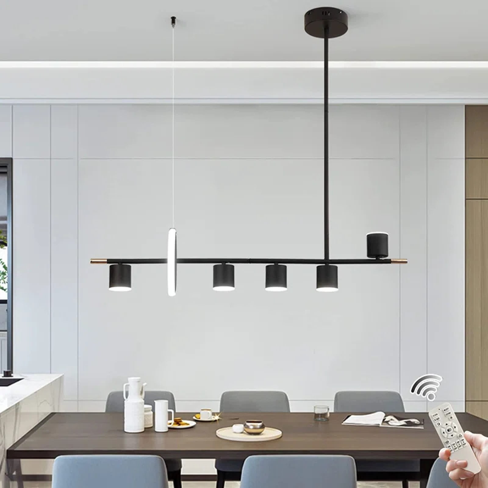 Brand: Ganeed Style: Modern Black Fixture Length: 40”/102 cm Black Fixture Width: 7.9”/20 cm Black Fixture Height: 37.4”/95 cm Hanging Tube length: 80 cm/31.5” (divided into 2 sections). Hanging wire (80 cm/31.5”) can be adjusted. Max Watt: 40W Lumen: 3200lm Voltage: 110V Color temperature: 3000K-6000K dimmable with remote control. Brightness: 10%-100% Control Type: Control Remote and ON/OFF wall button Note:NOT compatible with a dimmer switch. Please use a regular ON/OFF wall buttonswitch or the included remote. Number of light sources: 6 lights (5 Spotlights + 1 Ring) Irradiation area: 10-20㎡ No flicker, no infrared or ultraviolet radiation, protects eyes from harsh and glaring lights. LED lights power is only about 1/3 of the ordinary energy saving lamp under the same brightness. The modern pendant lighting is made of high-quality aluminum, silicone and wrought iron, simple and elegant. All the arms of the dining room chandelier light fixture are pre-wired and pre-threaded for easy installation, and we provide an installation video on the web page. Package Contents: 1 x Assemble Ceiling Light Kit + 1 x Remote Control (Battery not include) + 1 x Parts Package + 1 x User manual