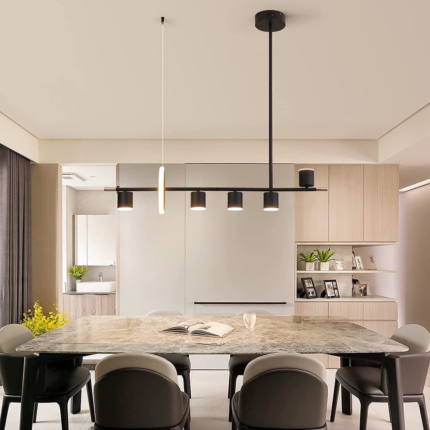 Ganeed Modern Pendant Light, LED Dimmable Hanging Pendant Light Fixture with Spotlights,6-Lights Chandelier Lights Kitchen Island Light for Table Dining Room Bar (Matte Black)