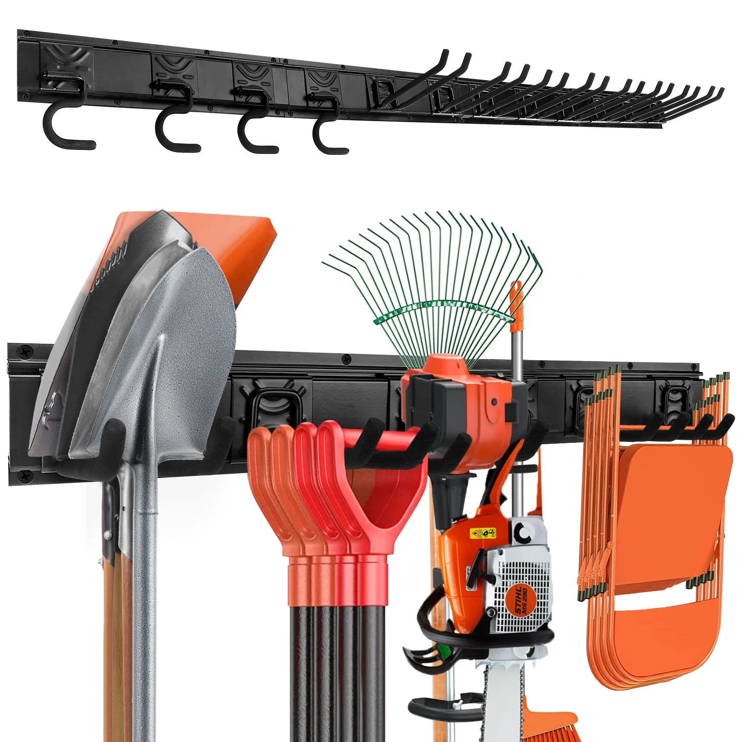 Aluminum panel rack Easy To Install: Fits Standard 16-inch wall stud spacing. Heavy-duty storage hanger hooks can be easily re-positioned anywhere on the tracks of the panel when your storage organization idea needs to change. All these garden tool storage hooks can be disassembled repeatedly, no assembly required, simply install tool organizers to wall. Versatile & Multipurpose: Each of the versatile scoop hooks hangers on the multipurpose garage wall storage tool organizer rack holds both heavier and lightweight items ranging from packed tote bags to spring jackets Great Storage Function: A combination of hooks makes it easy to hang long-handled equipment. Get organized with our best-combo hooks. With twelve Utility hook , scoop hook, tool Hook, twin hook, s hook and 68 inches of organizer channel rack , you can hang anything from lightweight gear like extension cords , fold chairs , brooms , garden hoses, to heavier items like ladders, ski boards, strollers, shovels, power tools, garden tools, golf bags, yard tools, rakes , Hedge Trimmers,