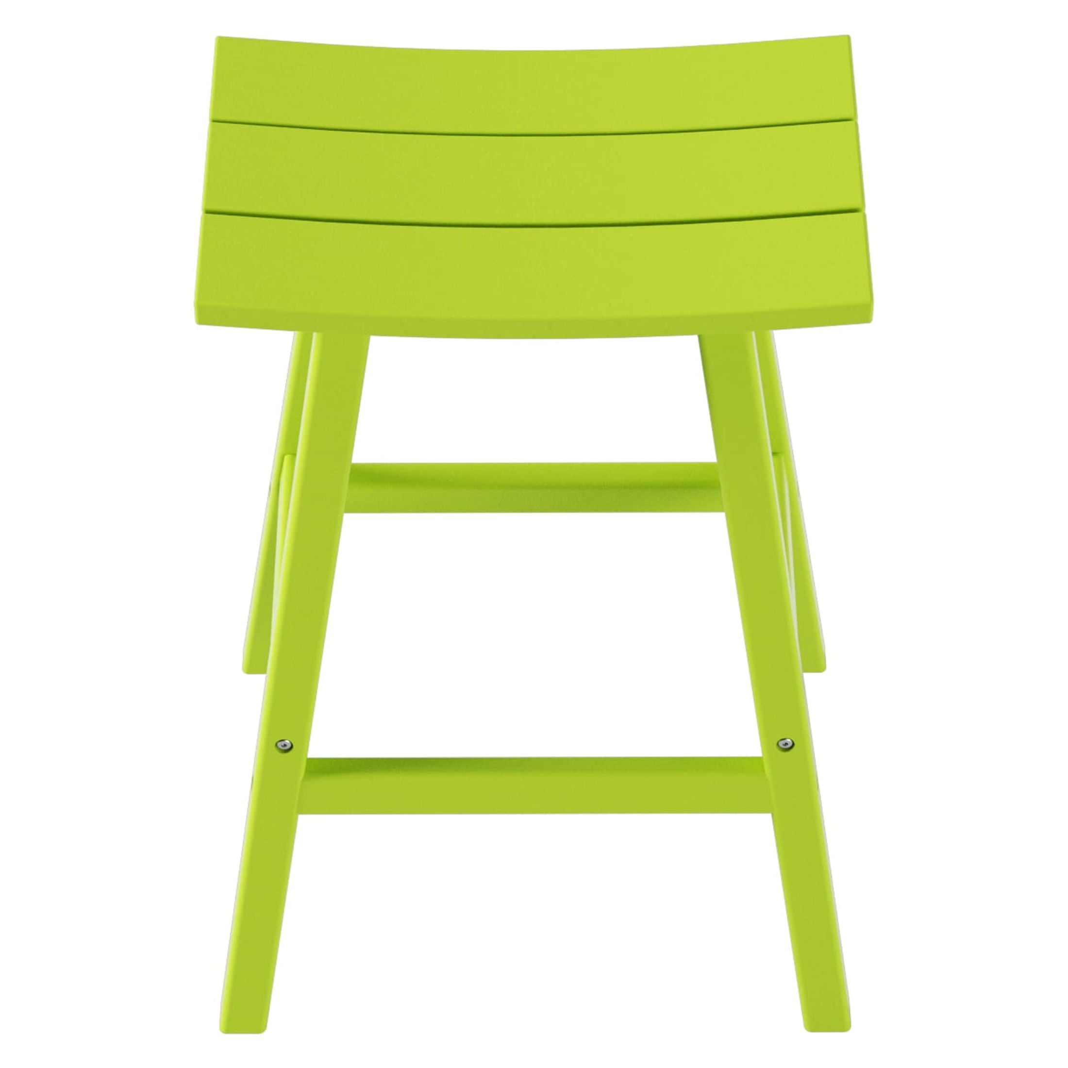 Classic Comfort and style combined into this Lime outdoor plastic Adirondack bar stool. Perfectly crafted saddle seat stool that features solid HDPE poly plastic construction that is made for daily outdoor use. This bar stool is made with UV and Weather resistant materials help keep its vibrant color for many years of use. The outdoor bar stool is a great way to add convenient seating to the kitchen, bar, outdoor patio, and outdoor living area. This set of bar stools is designed to add a classic Adirondack style to your home or outdoor living space. Combines perfectly with other Adirondack style furniture to help complete your outdoor set up in no time. The Stool features a slatted seats that will bring an elegant and comfortable style to any patio bar area. The UV and weather resistant plastic frame material gives them a lasting quality from season to season. UV protected to help keep its true color and weather resistant plastic is rust & rot resistant. Comfortable footrest and wide seating for ultimate comfort. A classic Adirondack Backless Barstools provide stylish comfort that is perfect for your backyard bar or lounge. Available in easy to match color options. Slide them up to a Patio bar or use at a kitchen countertop.