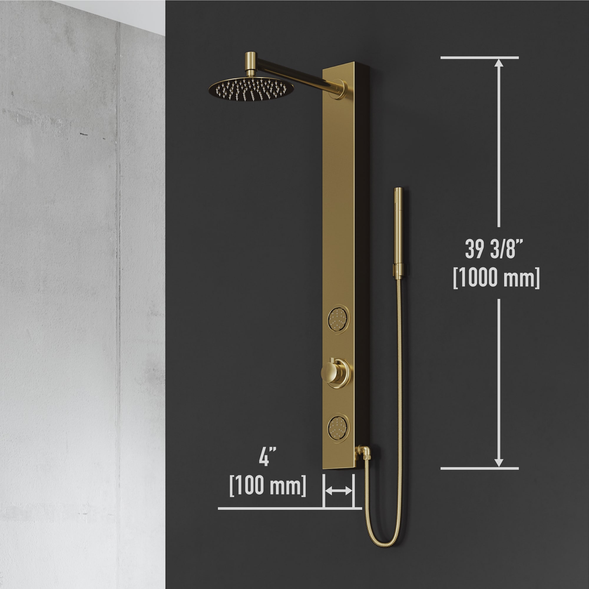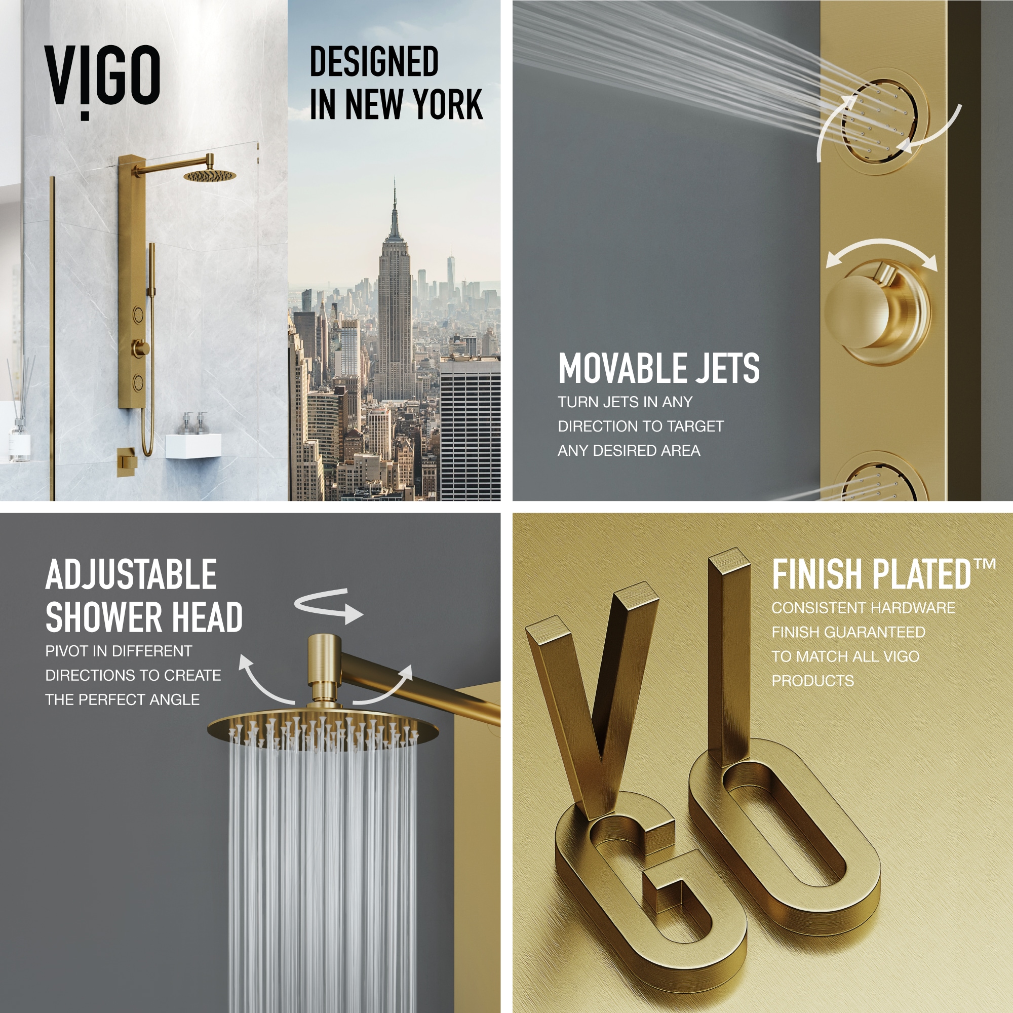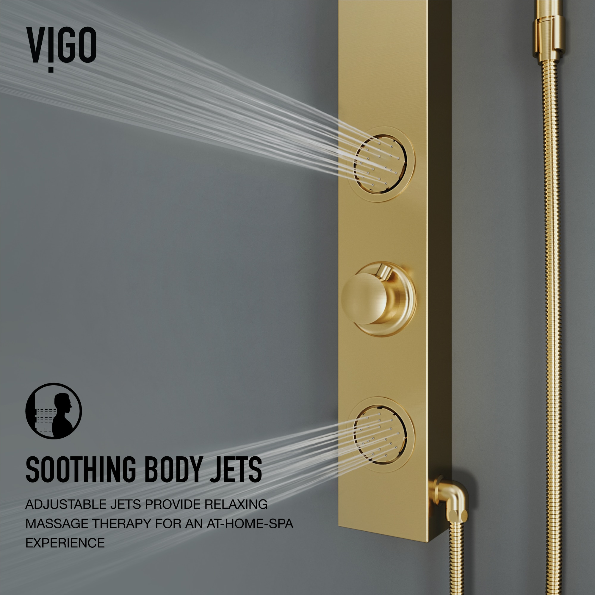 VIGO presents the Gardenia Retro-Fit Shower Panel- an elegant matte brushed gold shower system designed for the ultimate spa experience. Gardenia has a round rain showerhead and a hand shower with a stainless steel plated hose. It comes complete with two fully adjustable body spray massage jets and a hand shower for added convenience. A 3-way diverter valve works to deliver three separate shower settings for the shower head, jets and hand shower. The Retro-fit design allows you to continue using your existing shower controls for on/off and temperature adjustments. You can now upgrade your shower system without the hassle of remodeling. Bring superior functionality and elegance into your bathroom with The Gardenia Retro-Fit Shower Panel by VIGO.