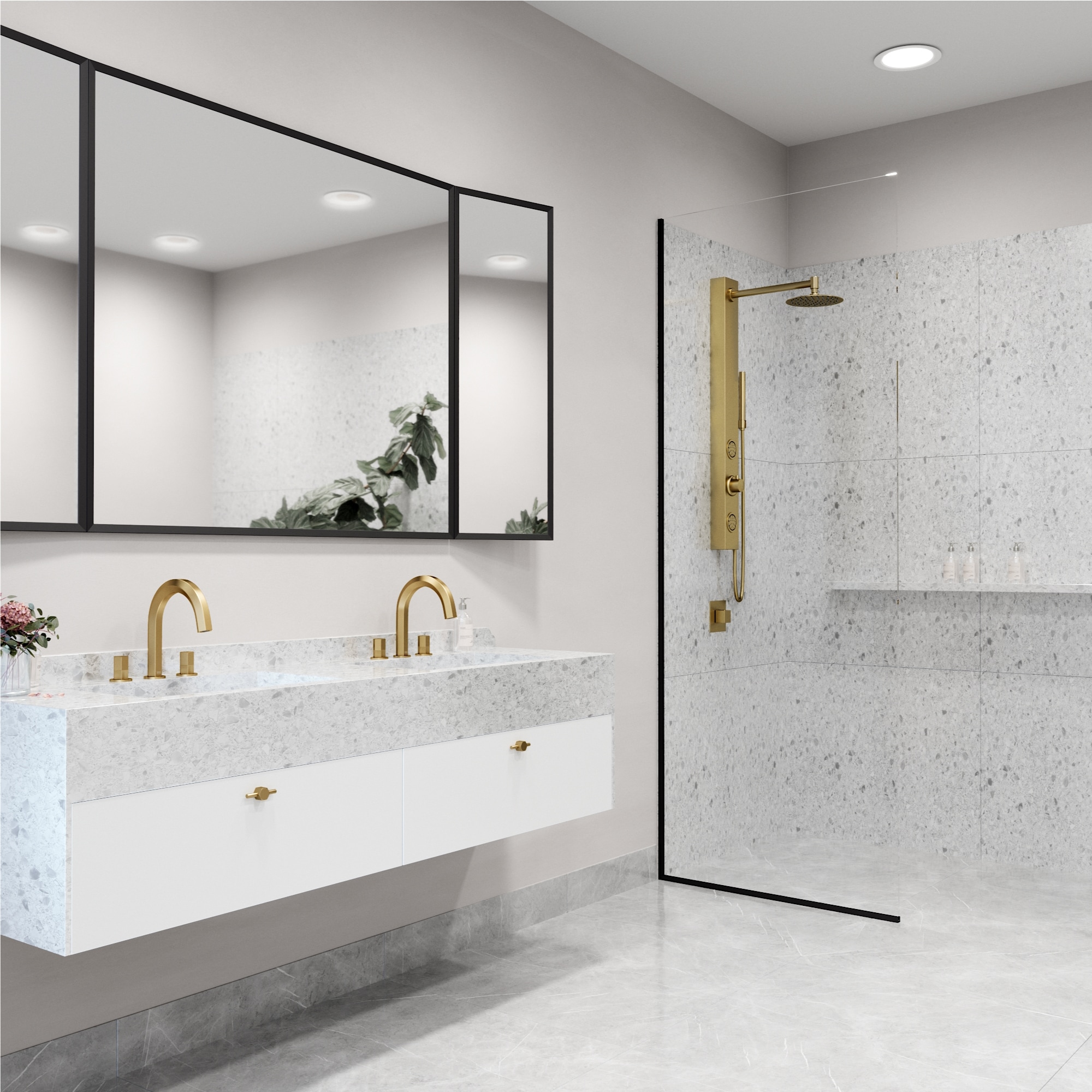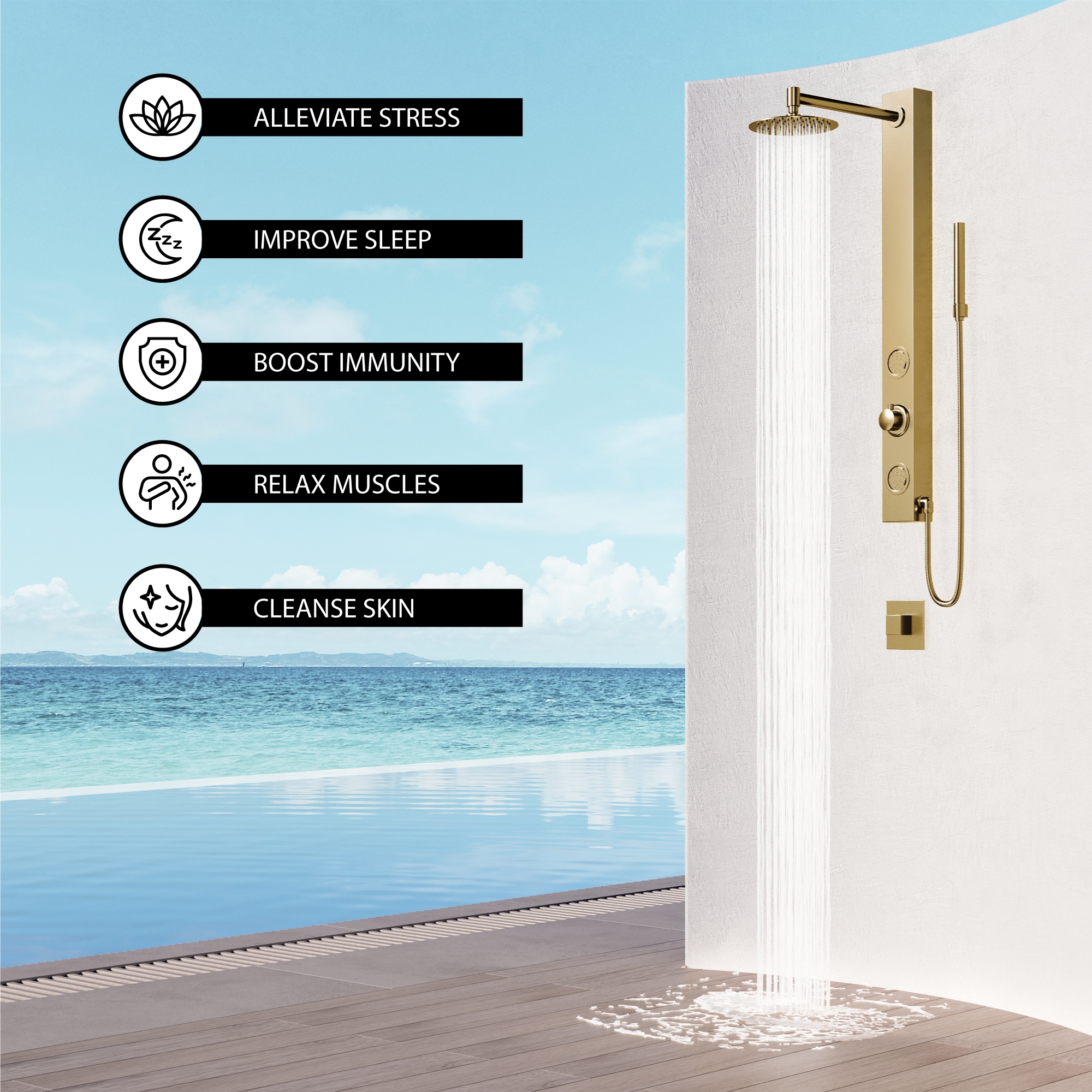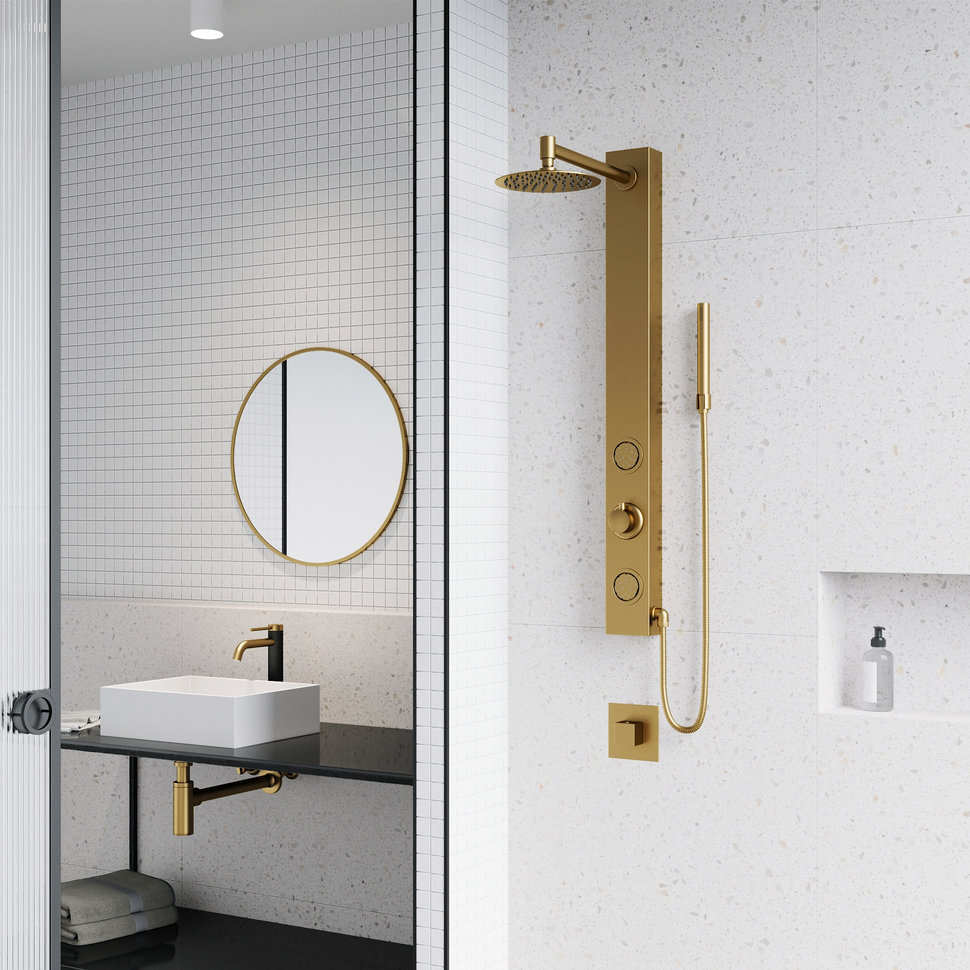VIGO presents the Gardenia Retro-Fit Shower Panel- an elegant matte brushed gold shower system designed for the ultimate spa experience. Gardenia has a round rain showerhead and a hand shower with a stainless steel plated hose. It comes complete with two fully adjustable body spray massage jets and a hand shower for added convenience. A 3-way diverter valve works to deliver three separate shower settings for the shower head, jets and hand shower. The Retro-fit design allows you to continue using your existing shower controls for on/off and temperature adjustments. You can now upgrade your shower system without the hassle of remodeling. Bring superior functionality and elegance into your bathroom with The Gardenia Retro-Fit Shower Panel by VIGO.