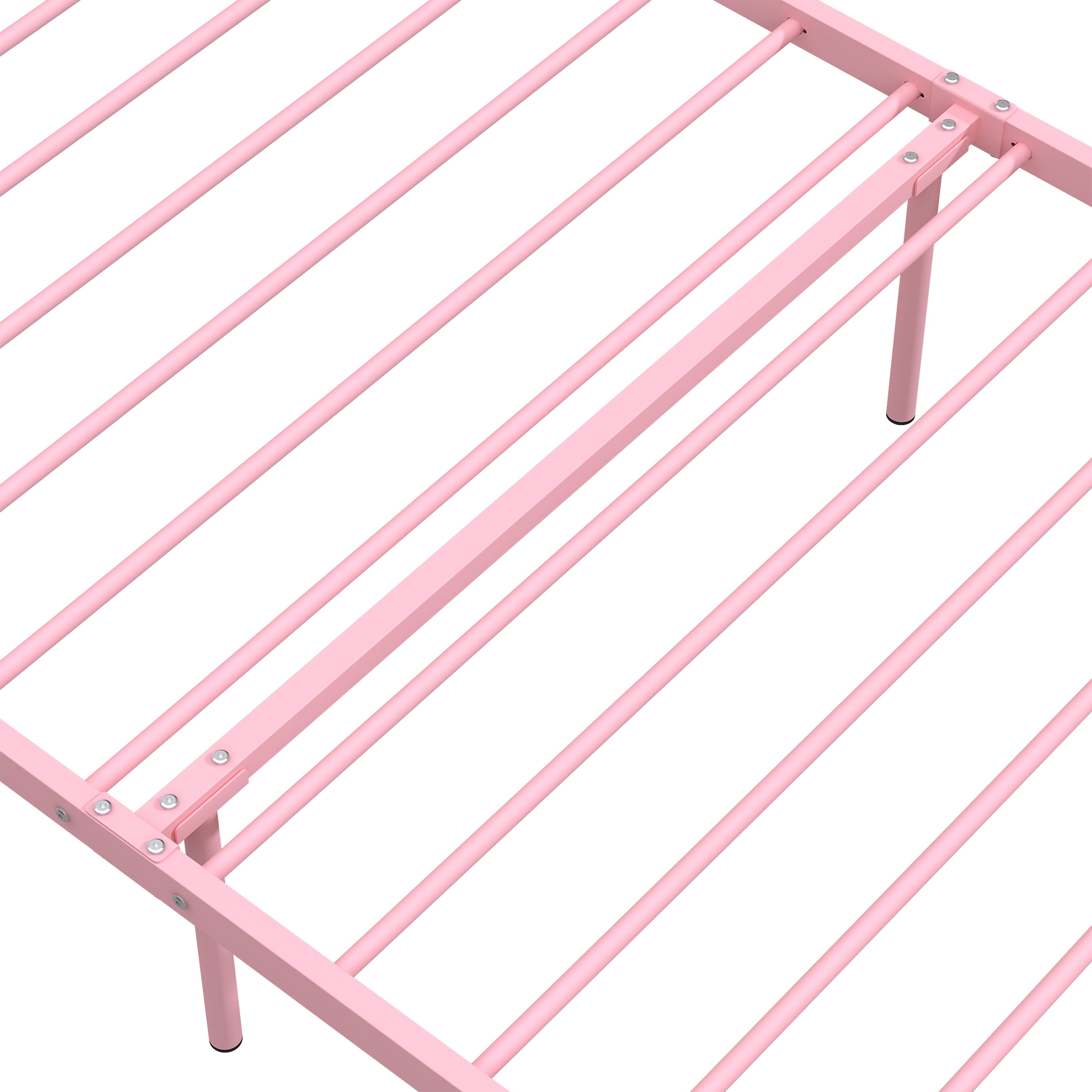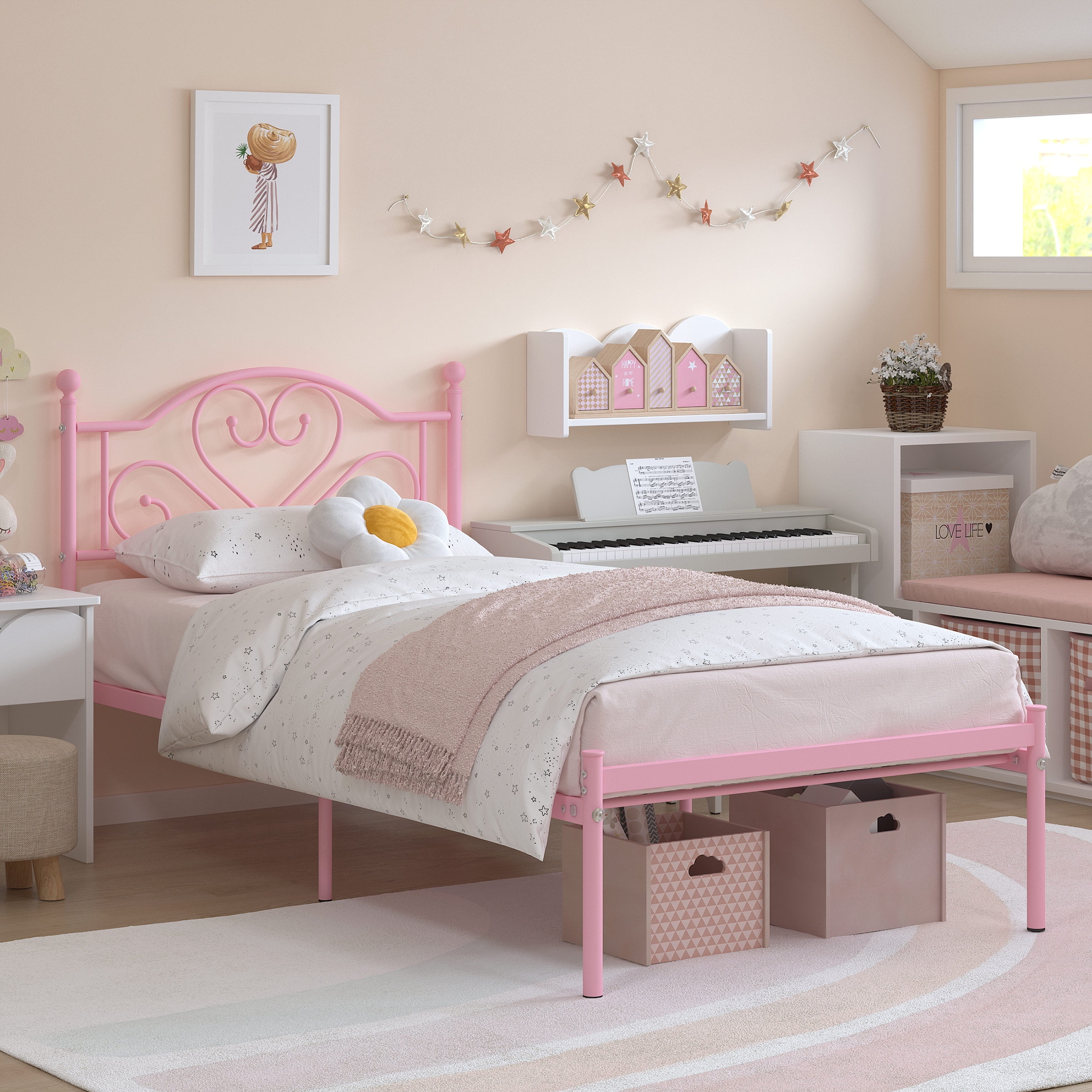 【Love Heart Headboard Bed for Girls】The headboard is designed with smooth curved lines and vintage orbs, creating an atmosphere of ultimate luxury and elegance, especially the “love heart” pattern on the headboard exudes a charming and romantic atmosphere, perfect for a girl’s bedroom, adding a touch of sophistication and beauty to it. 【Strong Structure】Reliable frame features 16 metal slats and 6 legs between two sides which provides you with strong support for a relaxing sleep, capable of holding weights of up to 400lbs. 【Floor Protection】The powder-coated surface features rust and scratch resistance for long term use. The raised headboard protects your head and provides you with a comfortable sitting position. Anti-skid padding protect floor from scratches and damage. Besides, not shaky after proper assembly and carpeted. With 11.2 inches of space from the floor to the bottom of the bed frame, not only is it easy to get in and out of bed, but it also provides the perfect opportunity to store items such as clothes, toys, or quilts, keeping the room organized and clutter-free, perfect for sleepers of all ages. The reliable, closely spaced slats of this metal bed frame eliminate the need for a box spring, providing optimal support for your mattress, saving you space and money, and allowing you to experience convenience and modernity. (Mattress are not included) Our bed frame comes with easy-to-follow instructions and all the necessary hardware to make installation a breeze. Simple design combined with practical use, our twin metal frame bed is perfect for Chi’s Rooms; Teenager’s Rooms; Bedrooms; Guest Rooms or Apartments. Besides, it can also be used as a Wedding Gift; Moving Gift; Birthday Gift. Size: Twin Color: Pink Material: Metal Box Spring: No Need Product Size: 77.1″ x 39″ x 38.1″ (L x W x H) Product Weight: 29.97lbs Package Size: 40.16″ x 16.54″ x 3.07″ (L x W x H) Package Weight: 31.97lbs Capacity: 600lbs 1 x Twin Bed frame 1 x Instruction for installation 1 x Poly bag 1 x Screw set 1 x Components