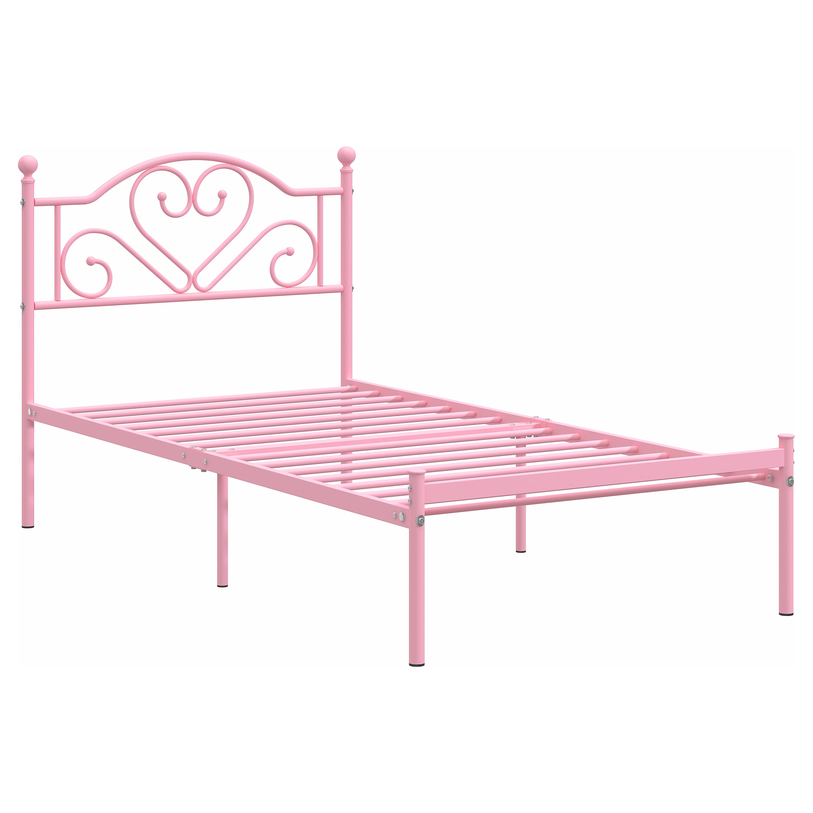 Bring charming style to your room with this simple twin bed. The unique arched “Love Heart” headboard design adds a beautiful decorative detail to the bed frame. Constructed from a sturdy and durable metal frame, this bed features multiple sturdy support legs that provide optimal stability and can support up to 250lbs. The powder-coated finish provides long-lasting protection against rust, and there is ample storage space under the bed for easy organization to keep your room clean and tidy. Whether in the master bedroom or guest bedroom, this bed is a great choice for creating a classic ensemble. Perfect for kis’ rooms, guest rooms, dorm rooms, apartments and more.