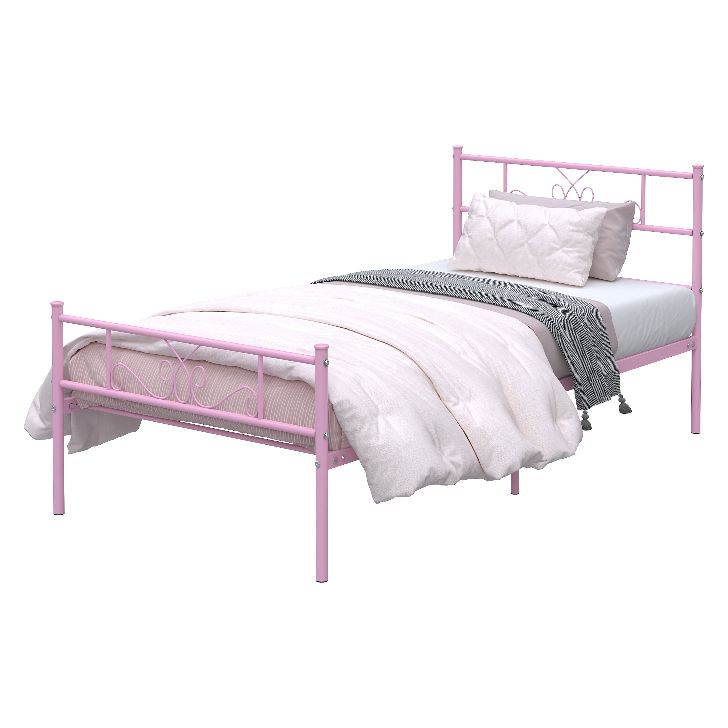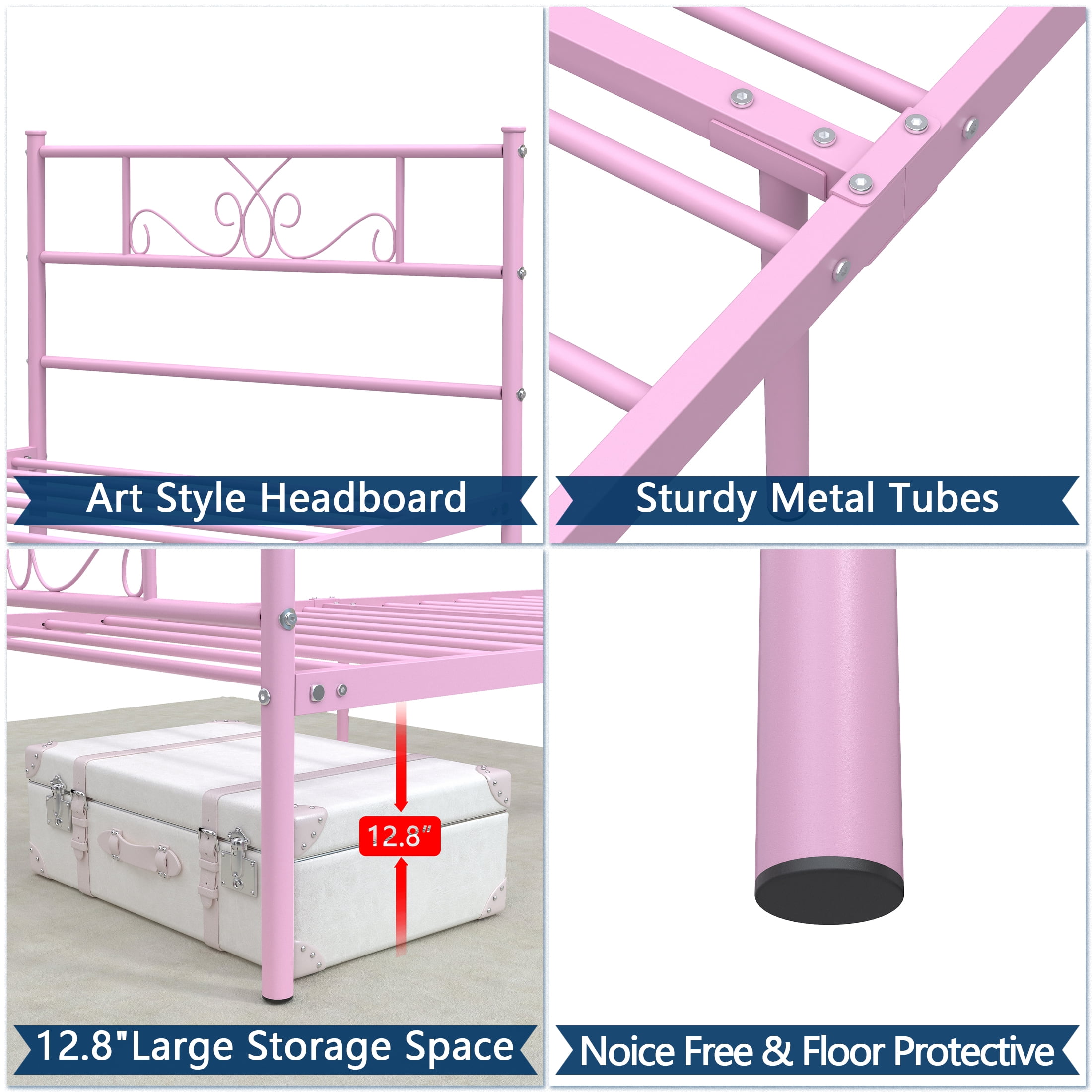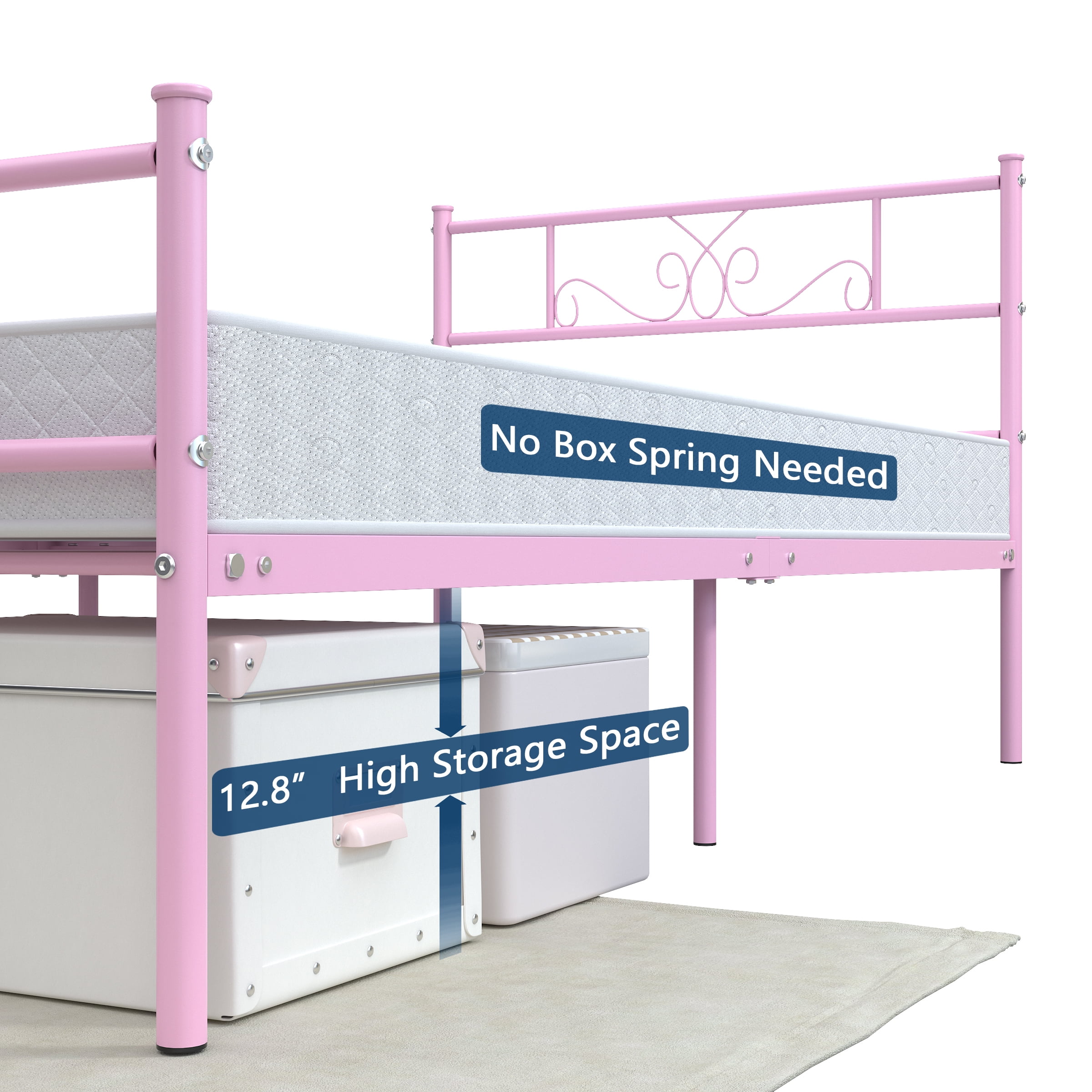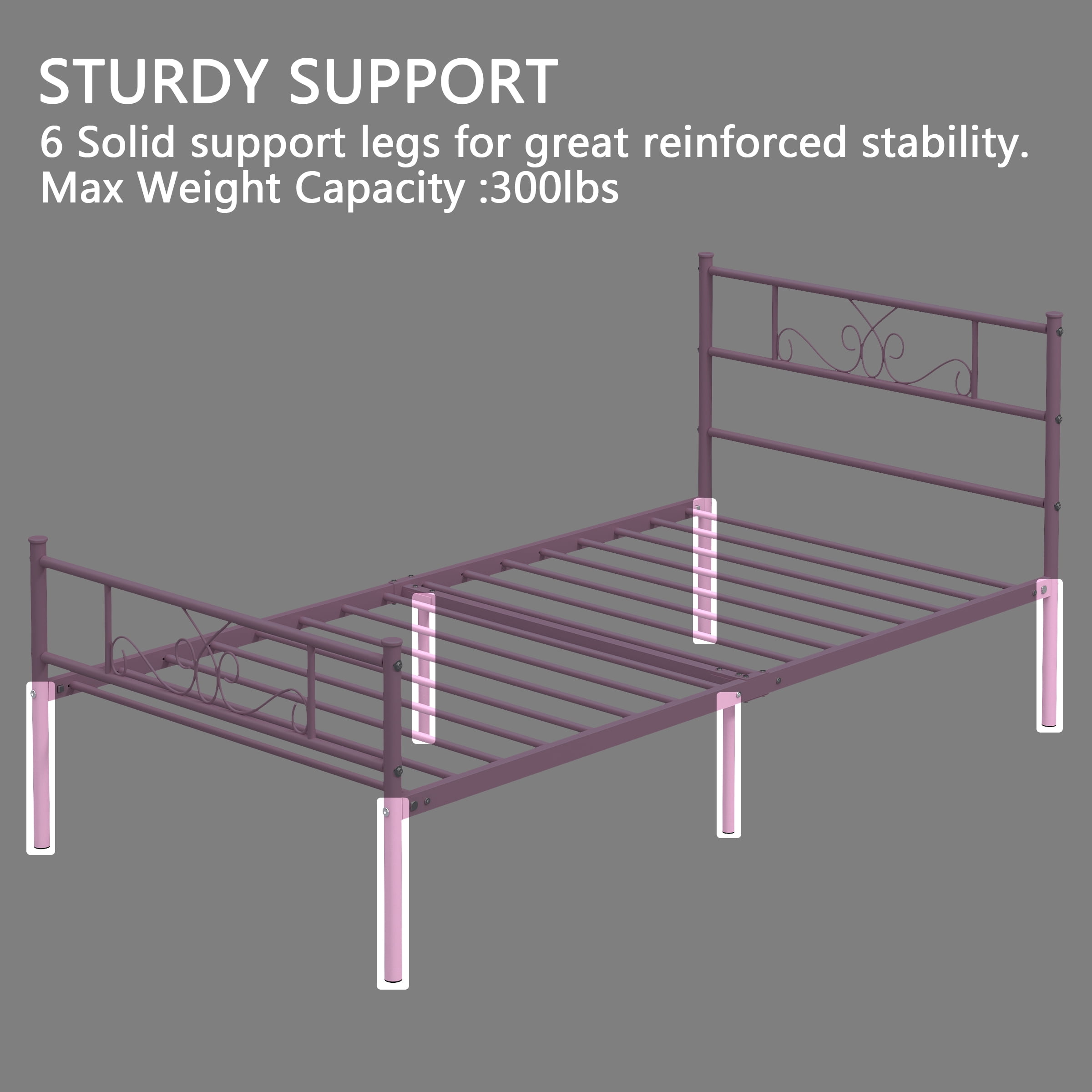 【Elegant Scroll Design 】- This twin bed has a beautifully crafted headboard and footboard with an elegant scrollwork pattern that makes a statement in any bedroom space. It blends easily with modern, traditional, farmhouse and country home decor styles. 【Sturdy Support】- This durable twin bed base is made of 16 heavy-duty metal slats and 6 premium metal support legs that provide superb support for your mattress and can hold up to 800 lbs. for a comfortable night’s sleep. 【Unique Romantic Pink Finish】- The entire bed frame has a unique romantic pink finish that has been specifically designed out for warm bedrooms. Whether you are looking for a modern or classic style, this bed frame blends in perfectly with its surroundings. 【Noise-Free】- The reinforced leg structure and integrated design make the whole bed frame more stable, noiseless and non-shaking, creating a quiet sleeping environment for you. Provides you with a quiet sleeping environment, away from any annoying squeaks or disturbances. 【Ample 12.8” underbed storage】- This twin platform bed offers 12.8 inches of underbed space, providing ample storage for clothing, toys and more. Ideal for guest rooms, bedrooms, dormitories, apartments and temporary lodging. 【Easy Assembly】- All parts are labeled, and tools are included, making it easy to assemble with the provided instructions. 【Perfect Ideal Bedroom Gift】- This bed frame is the perfect holiday gift and a great new home bedroom gift or holiday gift for teens, boys and girls. Hurry to add a warm and cozy bed frame to your bedroom!