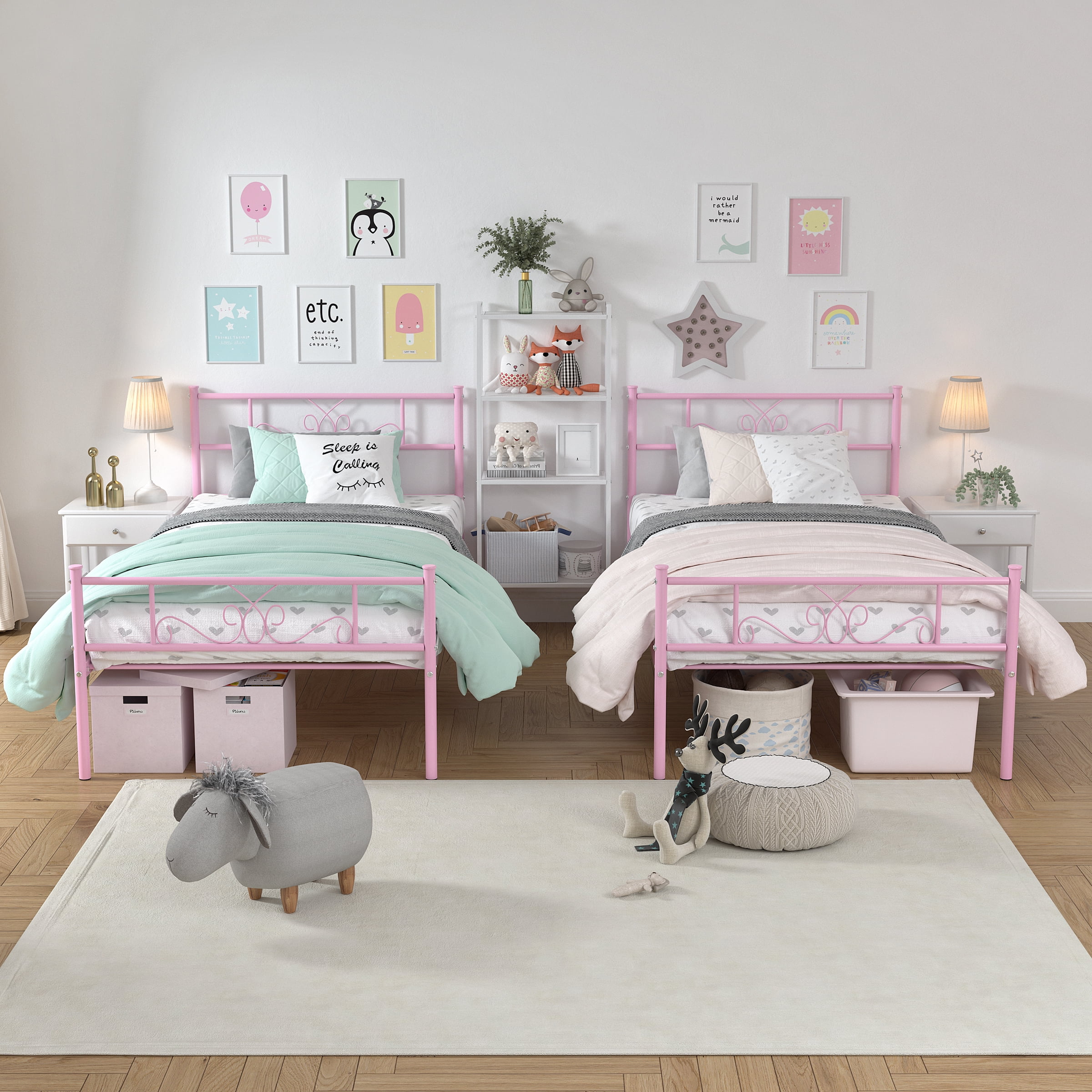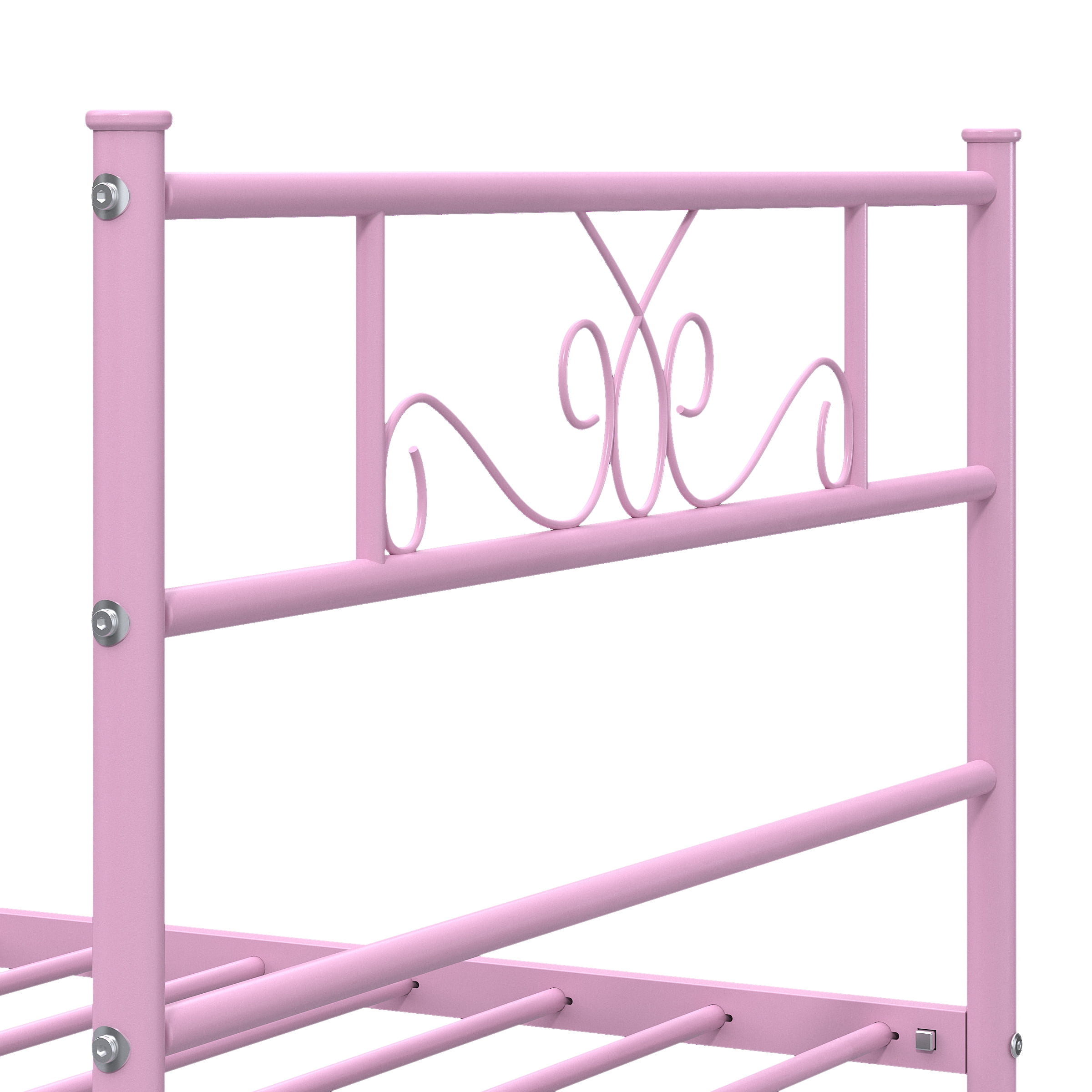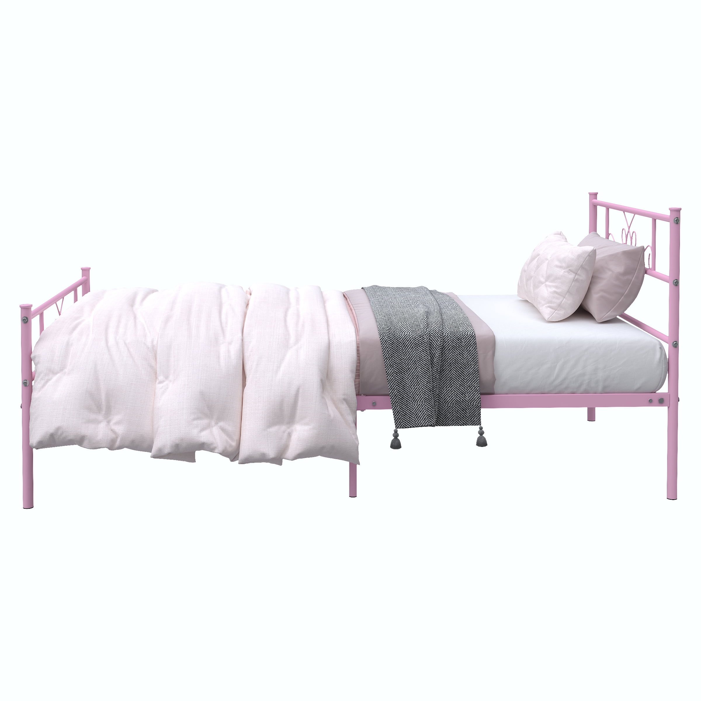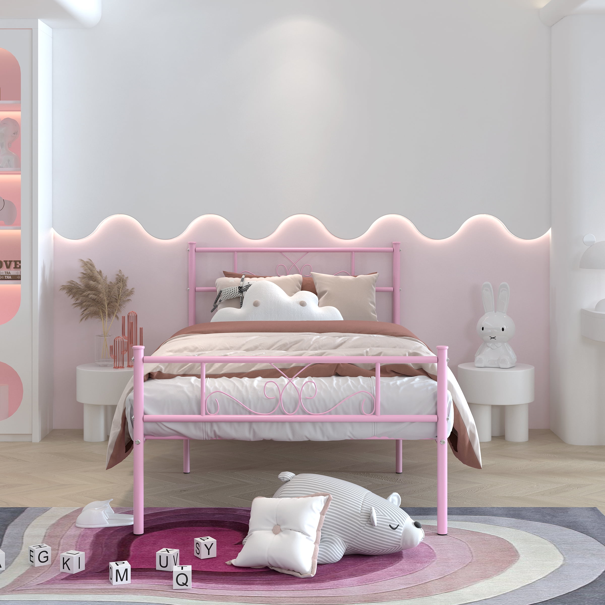 【Elegant Scroll Design 】- This twin bed has a beautifully crafted headboard and footboard with an elegant scrollwork pattern that makes a statement in any bedroom space. It blends easily with modern, traditional, farmhouse and country home decor styles. 【Sturdy Support】- This durable twin bed base is made of 16 heavy-duty metal slats and 6 premium metal support legs that provide superb support for your mattress and can hold up to 800 lbs. for a comfortable night’s sleep. 【Unique Romantic Pink Finish】- The entire bed frame has a unique romantic pink finish that has been specifically designed out for warm bedrooms. Whether you are looking for a modern or classic style, this bed frame blends in perfectly with its surroundings. 【Noise-Free】- The reinforced leg structure and integrated design make the whole bed frame more stable, noiseless and non-shaking, creating a quiet sleeping environment for you. Provides you with a quiet sleeping environment, away from any annoying squeaks or disturbances. 【Ample 12.8” underbed storage】- This twin platform bed offers 12.8 inches of underbed space, providing ample storage for clothing, toys and more. Ideal for guest rooms, bedrooms, dormitories, apartments and temporary lodging. 【Easy Assembly】- All parts are labeled, and tools are included, making it easy to assemble with the provided instructions. 【Perfect Ideal Bedroom Gift】- This bed frame is the perfect holiday gift and a great new home bedroom gift or holiday gift for teens, boys and girls. Hurry to add a warm and cozy bed frame to your bedroom!