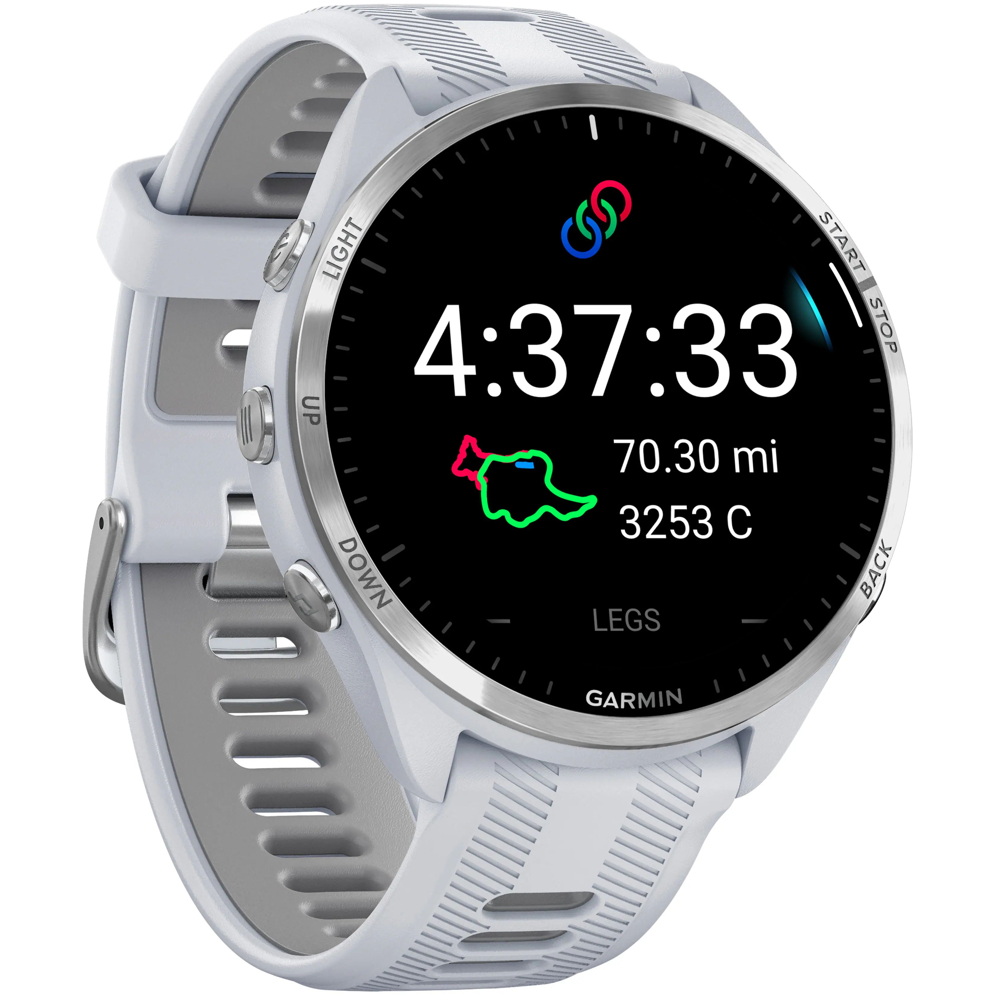 Train brilliantly with Forerunner 965, the premium GPS running and triathlon smartwatch with a bright AMOLED touchscreen display and lightweight titanium bezel. Wake up to your morning report with HRV status to see health insights with an overview of sleep, recovery and training outlook (data presented is intended to be a close estimation of metrics tracked). The training readiness feature tells you when you’re primed for a productive session — while daily suggested workouts adapt to performance and recovery alongside the race widget, which provides training tips, course details and completion time predictions. Navigate any route confidently with multi-band GPS and full-color, built-in maps. With traditional buttons and a touchscreen display, it’s easy to tap into your training status and know whether you’re training productively, peaking or strained. If you’re pushing to outshine the competition, the Forerunner 965 is there to light up every run with up to 23 days of battery life in smartwatch mode.