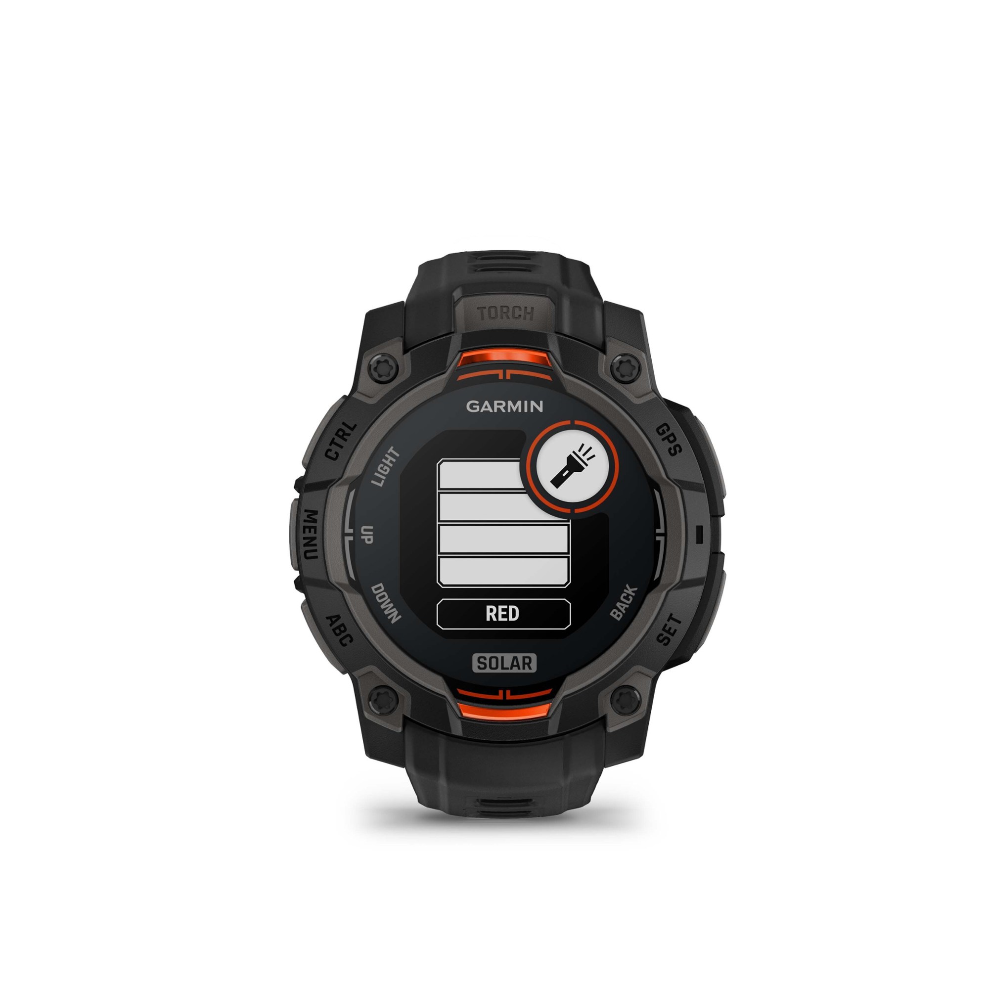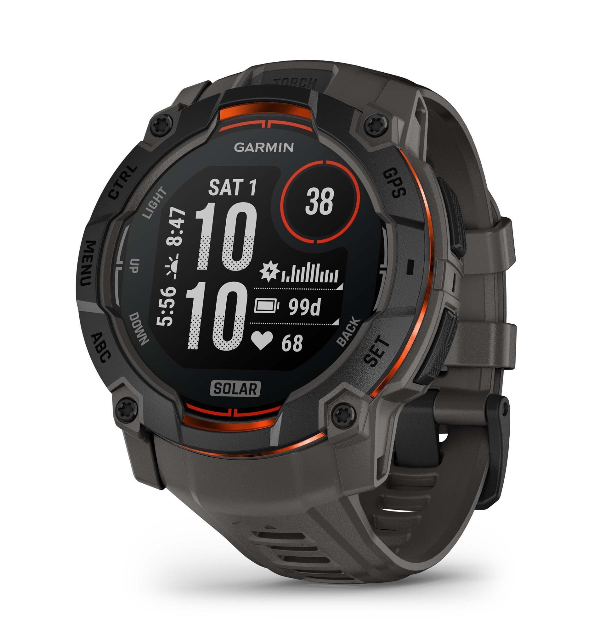 - Make a bold statement with the rugged Garmin Instinct 3 Solar. It features a metal-reinforced bezel, scratch-resistant lens and built-in flashlight, plus solar charging for endless battery life.