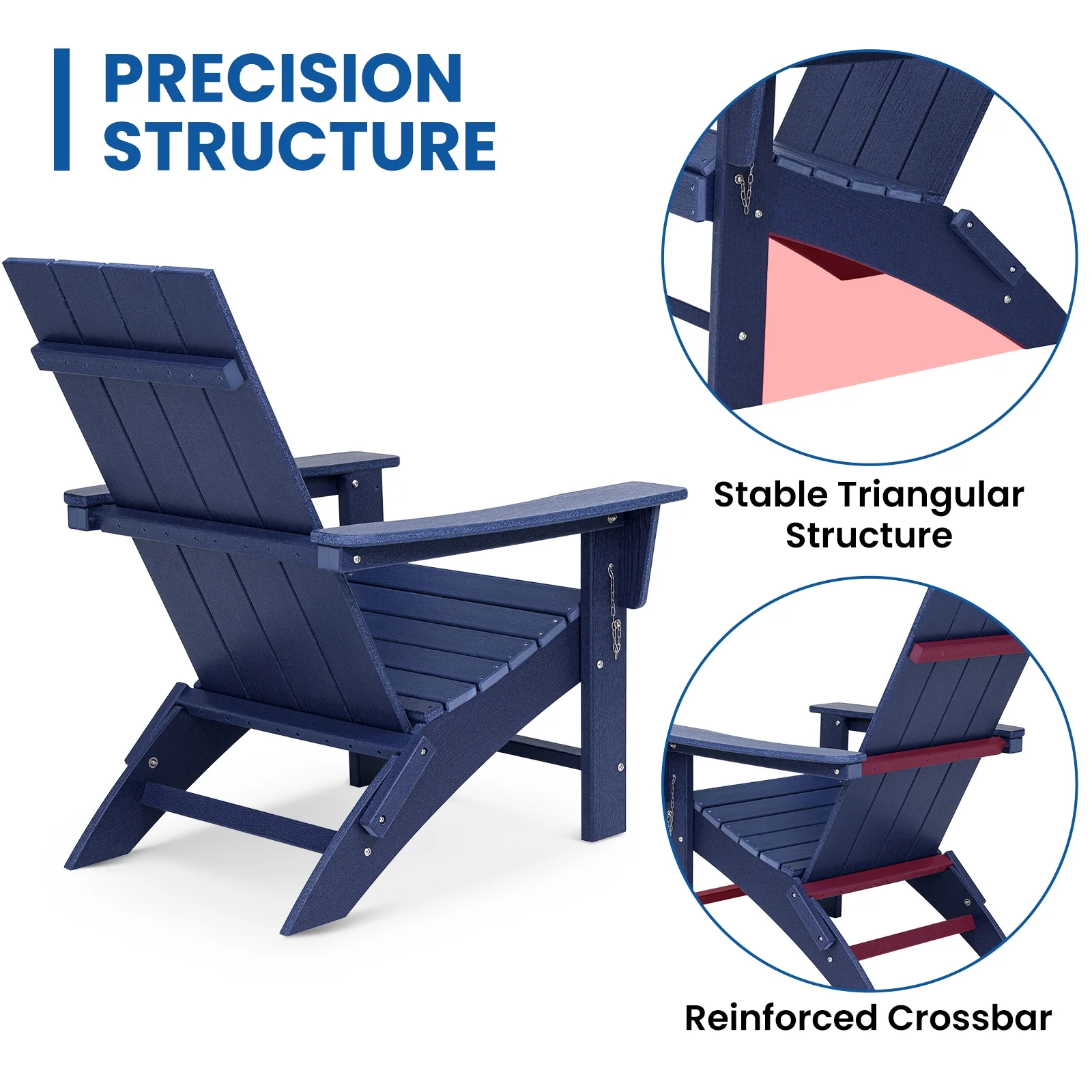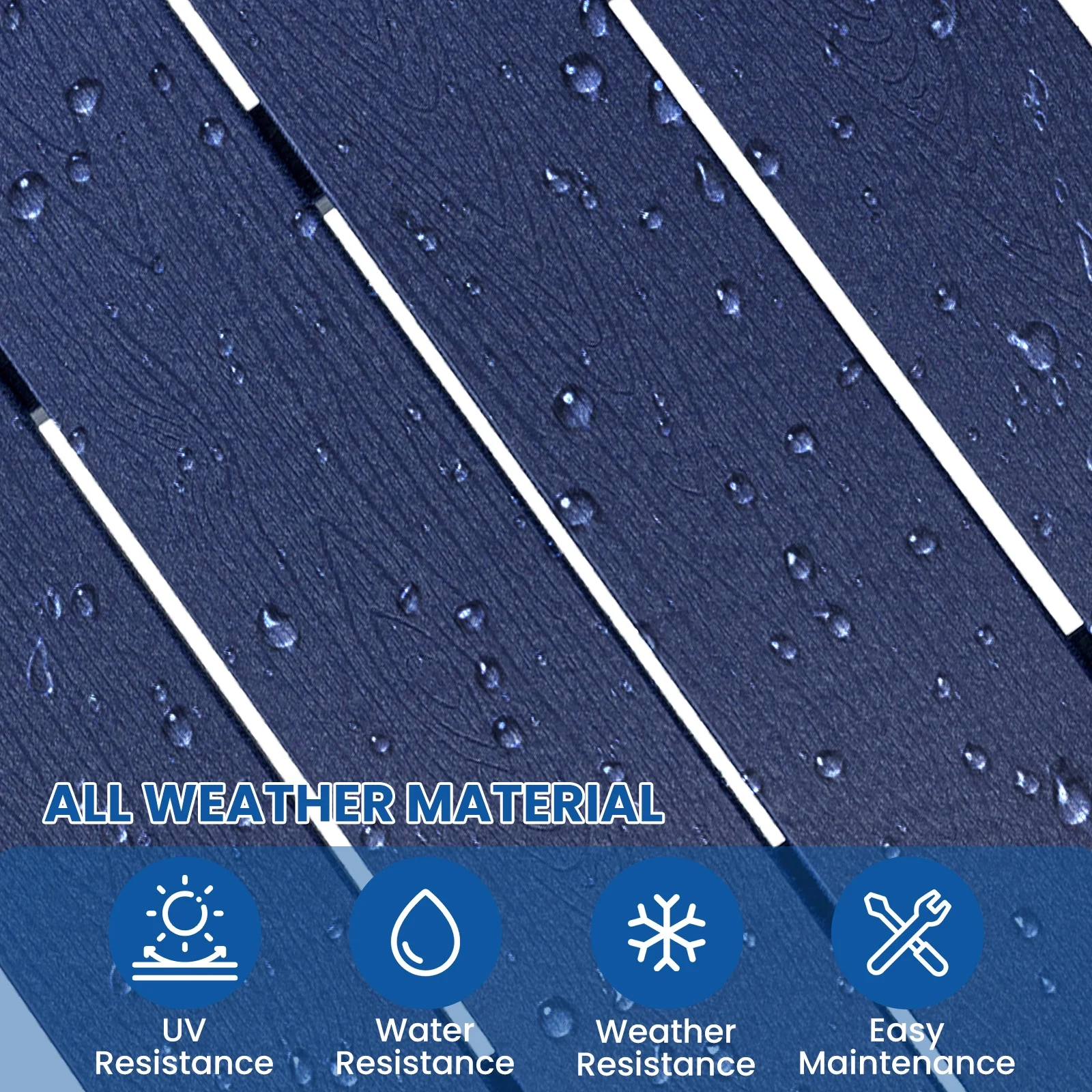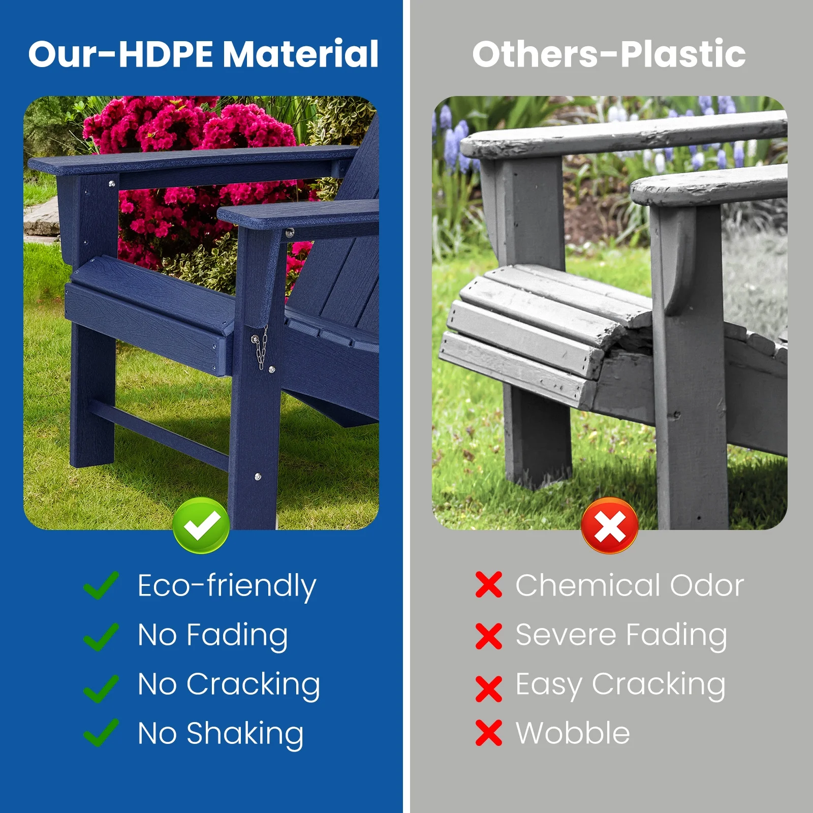 ▶SPECIFICATIONS Brand: Garpans Color: Navy Blue Adirondack Chairs Material: HDPE Arm Width: 4.7 inch Seat Width: 18.5 inch Seat Depth: 21 inch Weight Capacity: 350 lbs Adirondack Chairs Overall Size: 28.74 W x 32.87 D x 35.82 H (inches) Ottoman Overall Size: 19 W x 17 D x 13.4 H (inches) ▶KEY FEATURES Portability & Space-saving Folding Adirondack chairs are designed to be easily collapsible, allowing for convenient transportation and storage. It is ideal for camping trips, picnics, or small outdoor areas such as balconies or compact patios where space is limited. Classic Comfortable Seating Position The 106° angled backrest and deep seat of Adirondack chairs with wide armrest provide excellent comfortable reclined seating position, it is ideal for lounging and enjoying outdoor activities like reading or sunbathing. Weather Resistance & Long-lasting Durability Garpans’ outdoor Adirondack chairs are constructed from weather-resistant materials plastic (HDPE), making them suitable for year-round outdoor use in various weather conditions, including rain, snow, and intense sunlight. HDPE Adirondack chairs ensuring them resistant to rotting, cracking, fading, and splintering. Natural Aesthetic Design Garpans’ Adirondack chairs maintain this classic design while offering the added benefits of a smooth, comfortable surface. Their charming appearance adds to the ambiance of outdoor spaces.They blend well with natural surroundings like gardens, patios, and waterfronts. Low Maintenance HDPE Adirondack chairs are easy to clean and do not need to be stained, painted, or sealed like traditional wooden Adirondack chairs. Simply wiping them down with soap and water periodically is usually sufficient to keep them looking new. Environmentally Friendly HDPE Adirondack chairs are made from recycled materials, such as plastic milk jugs and detergent bottles. Choosing recycled HDPE furniture helps reduce waste and supports sustainable manufacturing practices. Versatility Adirondack chairs are versatile outdoor furniture pieces that can be used in various settings, including backyard patios, porches, decks, and around fire pits or outdoor dining areas. ▶Q&A :WHY CHOOSE GARPANS ADIRONDACK CHAIR ? 1. All-weather environmental friendly high-density polyethylene material, longer service life without rotting, cracking, fading, and splintering, and low maintenance. 2. Classic ergonomic design, 106° angled backrest and deep seat of Adirondack chairs with wide armrest provide excellent comfortable reclined seating position, making you peace of mind, relax and comfort. 3. Versatile outdoor furniture pieces that can be used in various settings, including backyard patios, porches, decks, and around fire pits or outdoor dining areas. ▶NOTE 1. Please allow 1-3cm error due to manual measurement’s make sure you do not mind before you bid. 2. The color may have different as the difference display understand. ▶CONTACT US If you have any problems with our items or services, please feel free to contact us any time. We ‘re always online and do our best to solve your problems and provide you with the best customer services.