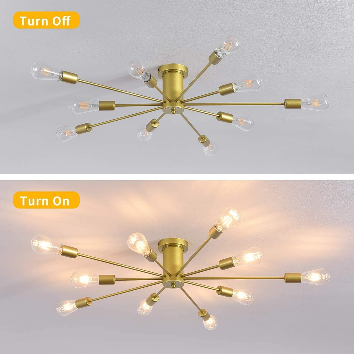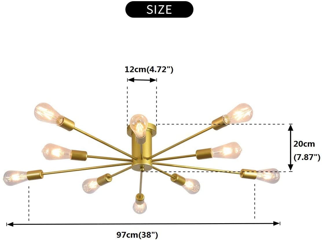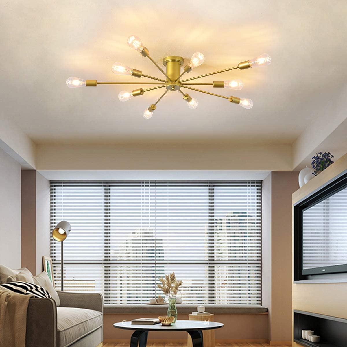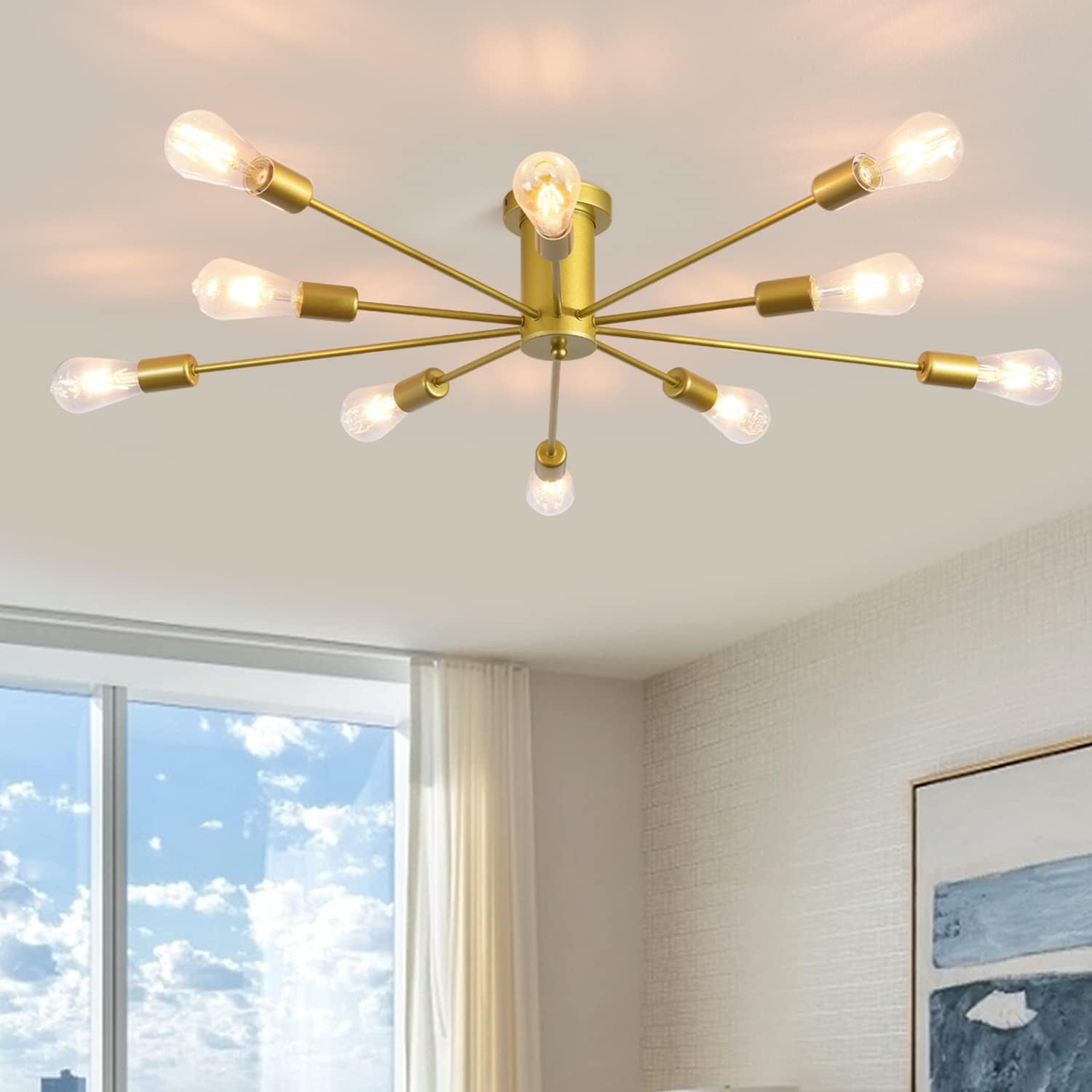 Garwarm 10 Lights Modern Sputnik Ceiling Chandelier Gold Industrial Ceiling Lamp Mid Century Semi Flush Mount Ceiling Light Fixture for Kitchen Dining Room Living Room Bedroom Foyer Lighting