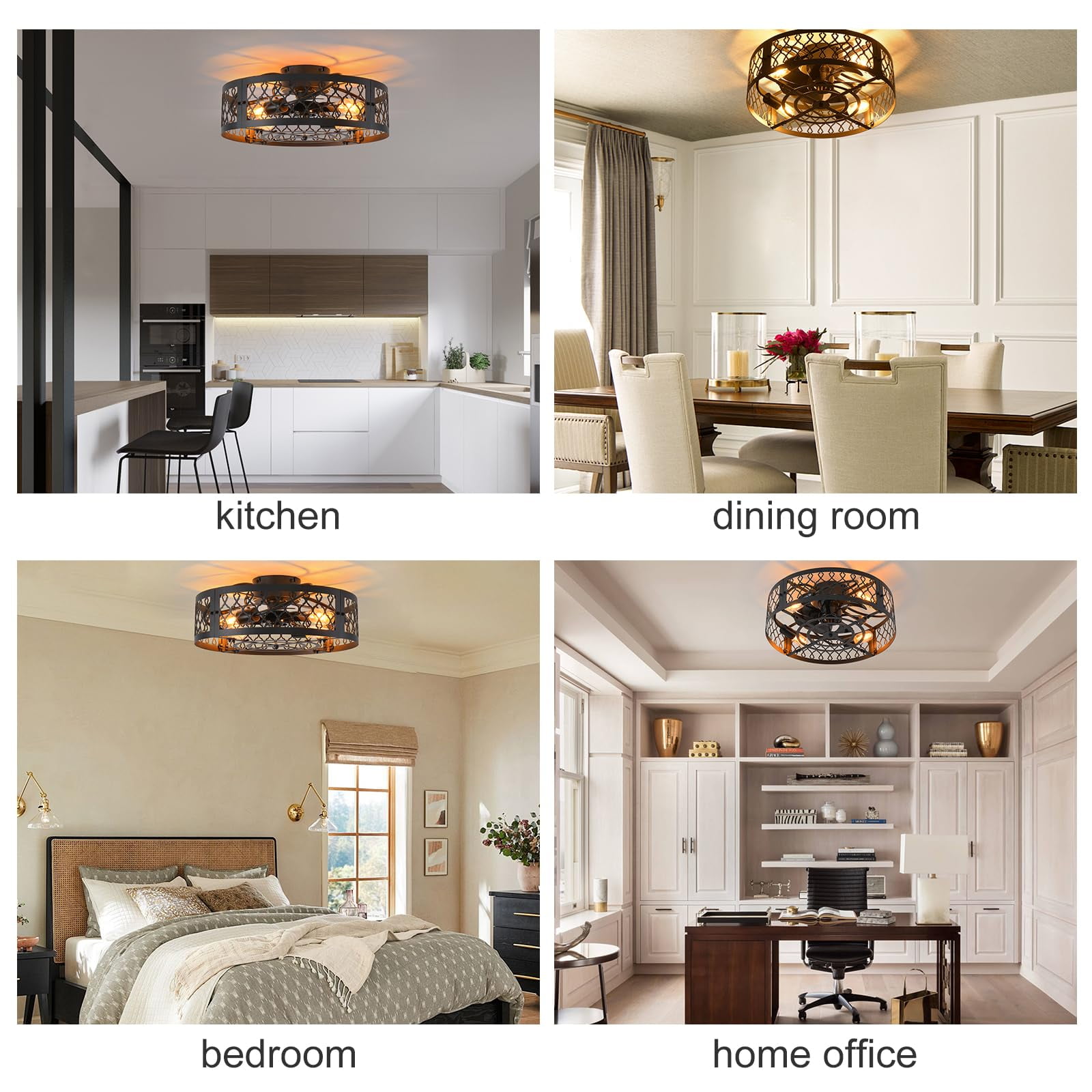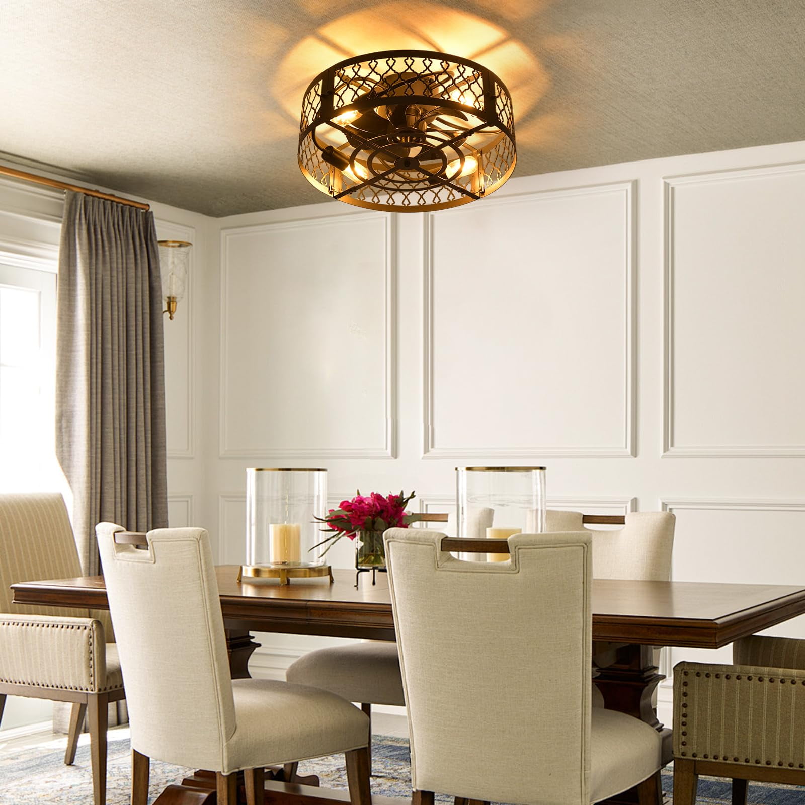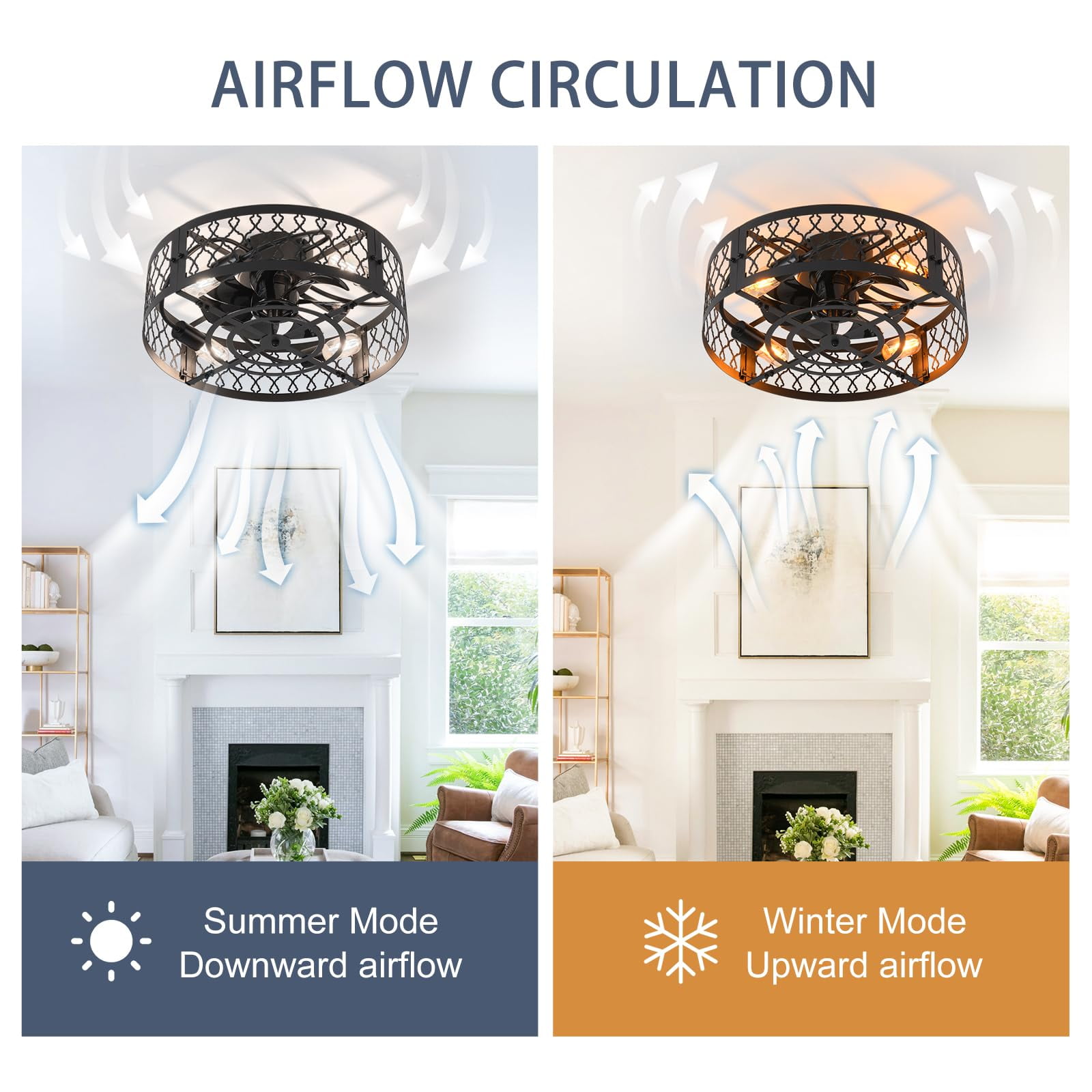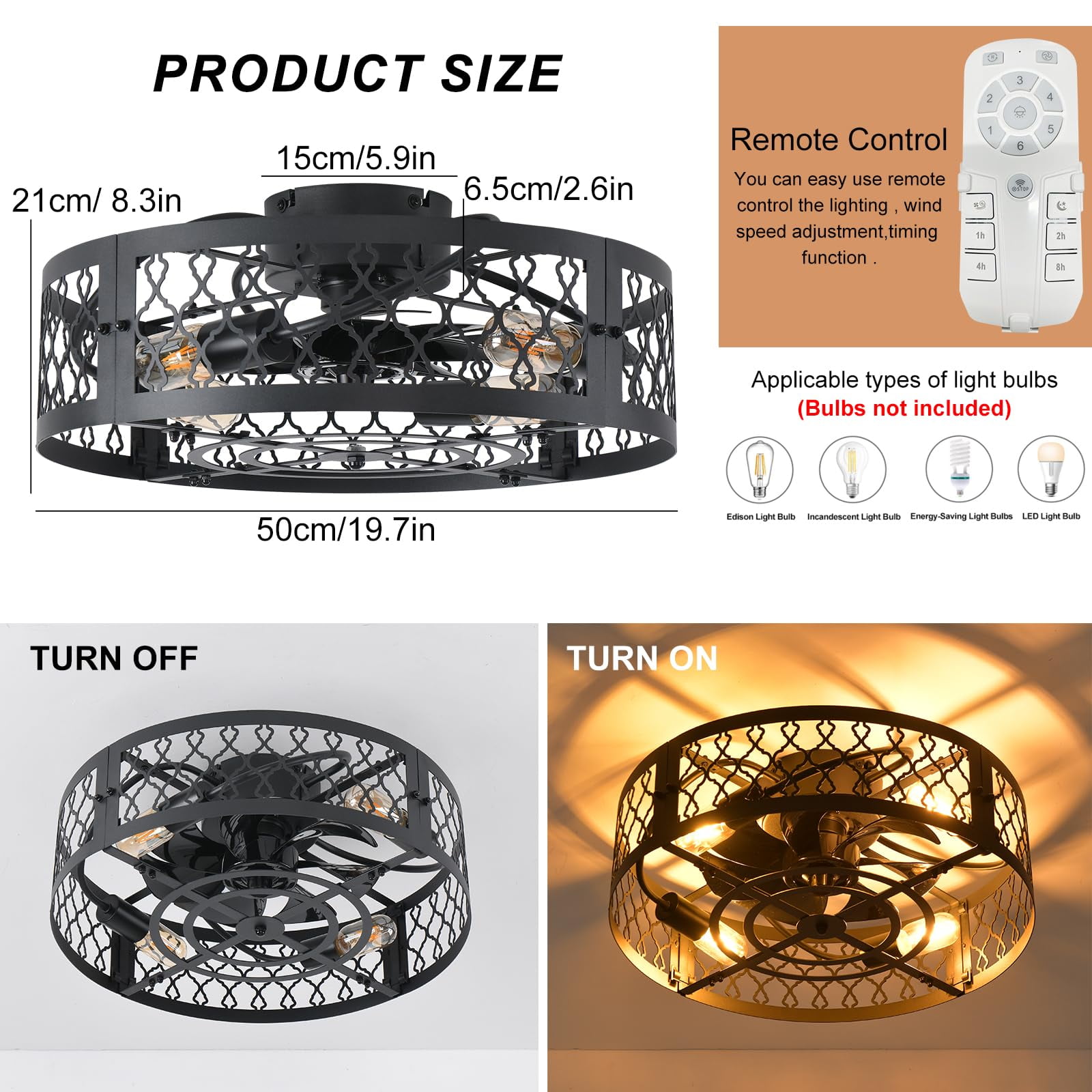 Brand: Garwarm Setting: 2-in1 Flush Mount Ceiling fans Style: Modern/ Unique/ Simple/ Elegant/Fashionable Material: Metal, PP Finish Type: Painted Color: Black Lampshade: Caged Dimension: 19.7 x19.7 x 8.3 inches Canopy Dimension: 5.9 inches Voltage: 110V Wattage: Max 60W of each bulb Bulb Base: E26 (Bulbs Not included) Bulb Type: LED, CFL, Incandescent, Halogen.(ATTENTION: Bulb Not Included) Number of lamp holders: 4 6 different wind speeds levels: high, medium, and low Motor power: 15W High-quality silent motor: Both forward and reverse functions Reverse Mode: Enables ventilation fan functionality Control Method: Remote control & APP Timer setting: 1/2/4/8 hour timing setting The ceiling fan lights provide essential lighting for your home and a cool breeze during hot weather. Additionally, its reverse mode acts as a ventilation fan in cold, dry seasons, promoting air circulation and creating a more comfortable living environment. Power Source: Corded-electric (No Batteries Included & Required) Install Type: Need Hardwired Usage area: 150 to 250 ft² Package List: 1 x Ceiling Light Fans,1 x Remote (No Batteries Included), 1 x Mounting Material,1 x Installation Manual This modern ceiling fan with light can create a cool breeze for you while bringing beautiful lighting, suitable for dining rooms, small living rooms, bedrooms, etc recommended location. Convenient Remote Holder:The remote control comes with a wall-mounted bracket, allowing you to easily place it on the wall. This makes the remote convenient to use. Detachable and Washable Fan Blades for Easy Maintenance: The fan blades are designed as an integrated unit for easy detachment and cleaning, ensuring effortless maintenance. When not in use, the blades can be easily disassembled for convenient storage.