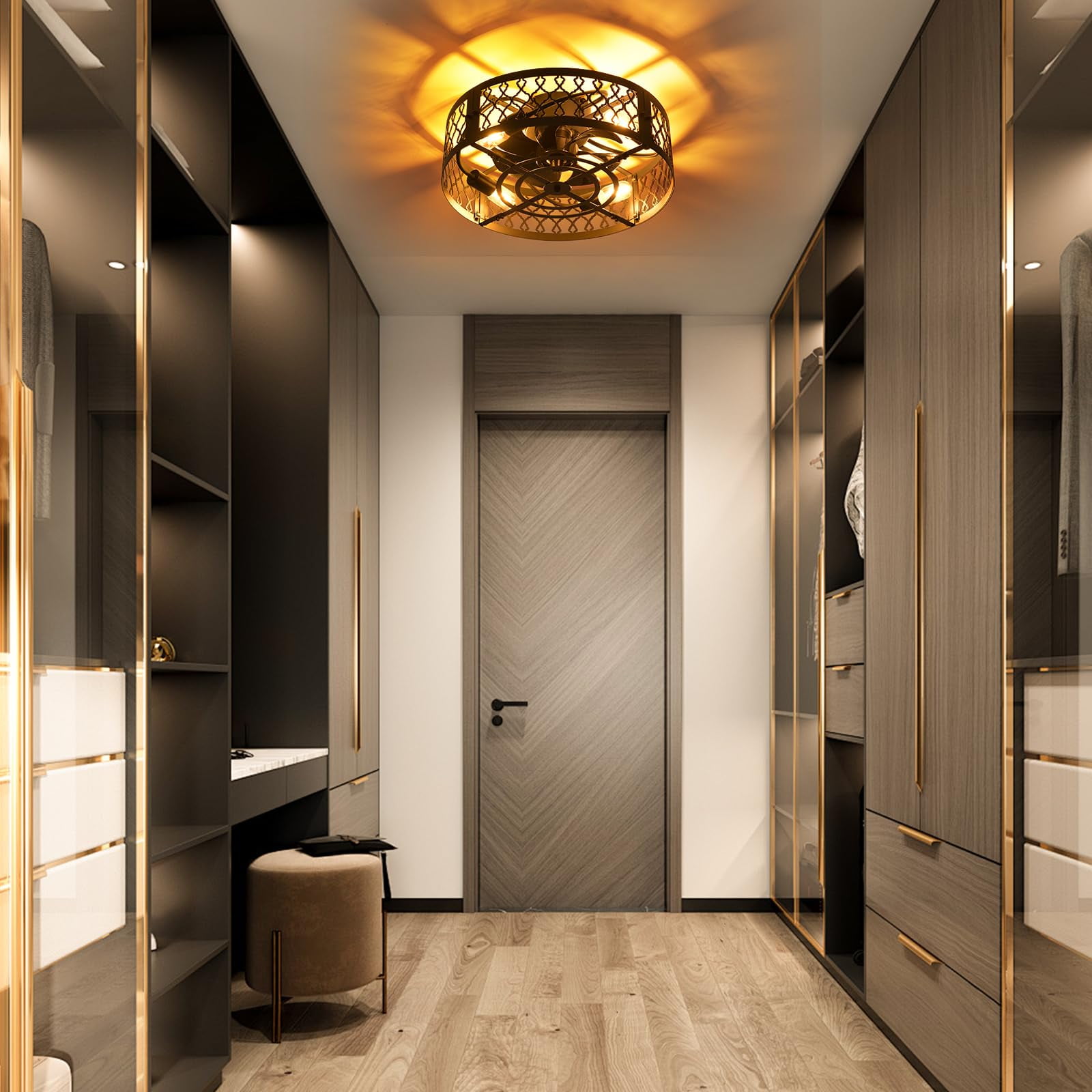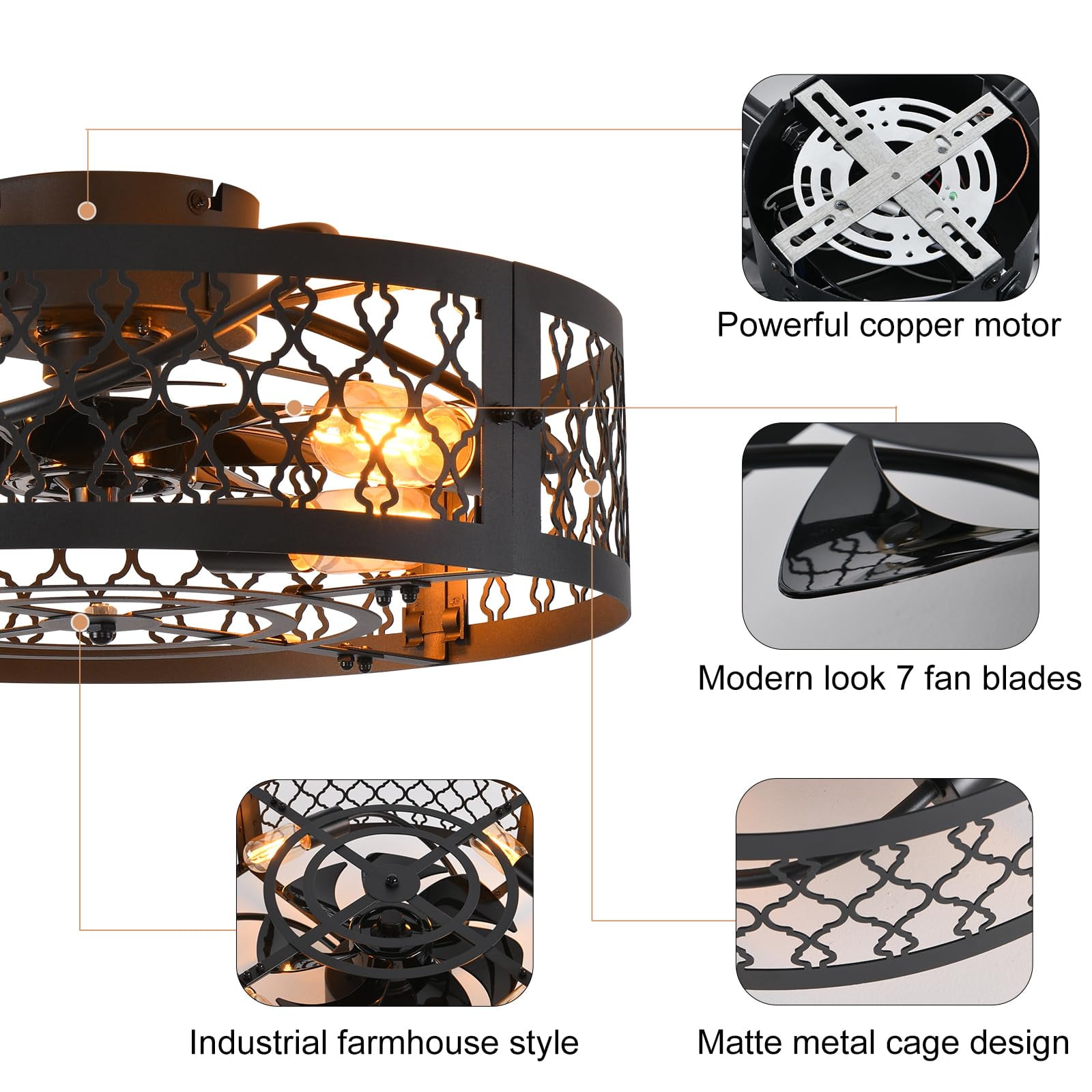 Garwarm 19.6” Caged Ceiling Fan with Lights, Black Industrial Bladeless Ceiling Fans with Remote, Flush Mount Low Profile Ceiling Fan Fixtures for Home Office,Kitchen, Bedroom,Assembly Require