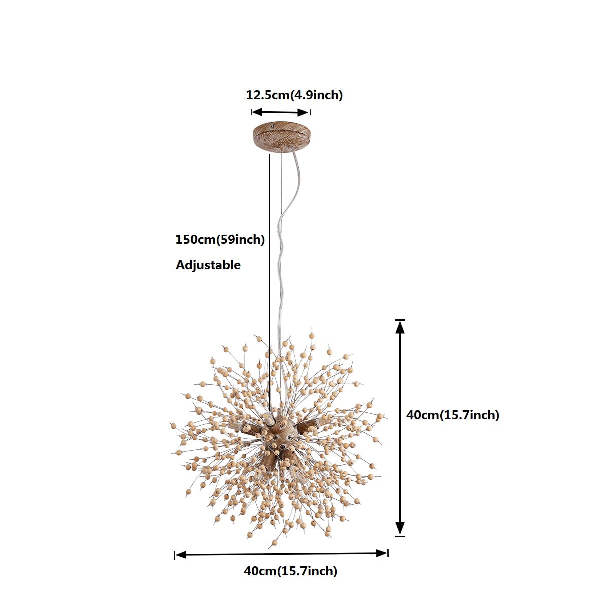 Lamp Fixture Diameter: 15.7in/40cm Ceiling Canopy Width: 4.9in/12.5cm Hanging Cable Length: 59in/150cm (Can be adjusted as your needed) Number of Lights: 8 Material: Metal, Wood and Wooden Beads Bulb Base Type: G9 Bases * 8 pcs (Bulbs are not included) Wattage: Max 25W of Each Bulb Chain/Cord: Adjustable This modern chandelier light fixture features slender rods and wood beads sphere in every direction like a firework and dandelion. The lamp body and rods are painted of metal in an antioxidant finish, making it more durable. Painted process, anti-corrosion, anti-rust, anti-fading, durable. Easy to install and not complicated. Rustic and retro surface finish will fit well with your home decor. This dandelion chandelier lamp is dimmable when used with dimmable bulb and compatible dimmer switch. (Not Included Bulbs and Switch.) Included all hard-wired necessary mounting and installation guide. PACKAGE: 1 x Chandelier, 1 x Accessories package, 1 x User Manual Instructions