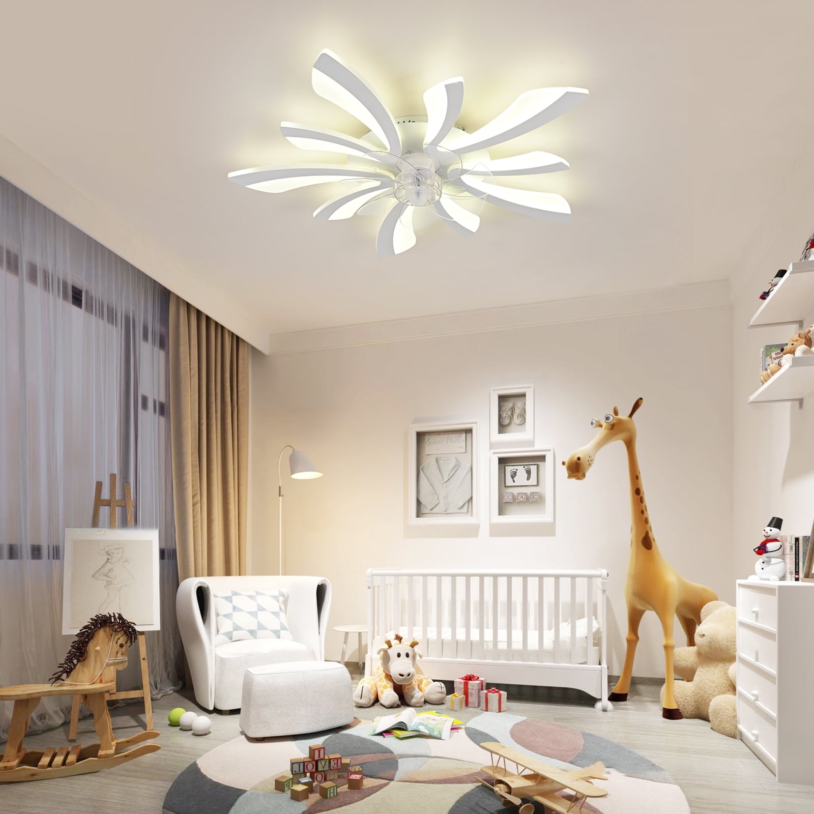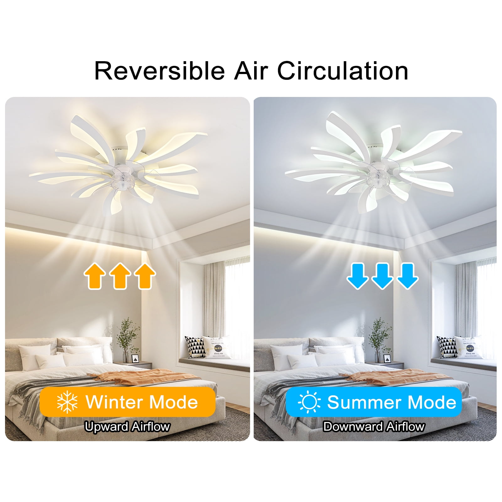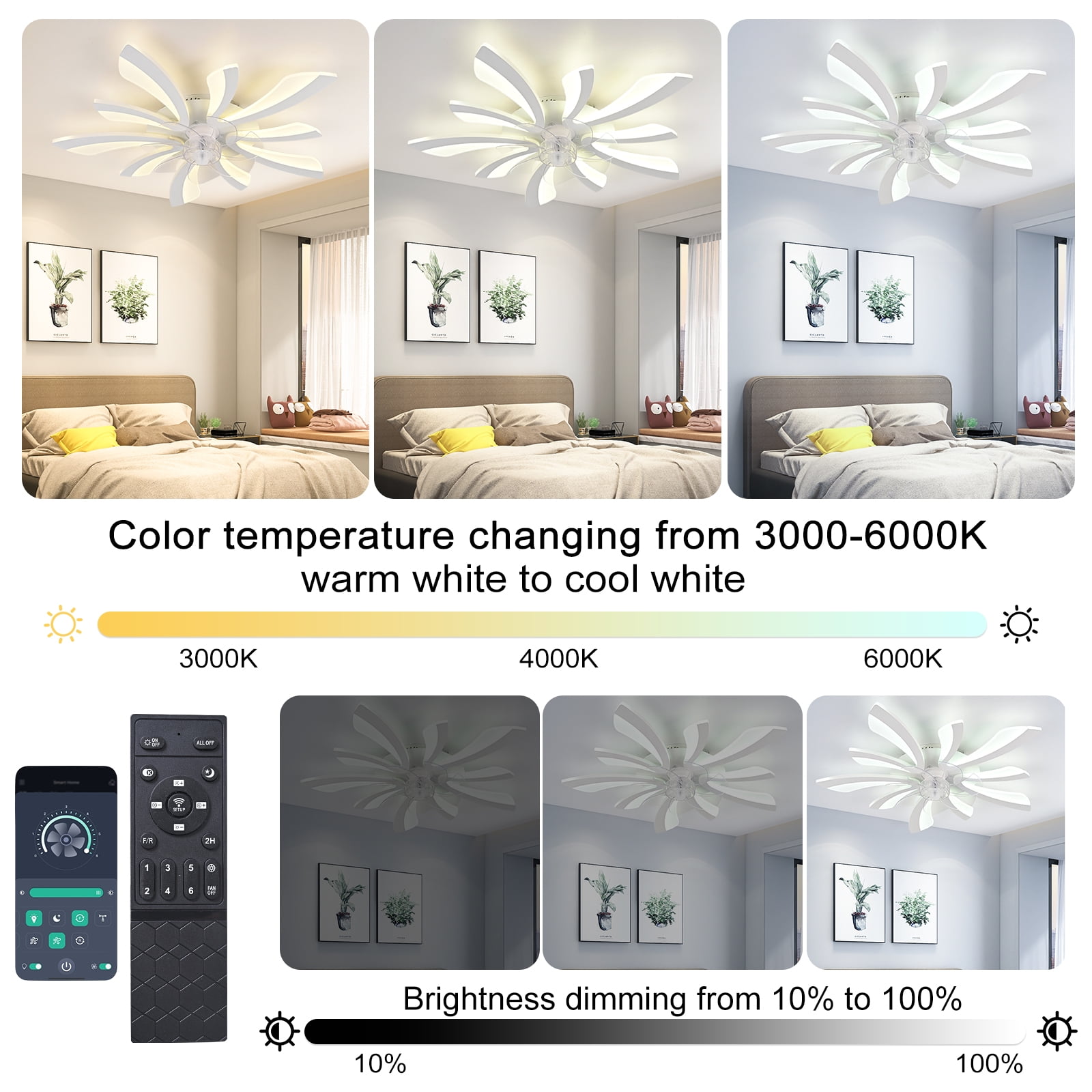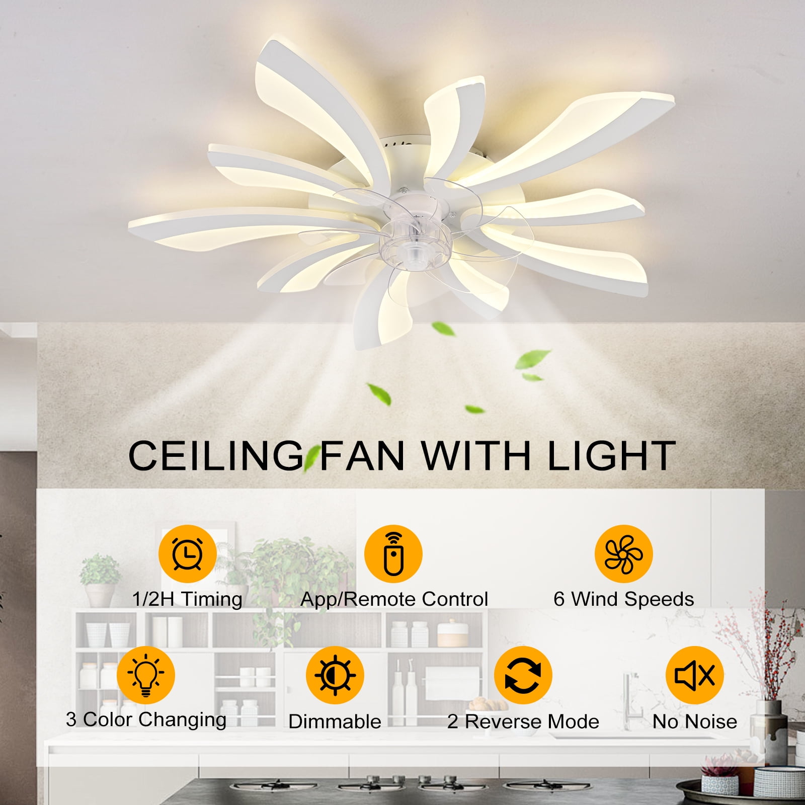 Garwarm Dimmable Ceiling Fan with Light and Remote Control, 27″ Small Flush Mounted Ceiling Fan with Led Lights, APP and Remote Controlled, Modern, White