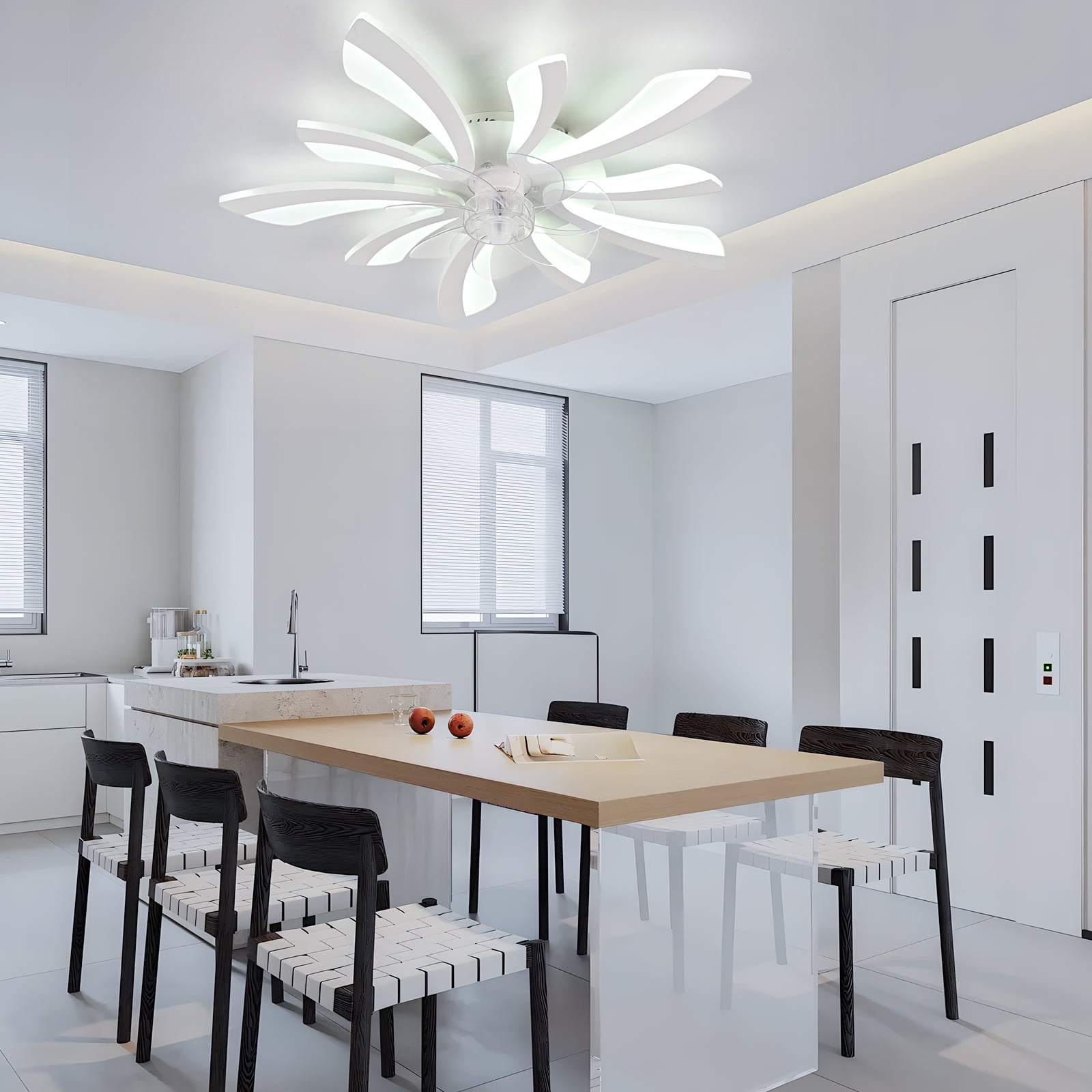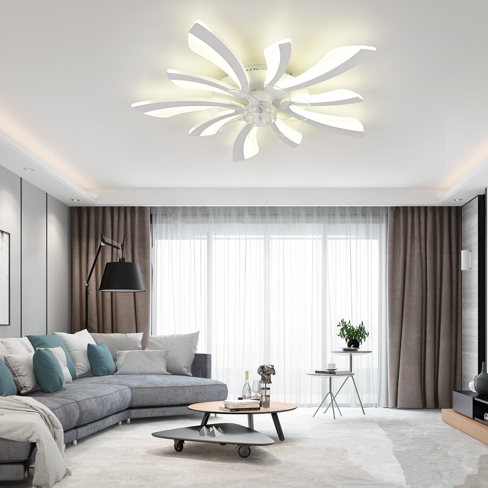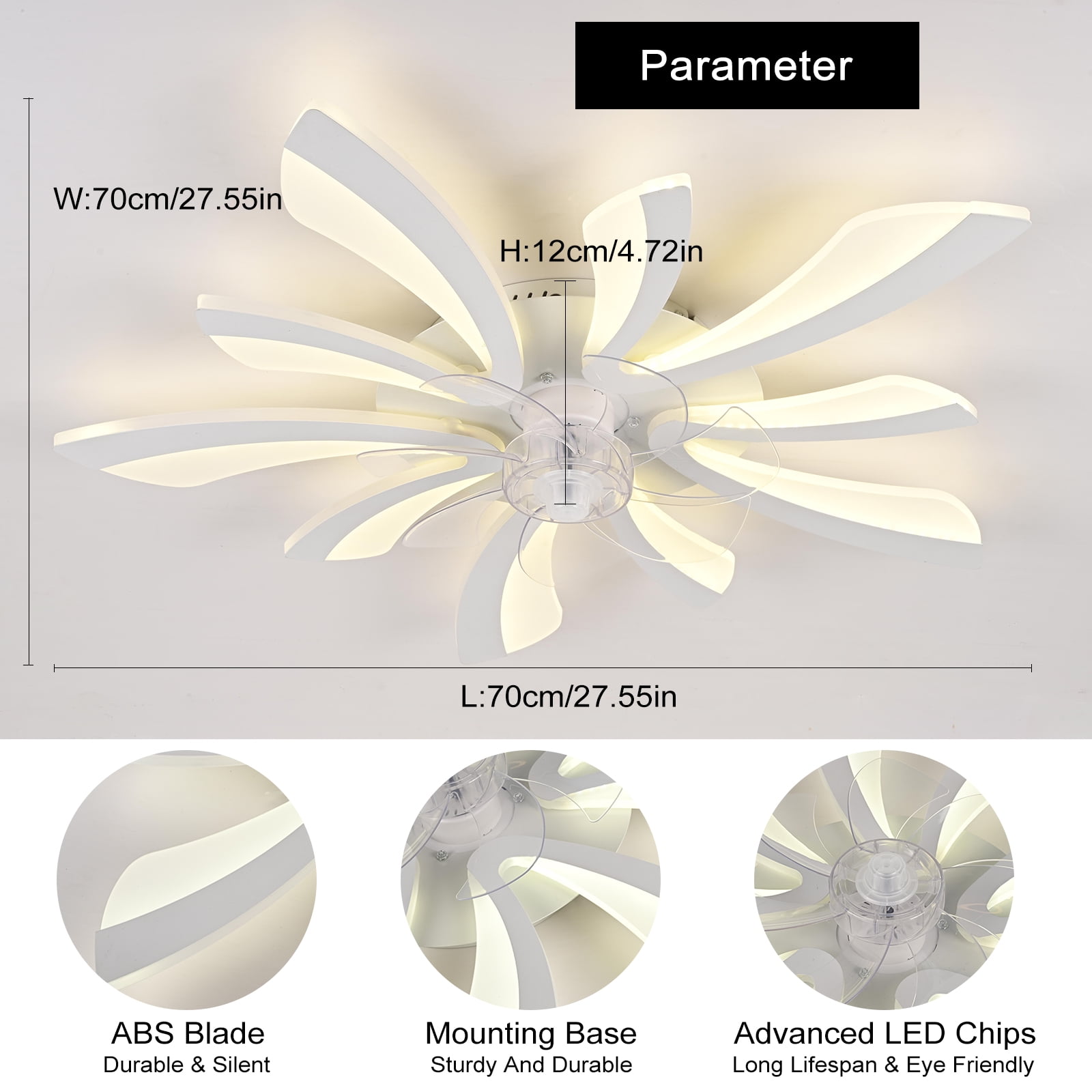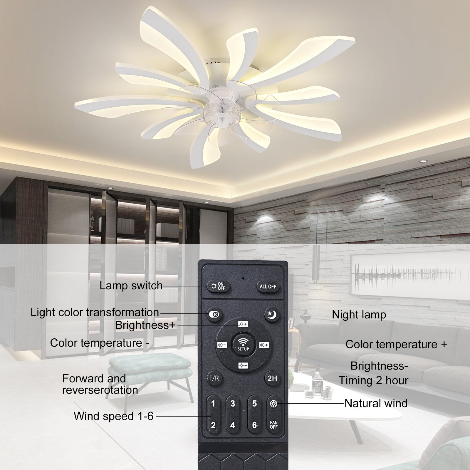 Versatile and Stylish: This 2-in-1 flush mount ceiling fan offers a modern, unique, and elegant design, perfect for various indoor spaces Convenient Remote Control: Easily adjust the brightness (5%-100%), color temperature (3000K-6500K), fan speed (6 levels), and timer (2 hours) using the included remote control Powerful and Quiet: The high-quality silent motor provides strong airflow and operates quietly, while the 7 ABS blades ensure efficient air circulation Energy-Efficient Lighting: The 40W LED light source offers 2400lm of brightness, saving energy compared to traditional bulbs Easy to Install and Use: The fan is hardwired for easy installation and includes mounting materials and an installation manual. The memory function saves your preferred settings for added convenience