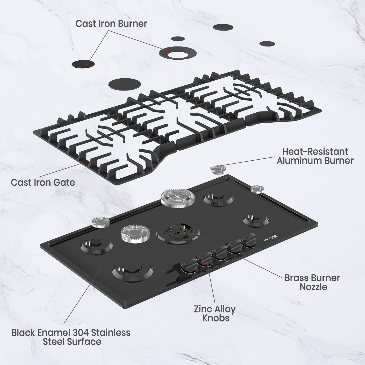 Gasland Chef focuses on kitchen products and continues to explore for innovations for years in order to achieve the vision and mission of to be a first-class enterprise and to create a global brand and continuously improve the quality of human life. Cooktops is just one of the various categories of Gasland Chef. This PRO GH2365EF 36in black enamel surface gas cooktop is a dual fuel gas cooktop that can use both propane and natural gas. The Gasland Chef built-in black enamel surface gas cooktop comes with a 4,000 BTU semi-rapid burner and a 13,000 BTU triple ring burner and continuous dishwasher-safe grates. It can be easily cleaned with no hassle after each time cooking.