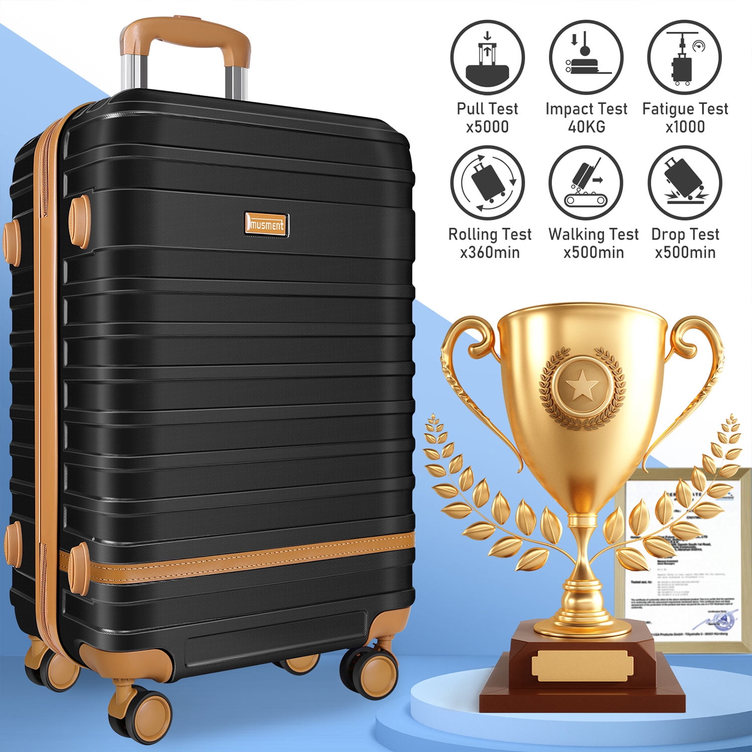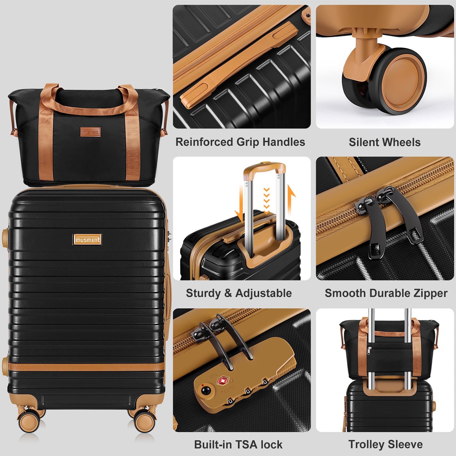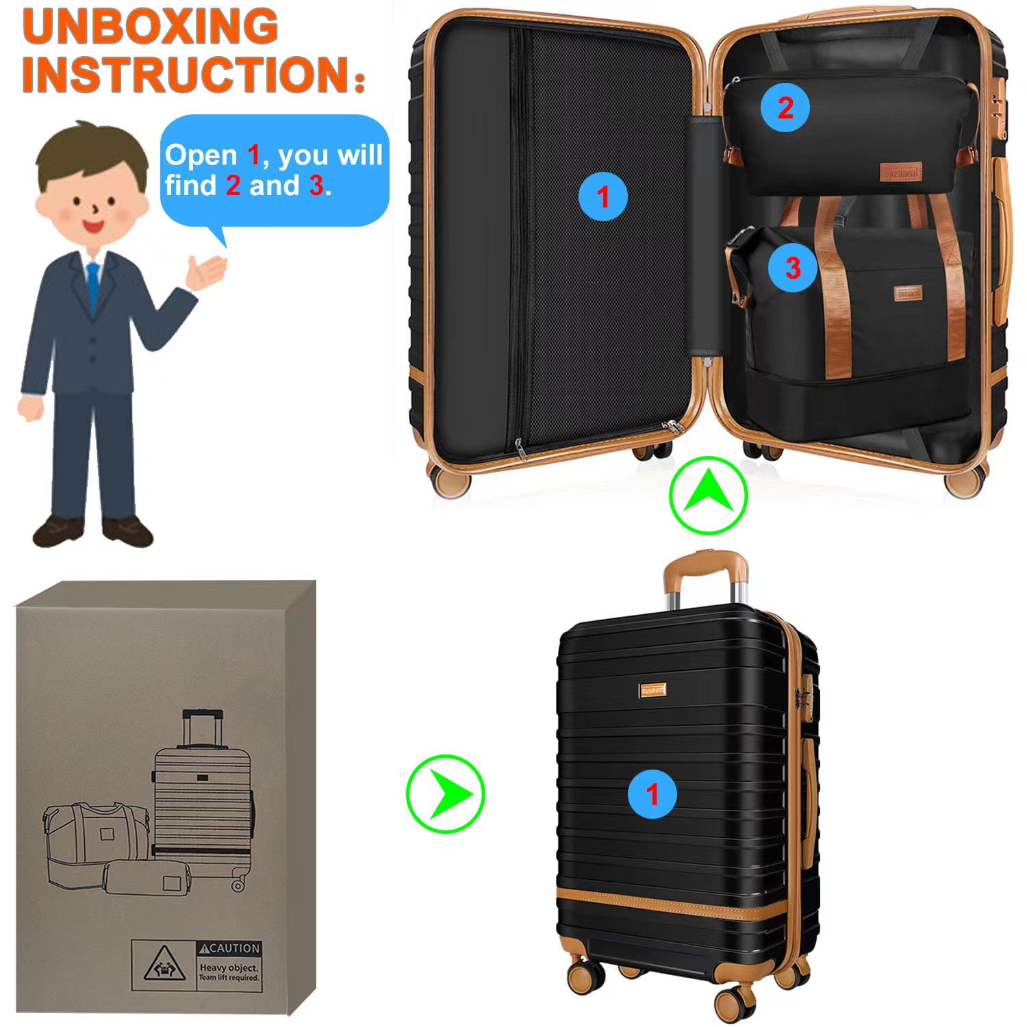 ????Perfect set :includes a 20’’ luggage, a travel duffel bag and a toiletry bag,Provide convenience for travel. ????20’’ luggage Mounted TSA-approved lock, and fully-lined interior divider with organization pockets, keep your belongings secured and organized in the luggage. ????Crafted with ABS for durability and versatility, the luggage is lightweight and built to last. Slide or glide with the retractable handle and four multi-directional spinner wheels that move at your pace. ????The duffel bag and toiletry bag are all made of polyester fabric which is mild water-resistant. The duffel bag is designed with the back sleeve, so you can conveniently attach them to the retractable luggage handle.
