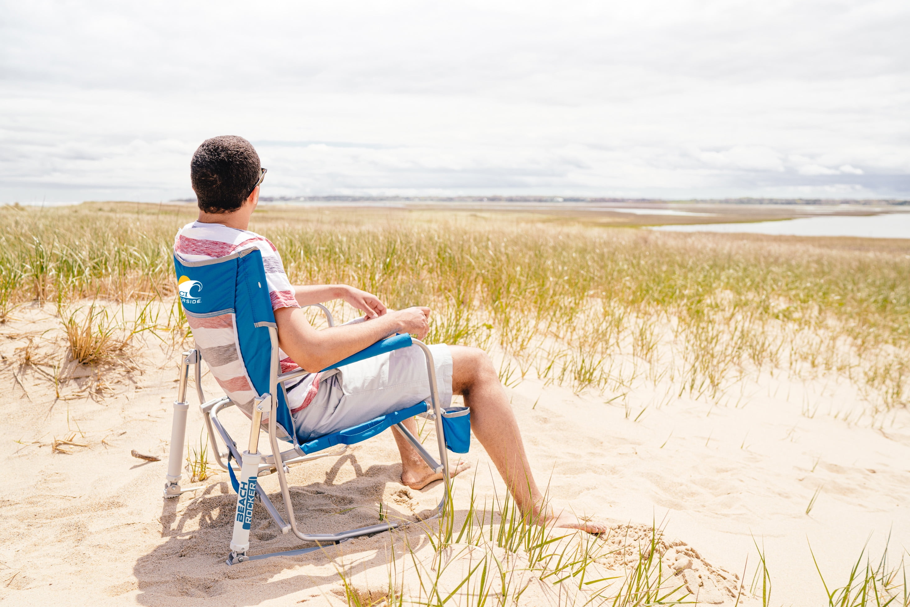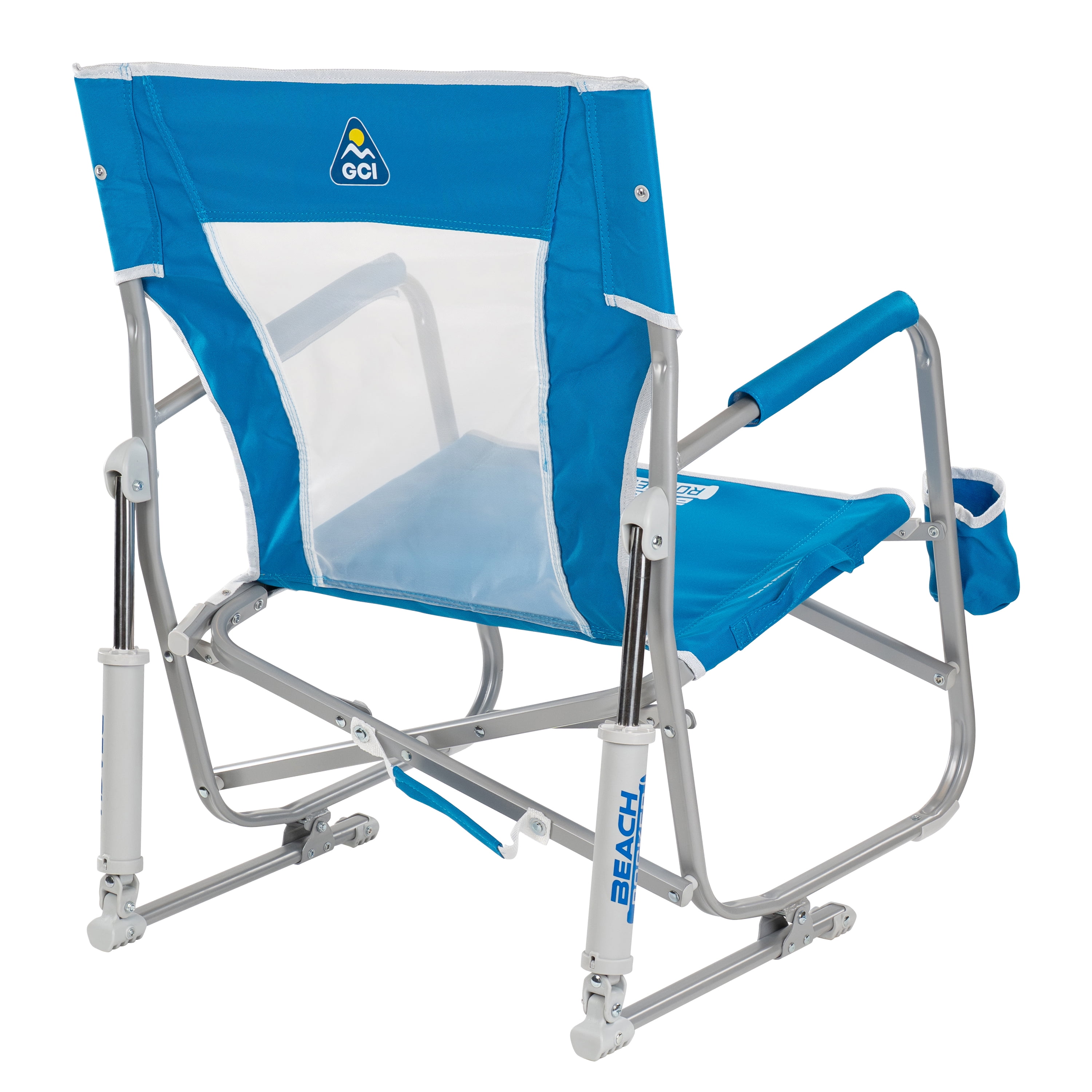 Patented spring-loaded shocks for a smooth rocking motion on sandy shores Low-profile seat for a relaxed sitting position with your toes in the sand Sturdy aluminum/steel hybrid frame for years of outdoor use Durable mesh backrest for cooling airflow Built-in beverage holder for staying refreshed Padded armrests for all-day comfort Eazy-Fold Technology for safe and simple opening and closing Convenient carry handle for easy portability Fold-flat design leaves more trunk space for beach gear Weight capacity: 250 lbs. Item weight: 10 lbs.