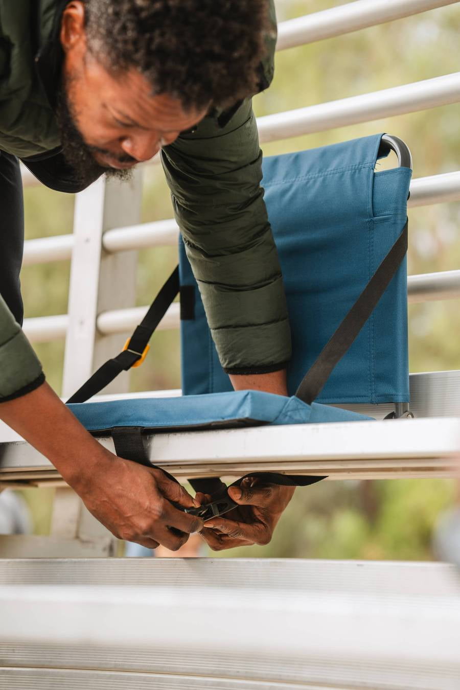 Lightweight, padded seat for all-day comfort Protects against hot, cold, and hard bleacher surfaces Adjustable backrest for customizable support and comfort Shoulder carry strap enables easy, hands-free portability Single buckle strap securely fastens to stadium benches with one click Mesh storage pocket to hold small essentials Auto-Fold Technology for quick and easy folding when packing up Folds-flat design for convenient, space-saving storage Ideal for indoor and outdoor use Weight capacity: 250 lbs. Item weight: 2.9 lbs.