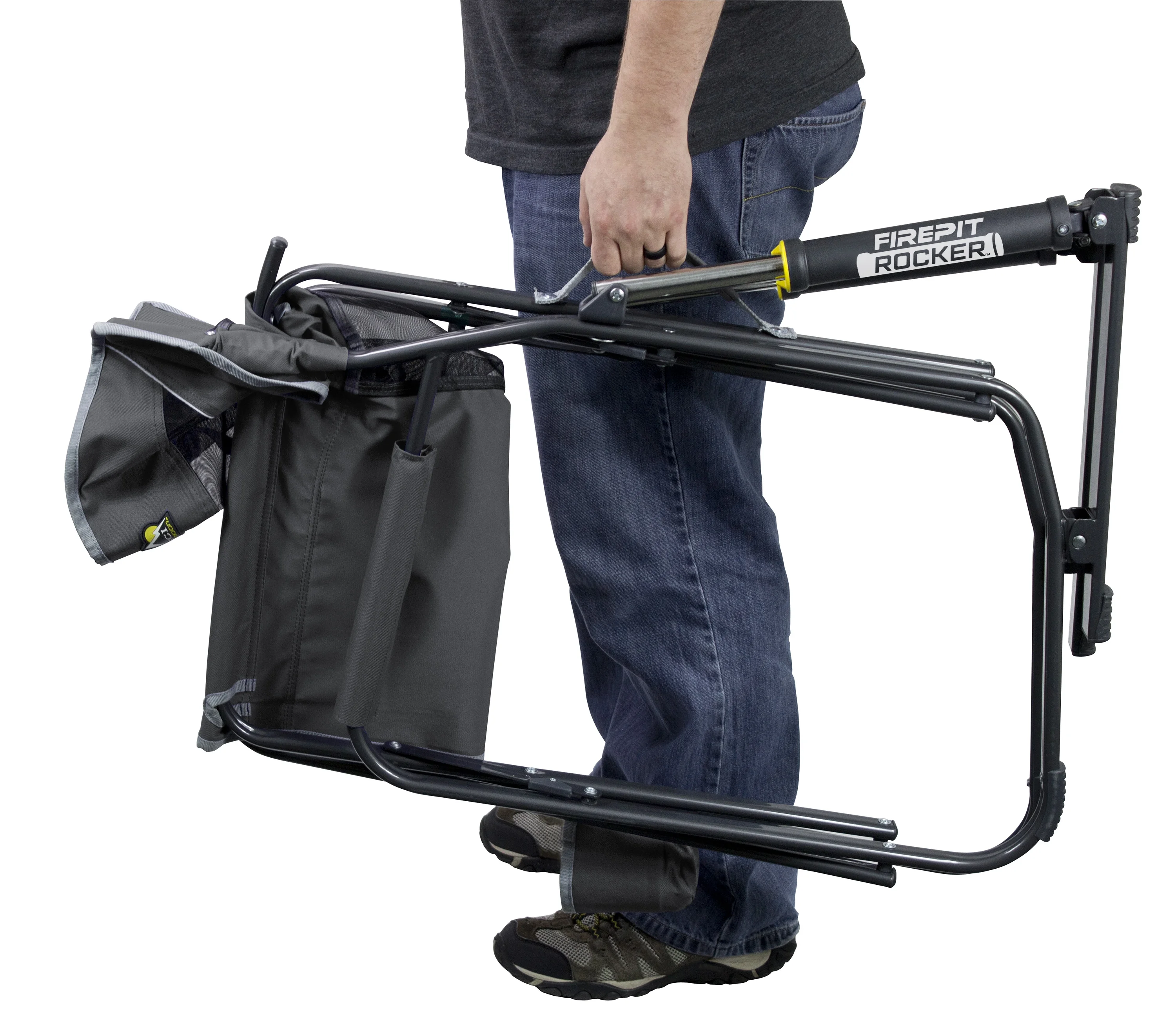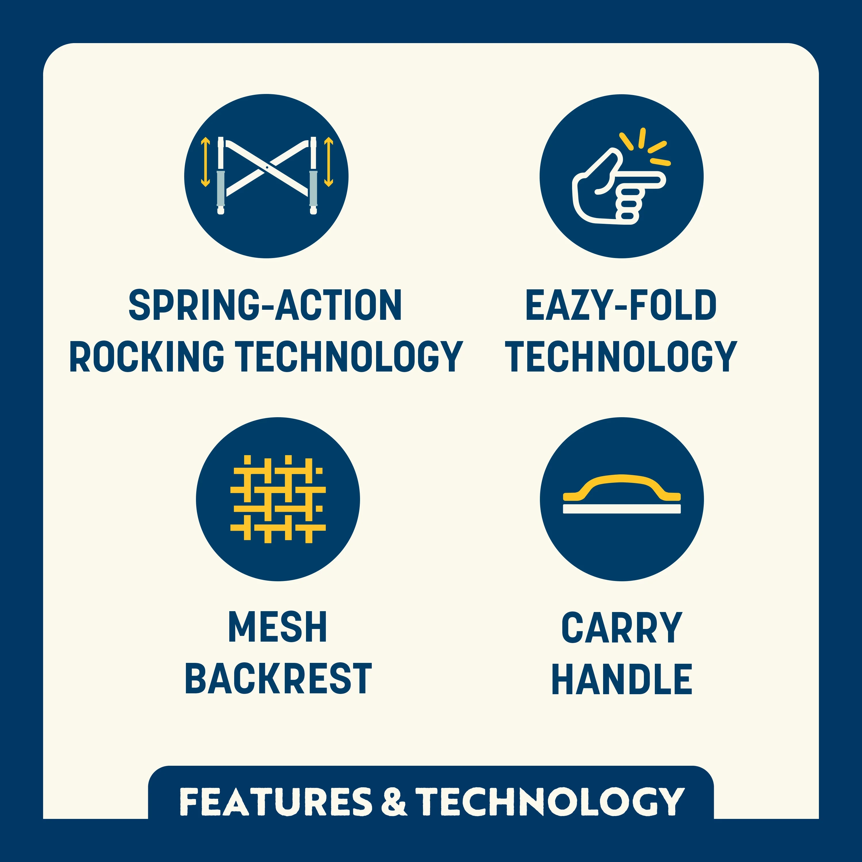 Patented spring-loaded shocks for a smooth, relaxing rocking motion Low-profile seat perfect for unwinding by the fire Durable mesh backrest that promotes cooling airflow Built-in beverage holder to keep your favorite refreshment close Padded armrests offering extra comfort and support Eazy-Fold Technology for safe, effortless opening and closing Convenient carry handle for easy portability Fold-flat design for compact, space-saving storage Sturdy steel frame built to withstand years of outdoor use Weight capacity: 250 lbs. Item weight: 12 lbs.