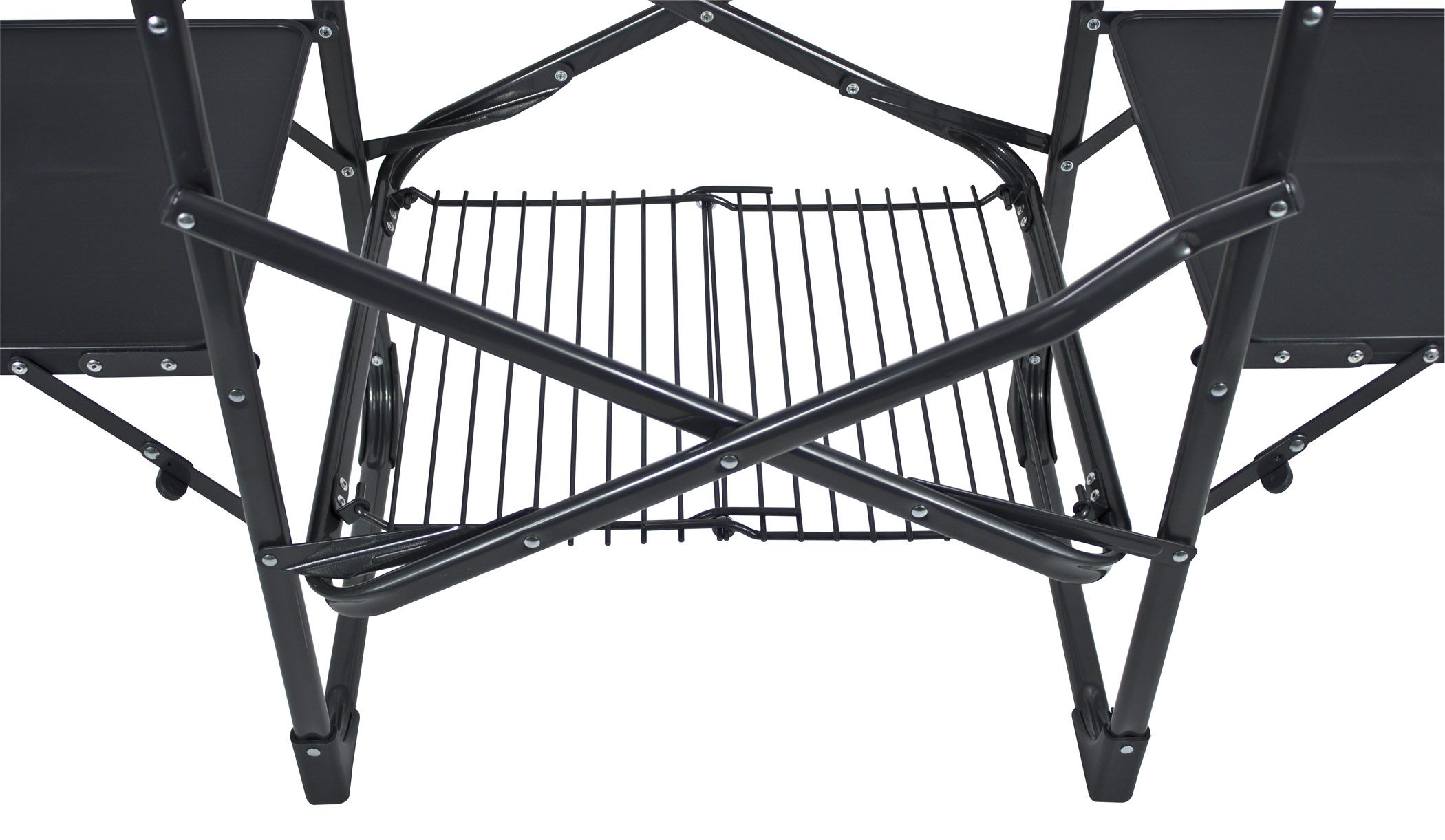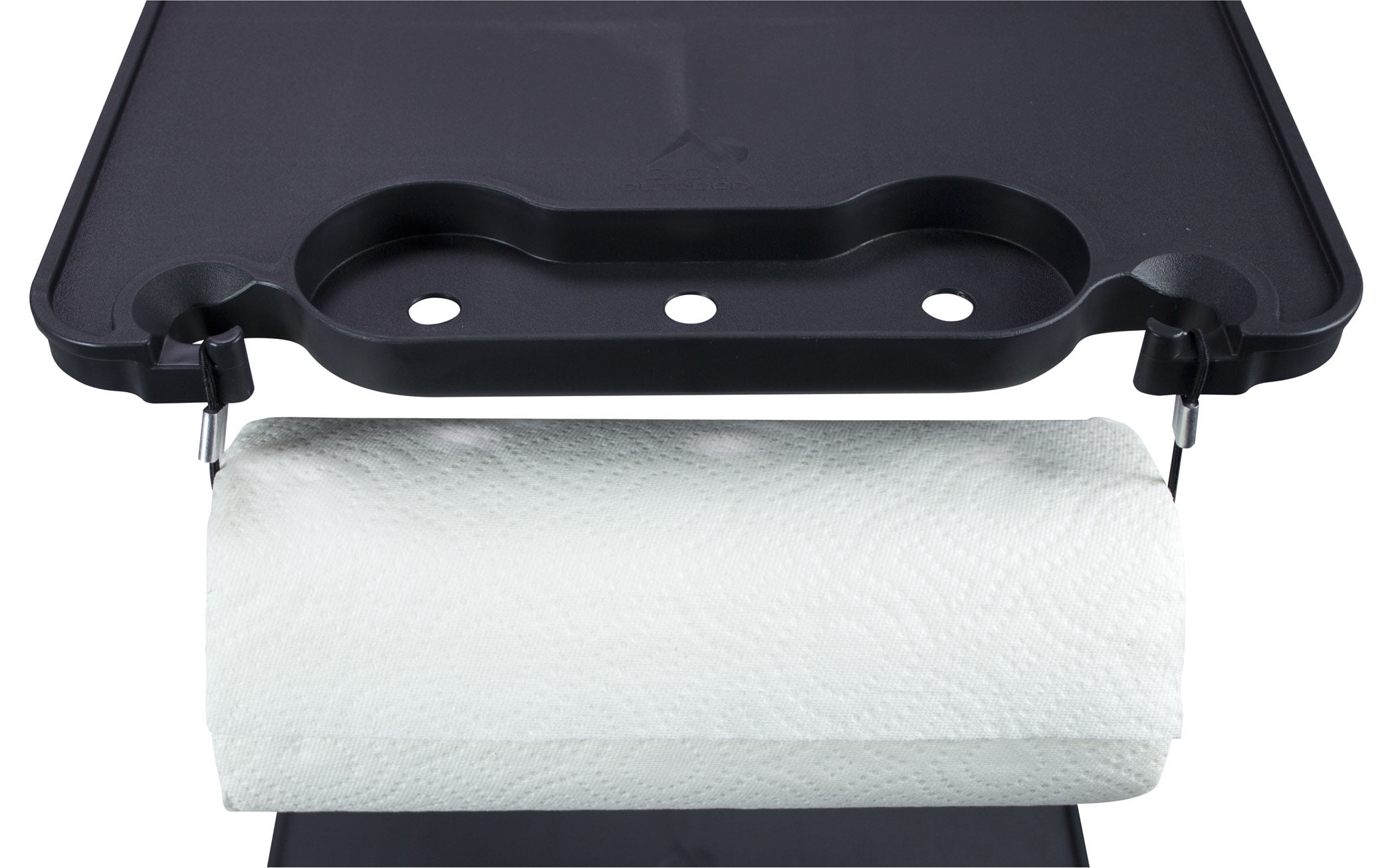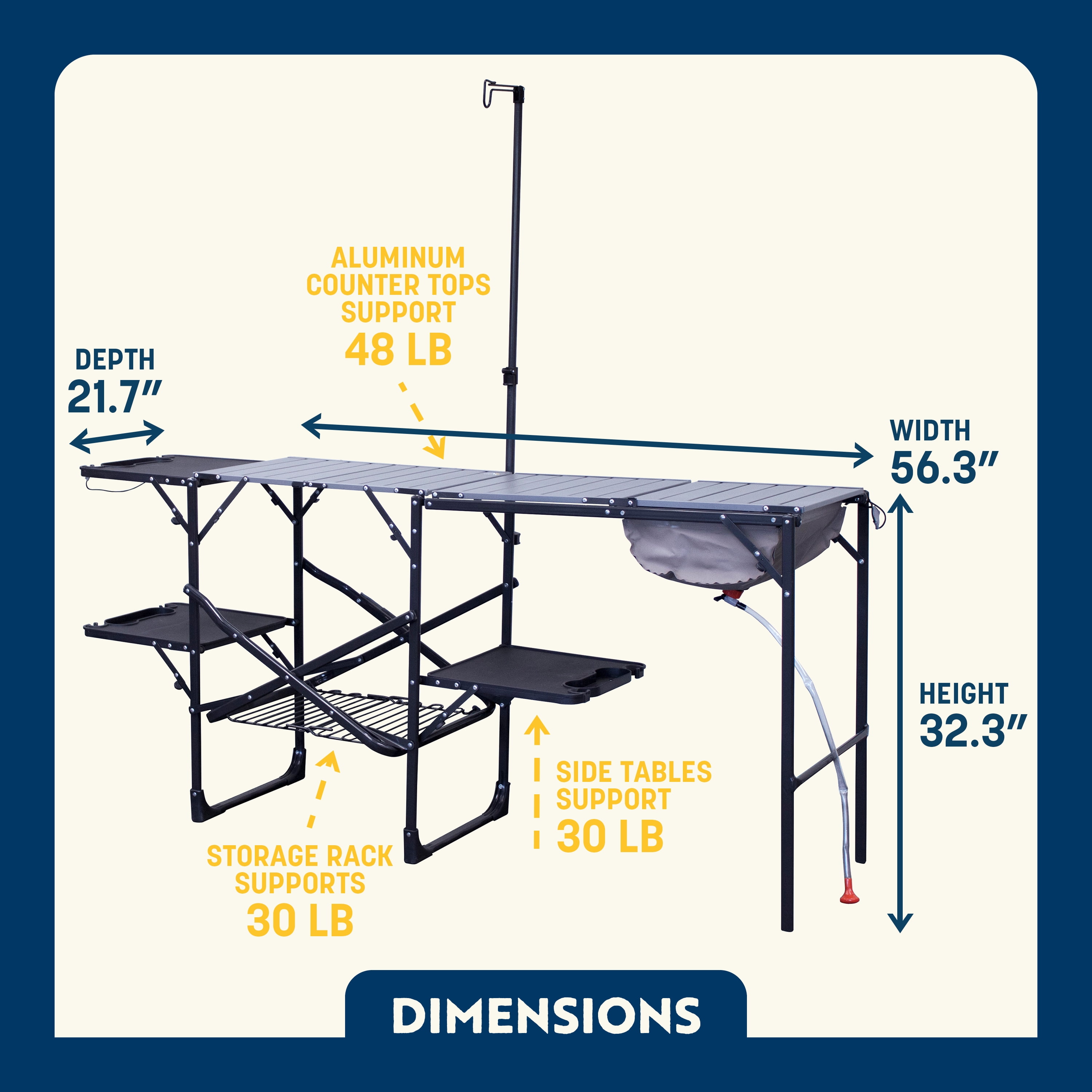 Heat-resistant aluminum tabletop supports up to 48 lbs of food or cooking equipment Three fold-out side tables with built-in beverage and wine glass holders, each supporting up to 30 lbs Lower storage rack holds up to 35 lbs—perfect for a cooler or extra supplies Soft-shell sink with drain for rinsing and soaking dishes Built-in hooks for garbage bags or cooking utensils Telescoping lantern pole for preparing meals after dark Integrated paper towel holder for quick clean-up Space-saving, foldable design for compact storage Durable steel construction ensures years of outdoor use Quick and easy setup and takedown Open dimensions: 21.7” L × 56.3” W × 32.3” H Item weight: 22.7 lbs