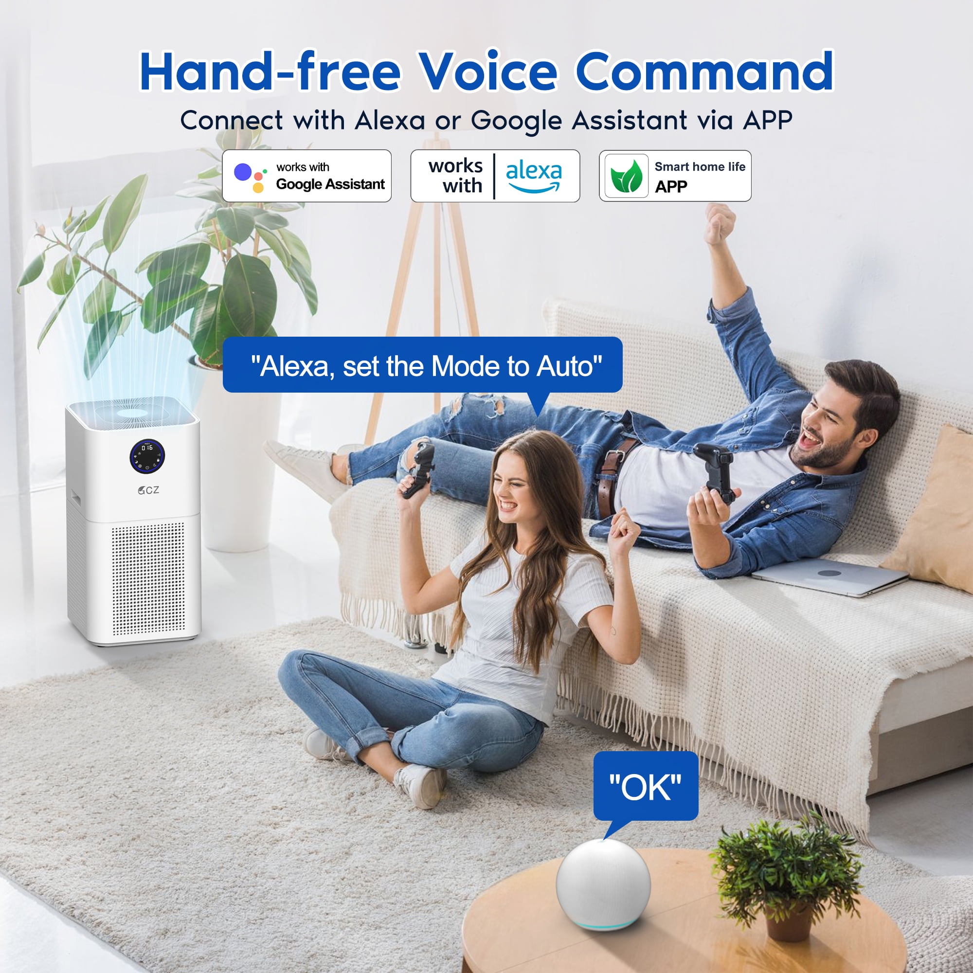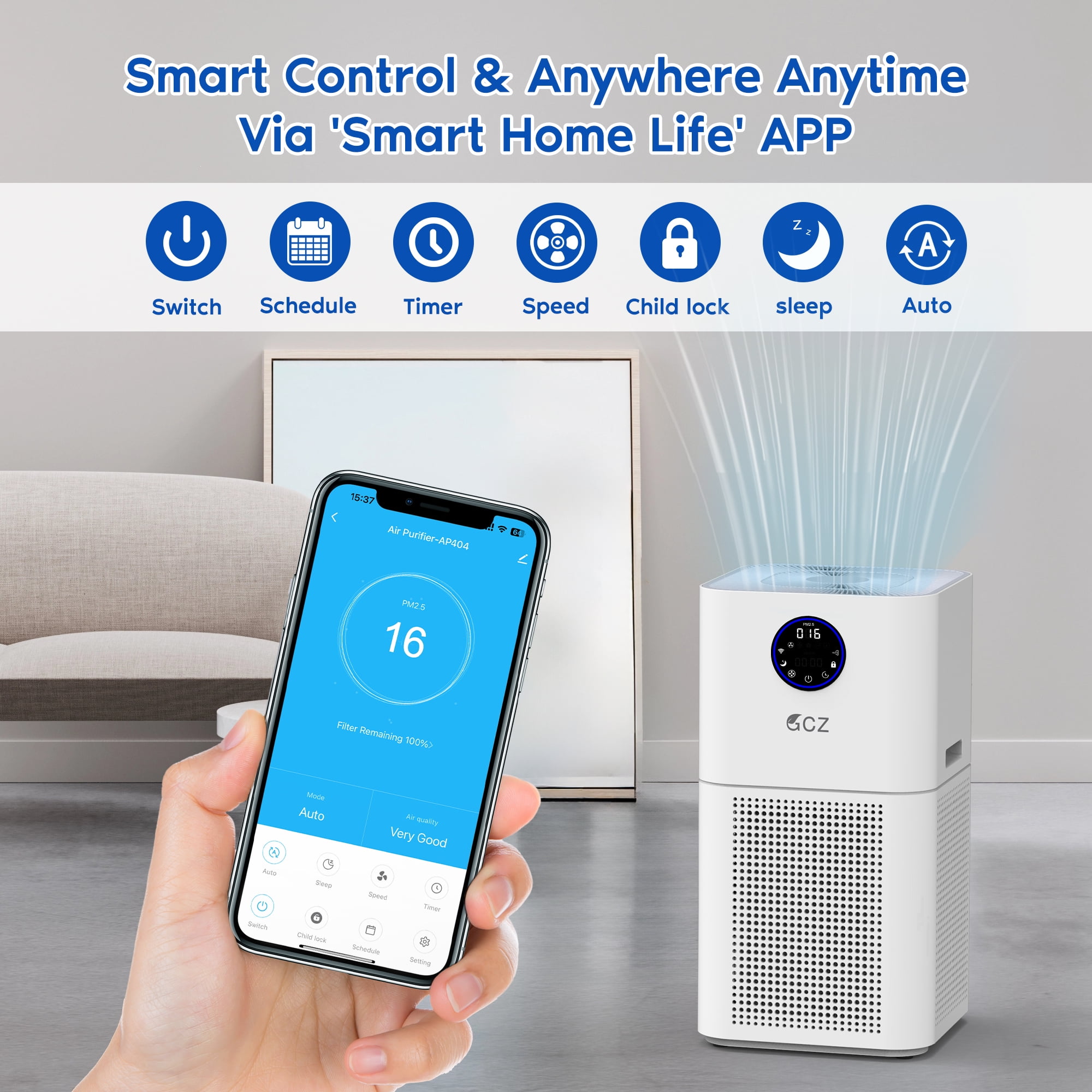 3500 Sq Ft Usage Area: This air purifier features with Turbo-air Technology and 360air inlet, High CADR of 307 CFM / 522 m/h (Clean Air Delivery Rate), can clean up to 3500 sqft per hour, ideal air purifier for home large room and the whole house. 4 Control Methods: Control your air purifiers for home anywhere from the Smart Home Life APP, you can also connect to Alexa or Google Assistant through the APP, and give the air purifier voice commands while your hands are full. Additional, you can still control it with touch buttons and remote control. H13 True HEPA Filter: With a 4-stage filtration system, including pre-filter, true H13 HEPA filter, activated carbon filter, non-woven fabric filter, the HEPA air purifier captures particles as small as 0.3 microns, can reduce up to 99.97% of germs, dust, pollen, pet dander, mold spores, and other allergens. PM2.5 Real-time Display: Our air cleaner has a built-in sensor that continuously updates and displays the PM2.5 levels on the screen. Blue, Green, Yellow, and Red, 4 colors LED light change based on surrounding air quality. If the surrounding air becomes cloudy, such as wildfire smoke, the LED light will appear yellow or red. High-efficiency Purification Speed: This powerful air filter has 4 adjustable fan speeds, Intelligent auto mode can automatically adjust fan speeds based on the air quality. When you are in the terrible air, you can directly select the high-speed mode to bring you fresh air more efficiently and faster. Ultra-quiet Sleep Mode: Using this hepa air purifier will relieve allergies, asthma symptoms and improve your sleep quality. When operating in sleep mode, our air purifier for large room fan operates at low speed with low noise (less than 24dB), and all indicator lights are turned off. Filter Replacement Reminder: AP404 air filter machine is set up with a 3000h filter replacement reminder. The indicator light will flash to remind you to replace the filter. It is recommended to replace your filter every 6-8 months depending on the use and air quality.