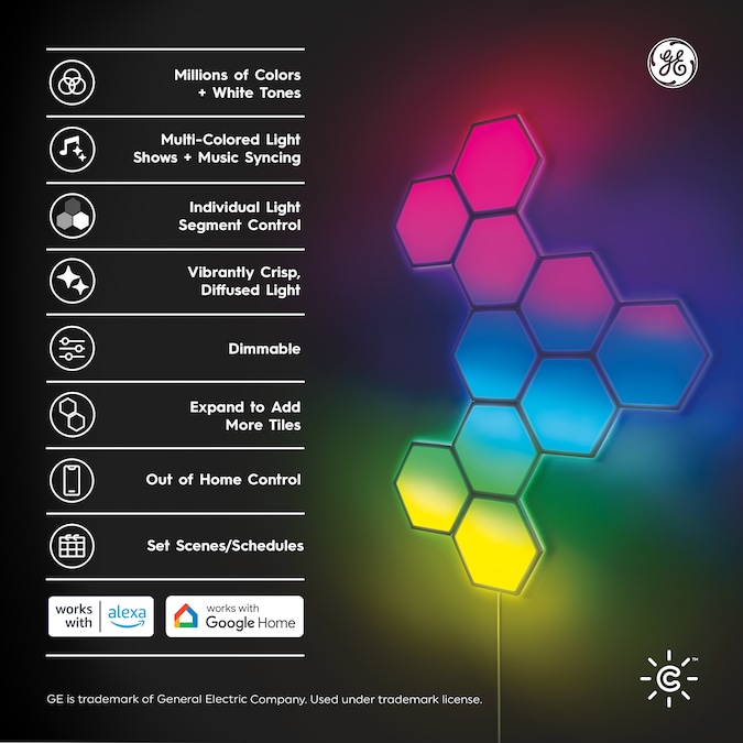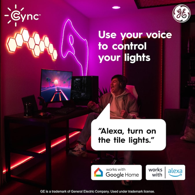 The Cync Full Color Dynamic Effects Hexagon Panel Light lets you install modern angular smart tiles to create a unique design. Create unique wall art by making shapes and organic designs with these wall tiles. The hexagon wall panels feature scheduling, light shows, music sync and millions of colors to enhance any space – no hub needed. Select from a wide range of white color tones from 2000K to 7000K and pinpoint the perfect white light. Choose from millions of additional colors to enhance the vibe in the room with these hexagon LED lights, ideal for entertaining and holiday décor. Get more out of your LED color changing lights with out of home control and scheduling through the intuitive Cync App, powered by Savant, and voice control when you pair these LED wall panels with Amazon Alexa or Google Home devices. These hexagon tiles come with a control box, power cord, linking cables, adhesive strips, traceless nails, screws, orientation tool, and panel remover tool.