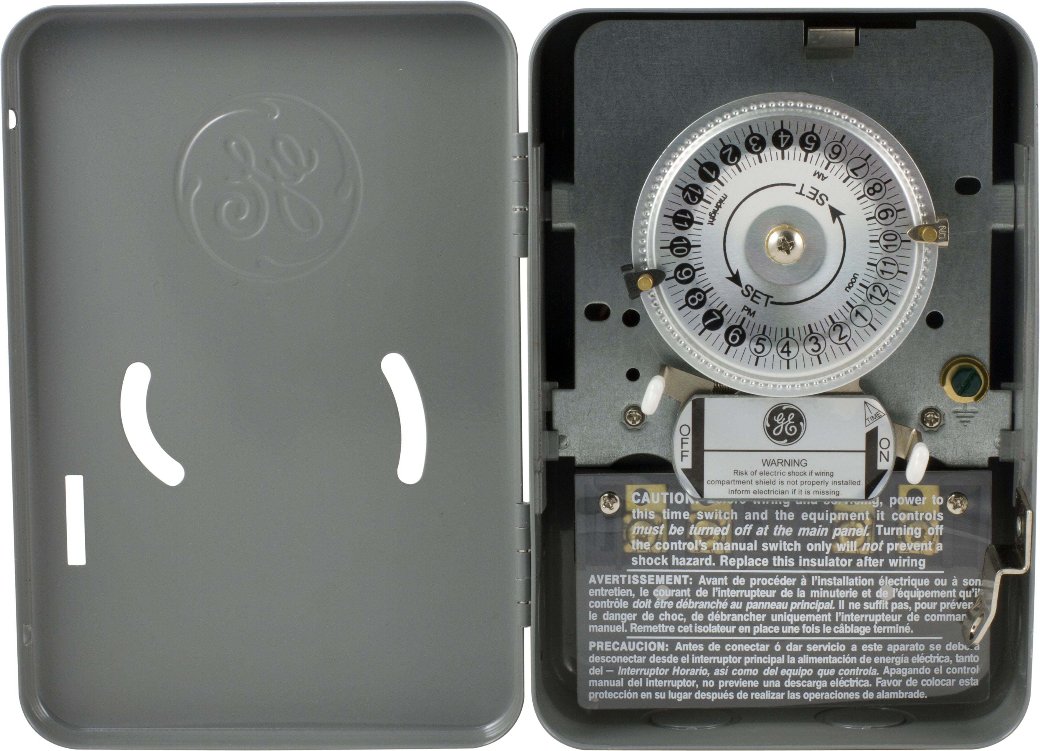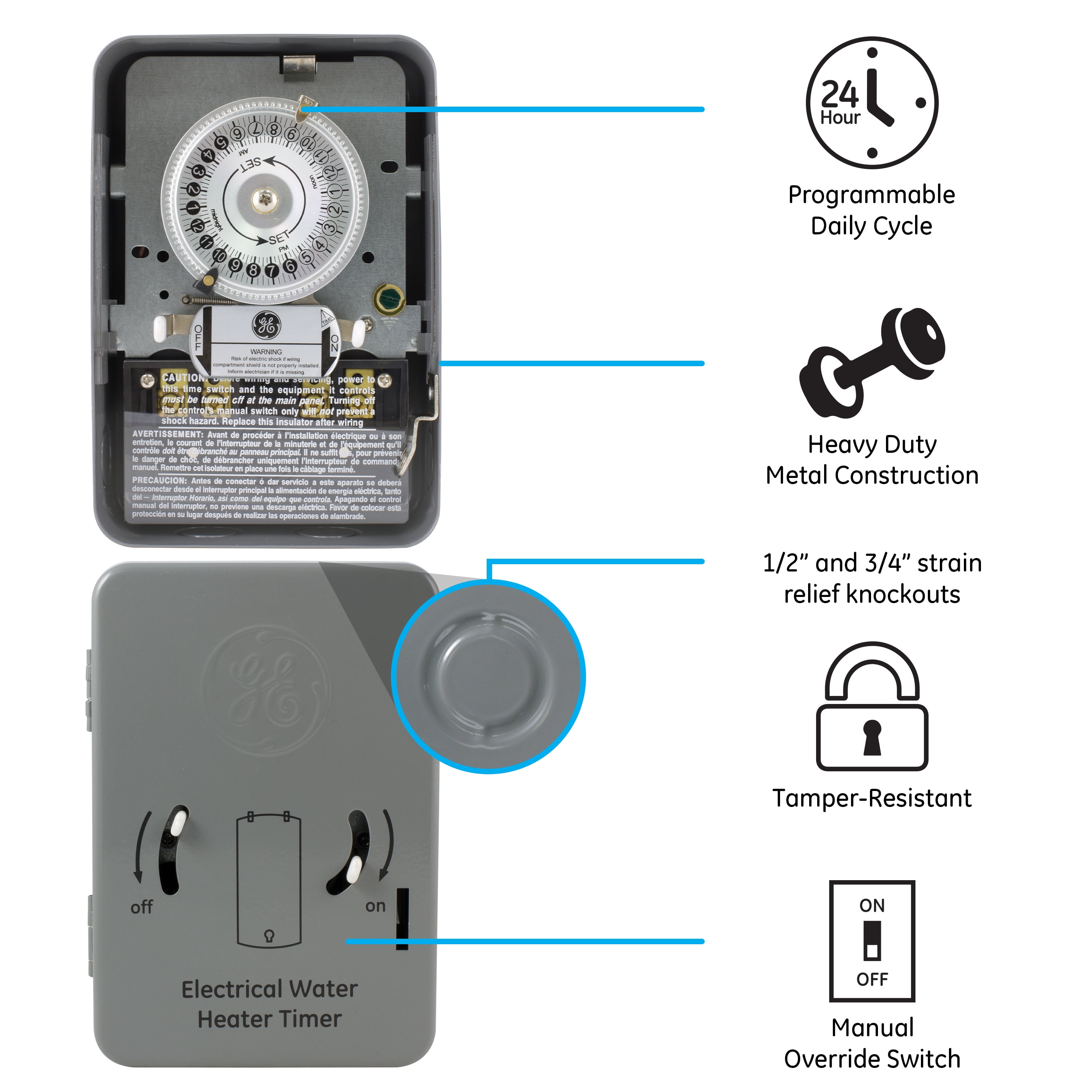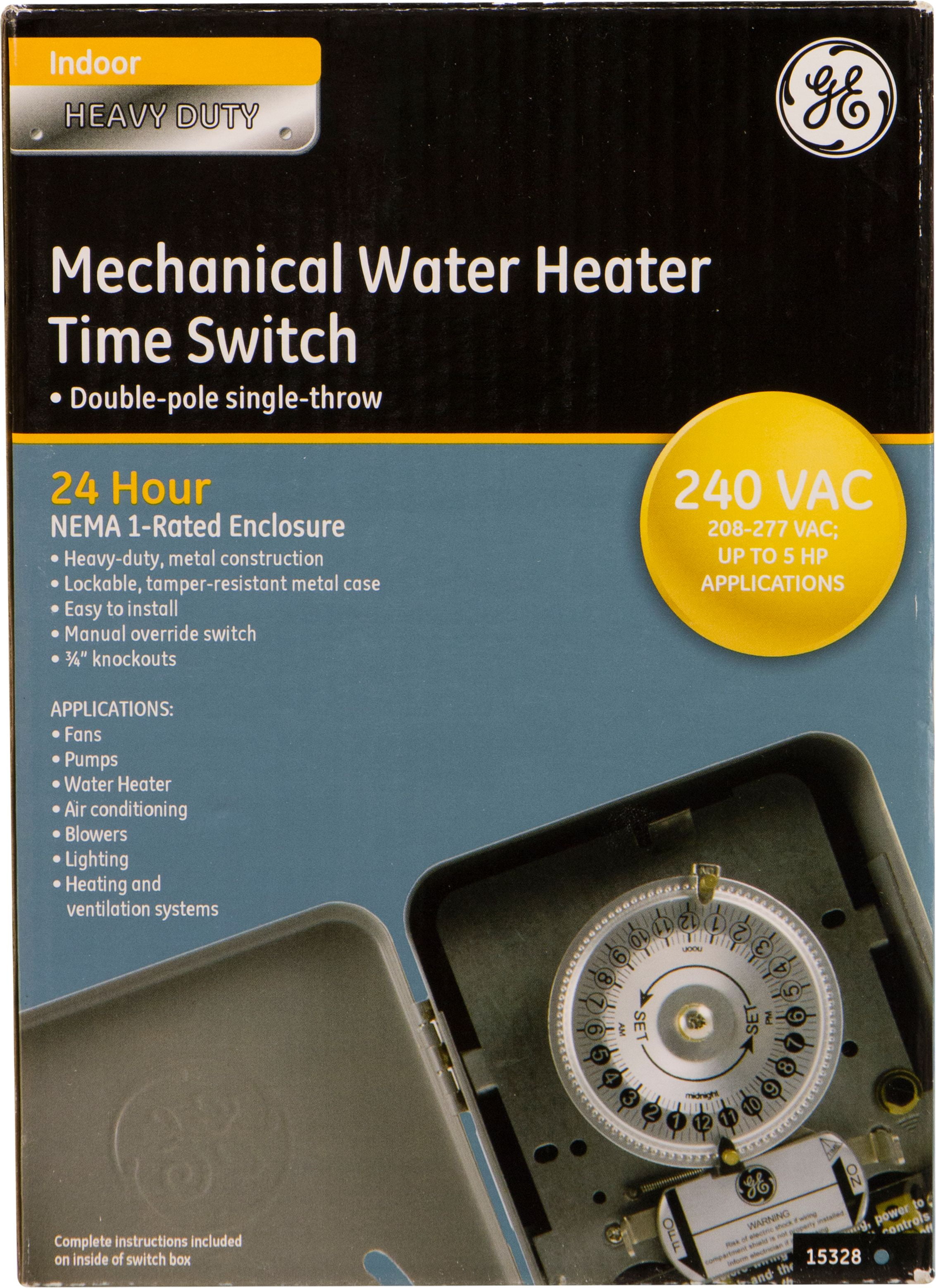 Schedule your day with a GE-branded Heavy-Duty Mechanical Water Heater Time Switch. In addition to water heaters, the heavy-duty, indoor time switch is perfect for fans, pumps, pool heaters, AC units, heating and ventilation systems, and more. For increased versatility, it is compatible with LED, CFL, incandescent and halogen bulbs. The time switch supports 240VAC systems up to 5HP and is compatible with double-pole single-throw switches. A 24-hour cycle provides daily scheduling using ON/OFF trippers. One set of trippers is included, and additional pairs are sold separately. The manual override switch, which can be accessed without opening the housing, allows complete control of your appliances. Its heavy-duty metal construction features a lockable, tamper-resistant case that is NEMA-1 rated to increase durability and security. Stamped 1/2in. and 3/4in. knockouts and convenient mounting holes accommodate a variety of installations. Manage your home’s large appliances with the GE-branded Heavy-Duty Mechanical Water Heater Time Switch.