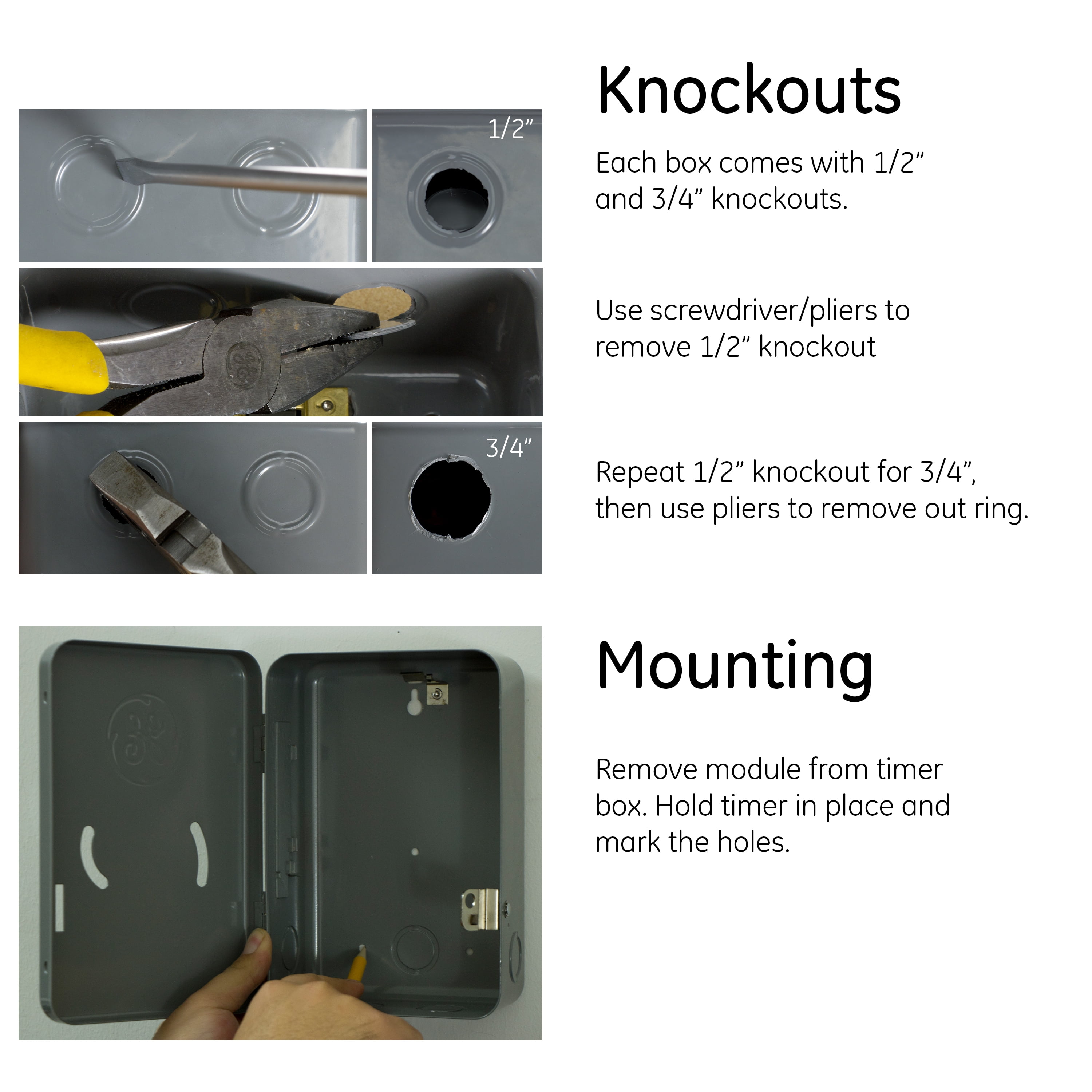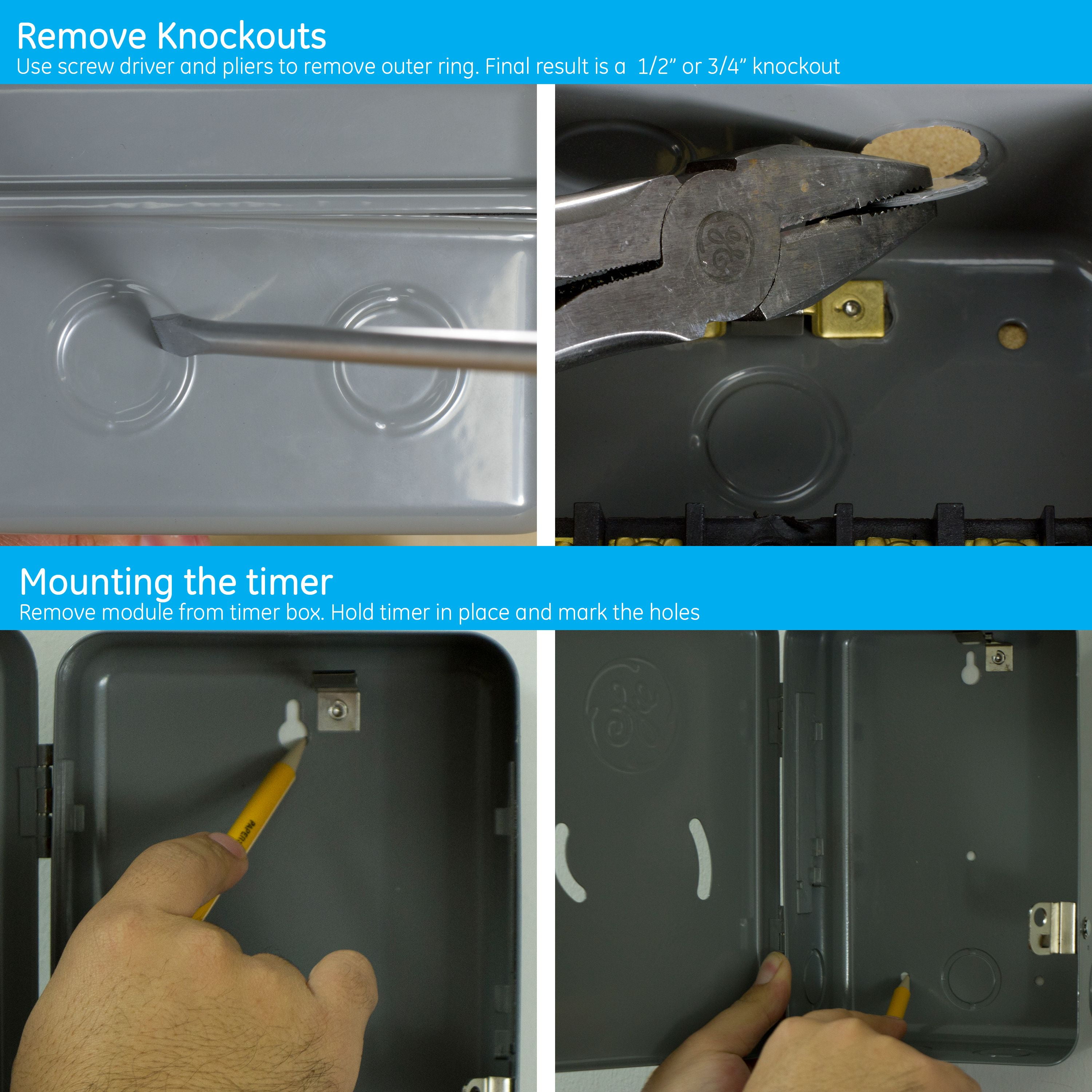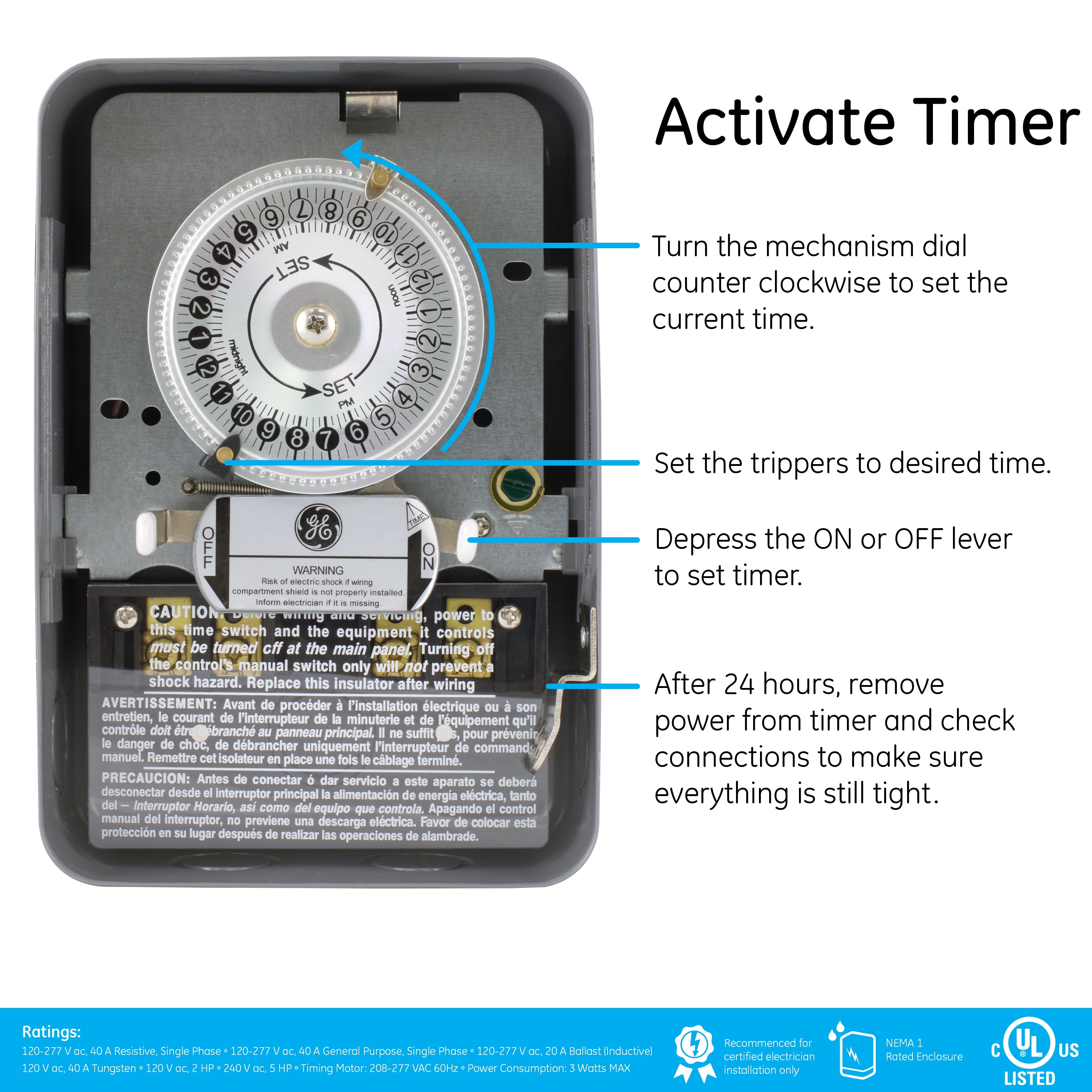 Schedule your day with a GE-branded Heavy-Duty Mechanical Water Heater Time Switch. In addition to water heaters, the heavy-duty, indoor time switch is perfect for fans, pumps, pool heaters, AC units, heating and ventilation systems, and more. For increased versatility, it is compatible with LED, CFL, incandescent and halogen bulbs. The time switch supports 240VAC systems up to 5HP and is compatible with double-pole single-throw switches. A 24-hour cycle provides daily scheduling using ON/OFF trippers. One set of trippers is included, and additional pairs are sold separately. The manual override switch, which can be accessed without opening the housing, allows complete control of your appliances. Its heavy-duty metal construction features a lockable, tamper-resistant case that is NEMA-1 rated to increase durability and security. Stamped 1/2in. and 3/4in. knockouts and convenient mounting holes accommodate a variety of installations. Manage your home’s large appliances with the GE-branded Heavy-Duty Mechanical Water Heater Time Switch.