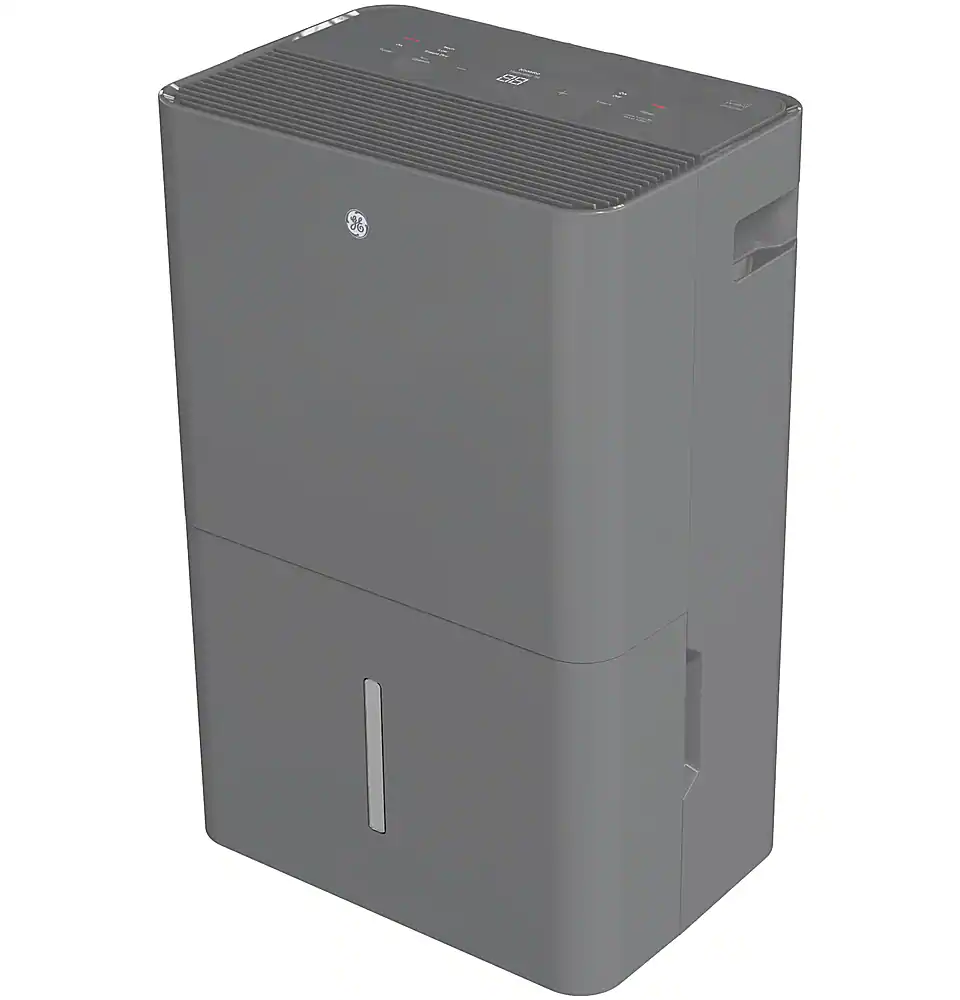 GE Appliances Energy Star dehumidifiers are designed to effectively remove excessive moisture for various dampness levels, offering optimal home comfort for you and your family. The GE 50 pint Energy Star Dehumidifier with built-in pump removes up to 50 pints of water from the air every 24 hours. This model is ideal for wet room conditions, anywhere in the home, basement, garage, or high humidity areas. The built-in pump with an included hose, allows water to be drained to any convenient location up to 16 feet away. This feature eliminates the need to check in on the water level in the bucket, so you don’t have to empty the bucket periodically. Smart Dry mode compares the set humidity with the room’s actual humidity and automatically adjusts the fan speed accordingly. The soft touch control panel and LED digital controls on this GE dehumidifier let you clearly see and manage your settings. The Energy Star model offers 2 fan speeds to choose from, auto defrost control, and a 2 or 4-hour off timer, while pocket handles and easy roll hidden wheels make it easy to move from one location to another.