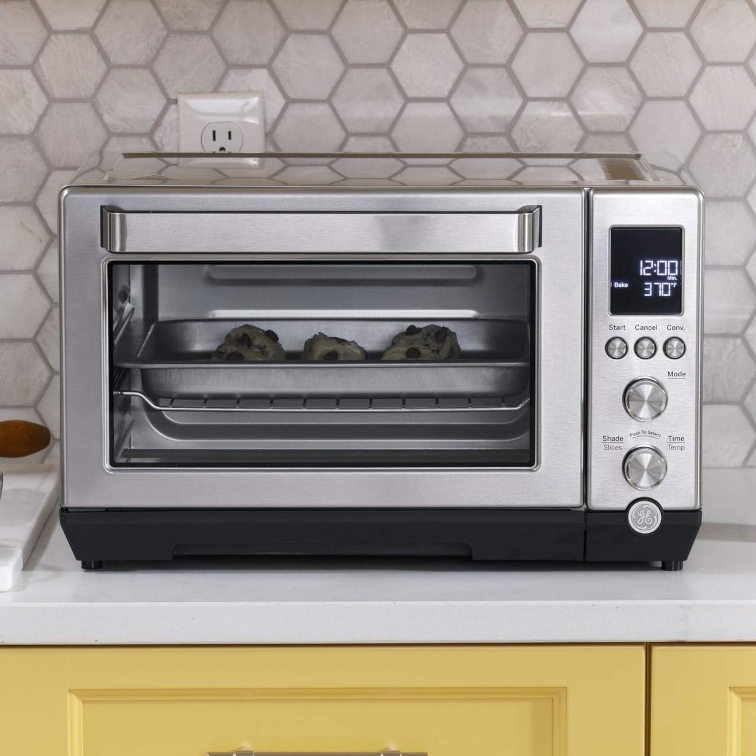 GEG90CABSSPSS GE Convection Toaster Oven Quartz Heating Technology Rack & Baking pan Air fryer accessories GE Quartz Convection Toaster Oven Features Quartz Heating Element Toast, bake or broil foods quickly thanks to the rapid quartz heating elements that combine with the halogen heating elements to deliver a faster preheat Large Capacity Versatile and spacious, this large toaster oven will toast 6 bagel halves, roast an 8 lb. chicken, or bake a 12″ pizza, all with room to spare 7 Cooking Modes This convenient, multifunctional toaster oven meets a range of cooking needs and comes with seven easy-to-use functions, which include toast, bake, broil, bagel, pizza, roast and keep warm Crumb Tray Clean up with ease thanks to an external, removable toaster crumb tray at the bottom of the toaster oven Specificiations Color: Stainless Steel Capacity: .88 Cubic Feet (Fits 12″ Pizza, 6 Slices Of Toast, Or 9″ x 11″ Baking Pan) Cooking Technology: Convection Heating Element: Quartz Power: 1500 Watt Power Presets: Bagel, Bake, Broil, Keep Warm, Pizza, Roast, Toast Weight And Dimensions: 19.4 Lbs (15 inch L x 11 inch H x 18 inch W)