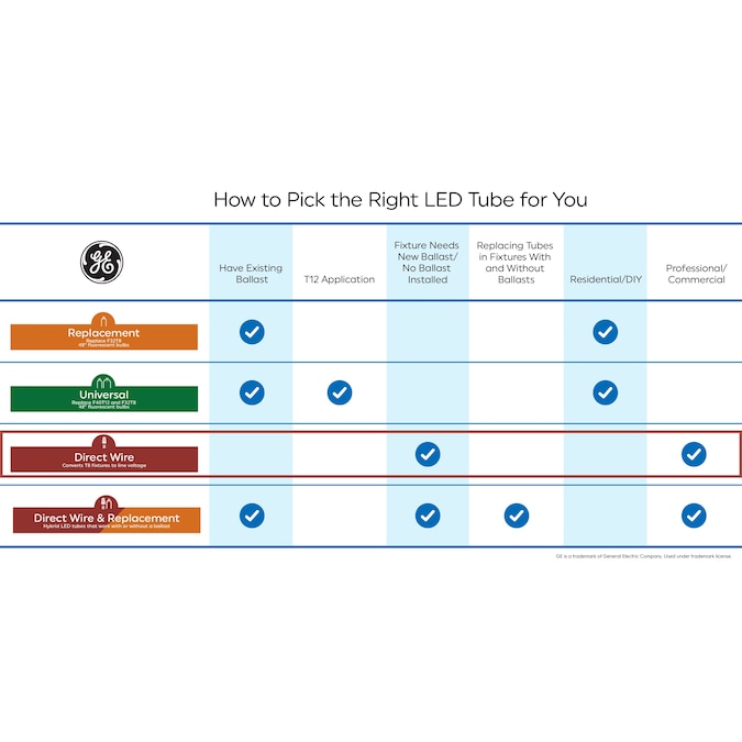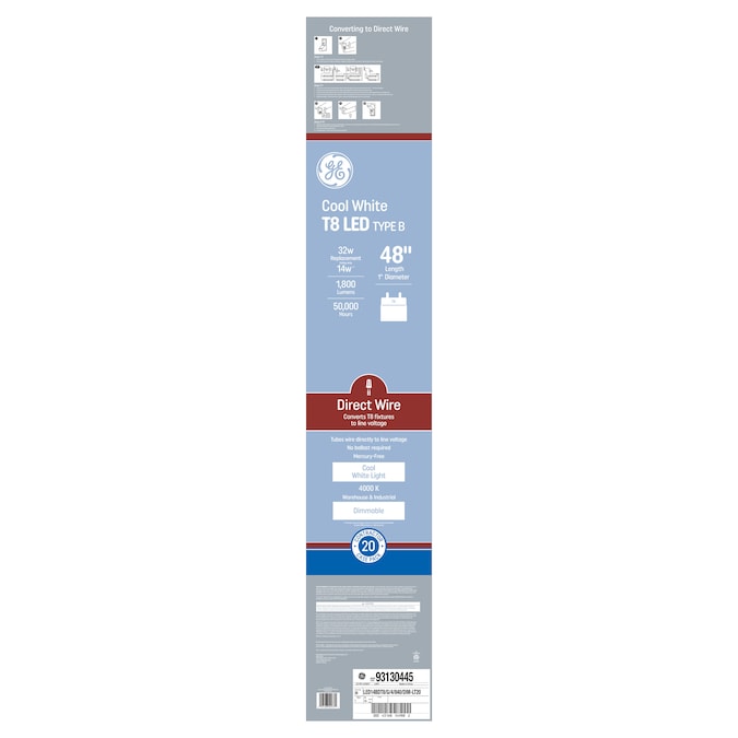 GE’s Cool White T8 LED tubes replace 48-inch T8—1-inch diameter—fluorescent bulbs using the existing fixture and do not require a ballast. This Direct Wire tube converts T8 fixtures to line voltage and removes the need for a ballast thus eliminating ballast compatibility issues. Why make the switch to LED? GE’s LED tubes are rated to last 50,000 hours. They use less energy than a 32-Watt T8 with nearly the same light output helping you save money on energy. And, they’re mercury free. Use Cool White T8 LED tubes in basements, garages and commercial applications like warehouses and industrial buildings to provide cool, neutral white light.