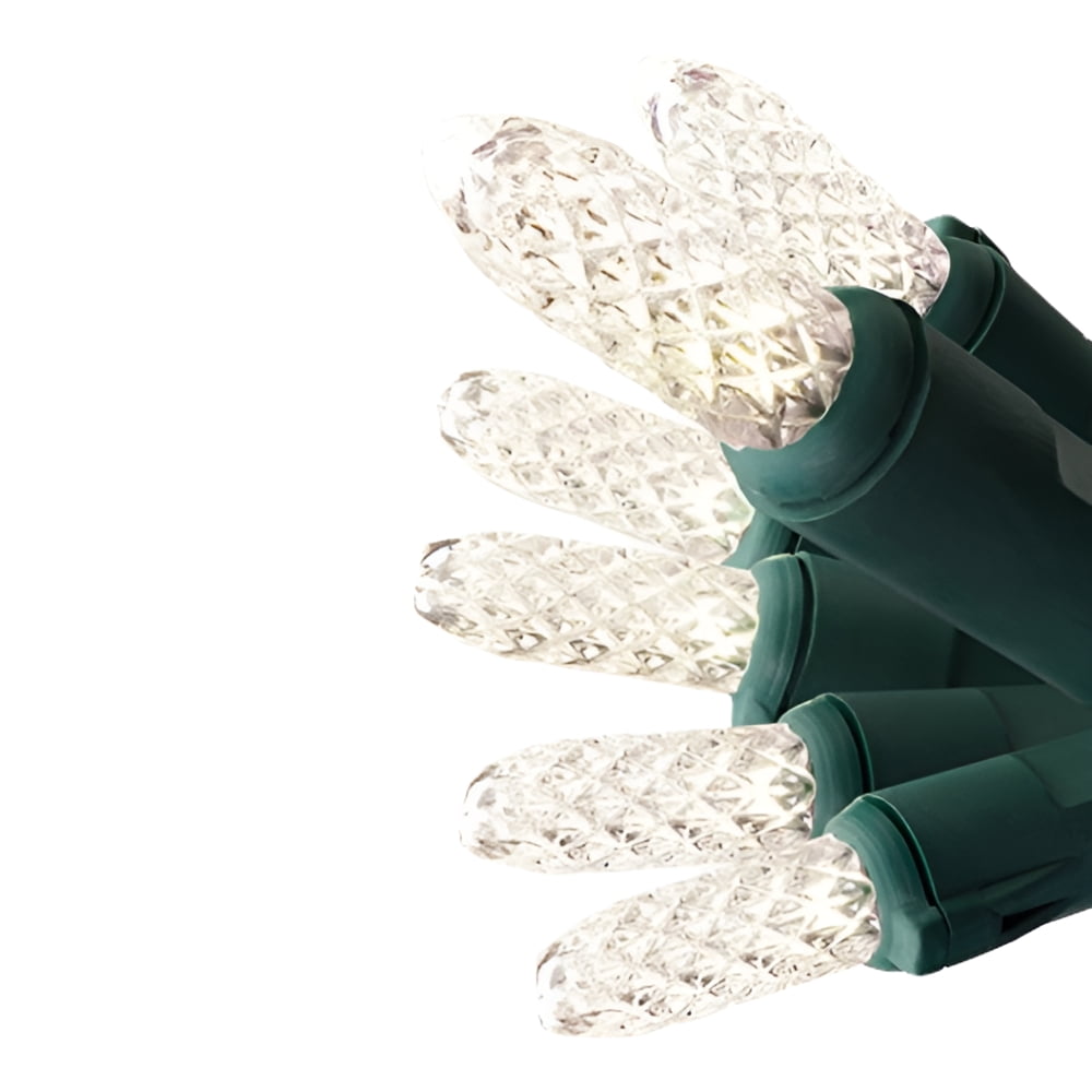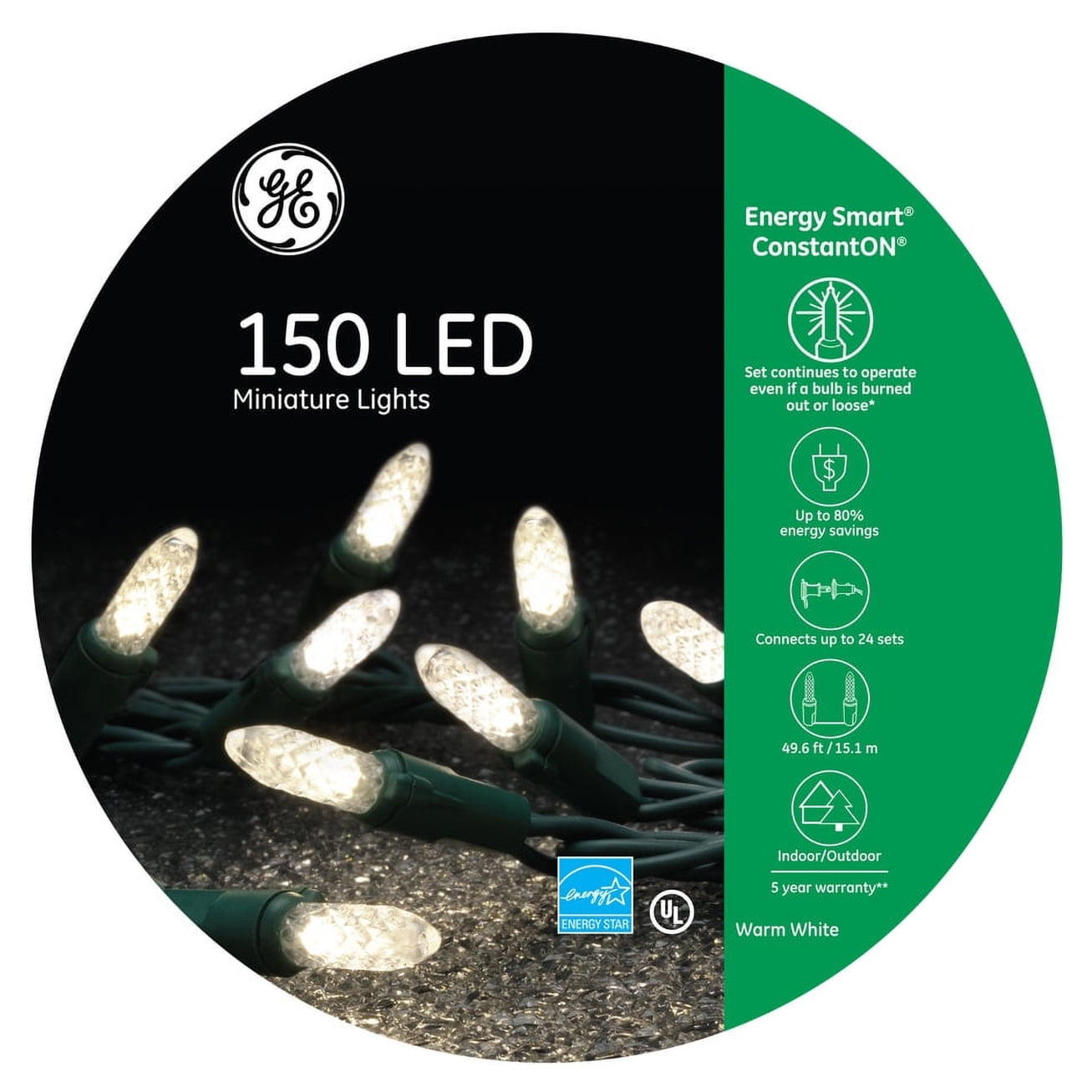 GE Energy Smart 150 LED Faceted Miniature Christmas string lights on a storage reel 150-Count Warm White LED lights continue to operate even if a bulb is burned out or loose 49.6-Feet lighted length, green cord with fused plug. Replacement bulbs and fuses included for added convenience Can connect up to 24 sets