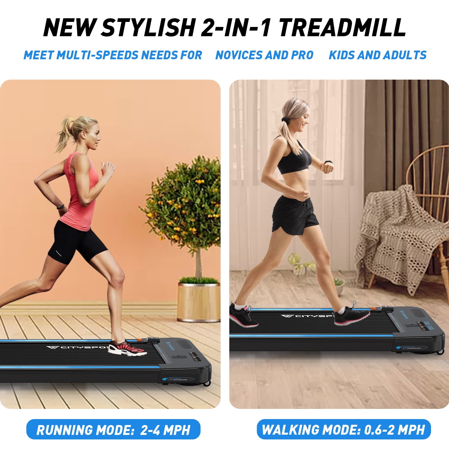 ” At present, we bring you an ultra-thin design, a high-end 2-in-1 walking pad treadmill with Bluetooth speakers & wireless remote. Lightweight sleek design and durable frame. Max load up to 265 lb. Design with children’s lock, low profile deck for easy get on or down, and wider side standing harness maximize safety. With a powerful and ultra-quiet brushless motor, the treadmill under the desk could work quietly without disturbing others, an ideal choice for home and office. The 7-layer non-slip texture running belt features a spacious running area(43″” x17″”), providing an effective cushion for your knees and muscles for a superior running experience that is safer and more comfortable. Compact, space-saving design and built-in transport wheels make it easy to move and store. It’s out of the box & NO ASSEMBLY. Equipped with a dual LED display shows time, speed, distance, and calories. In addition, the wireless remote controller allows you to adjust speed easily. What’s more, the built-in Bluetooth speaker plays wonderful music anytime. NOTE: Turn on the walking treadmill, and long press the “ – ” button on the remote to unlock the children’s lock. “