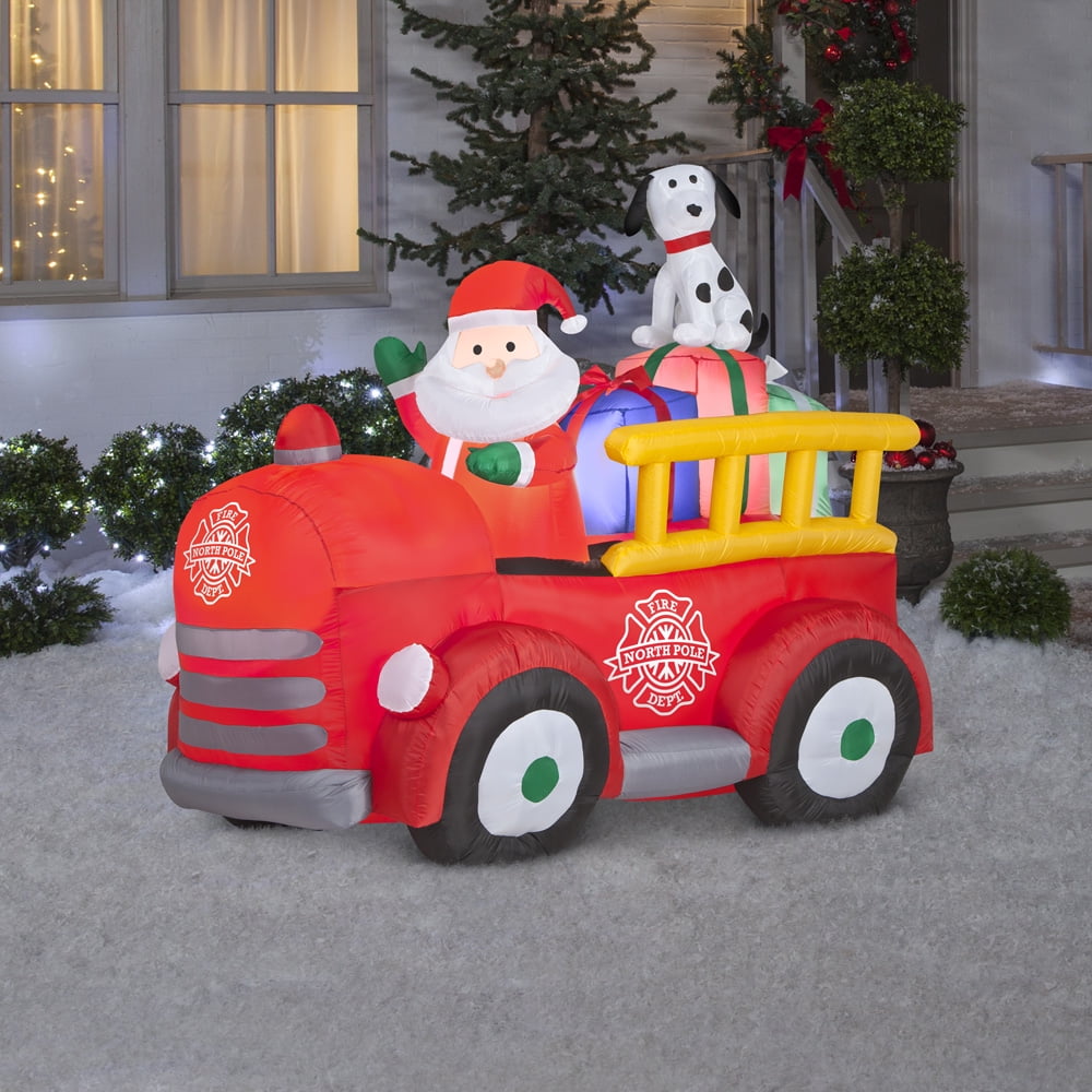 Santa will drive anything, including a Vintage Fire Truck.. This adorable Santa Airblown will bring any outdoor Christmas display to life.. Santa even has a friend with him.. Energy-efficient LED lighting.. Self-inflates in seconds..