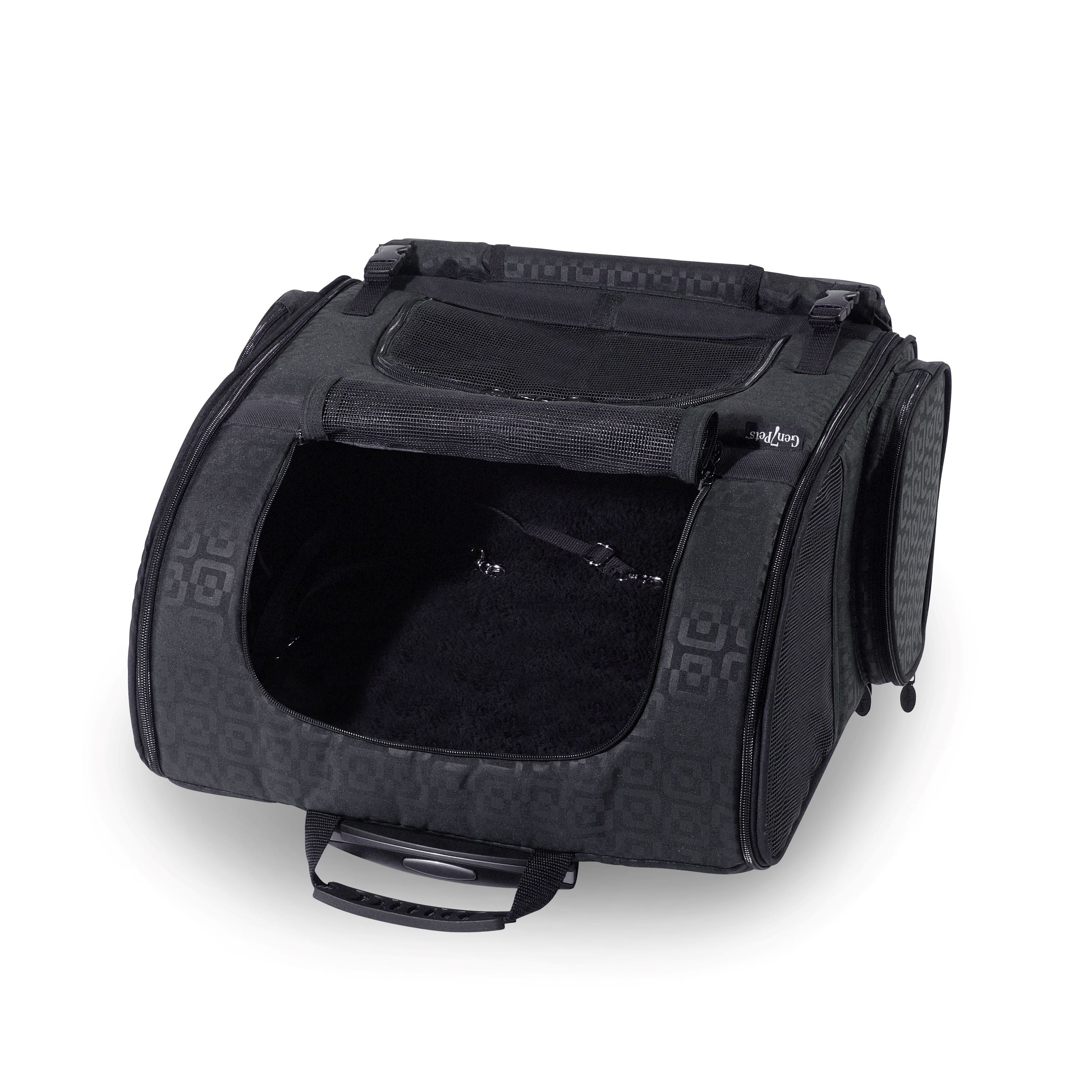 Gen7Pets, Large, Pet Stroller, for Cats and Dogs, Black, 29-in Smart-Level platform will not tip Easily attaches with seatbelt. Fully padded floor and back with the Smart-Comfort pad that is removable and washable. Holds pets up to 20 lbs 2 side storage pockets (for leashes, treats or toys) Easy entry access to the top and front 2 position pull lever height adjustment. Hide-away backpack shoulder pads. 4 wheels provide a smooth ride. The air-approved dog crate meets most airline cargo specifications for easy and safe travel, but pet owners should always check with individual airlines.