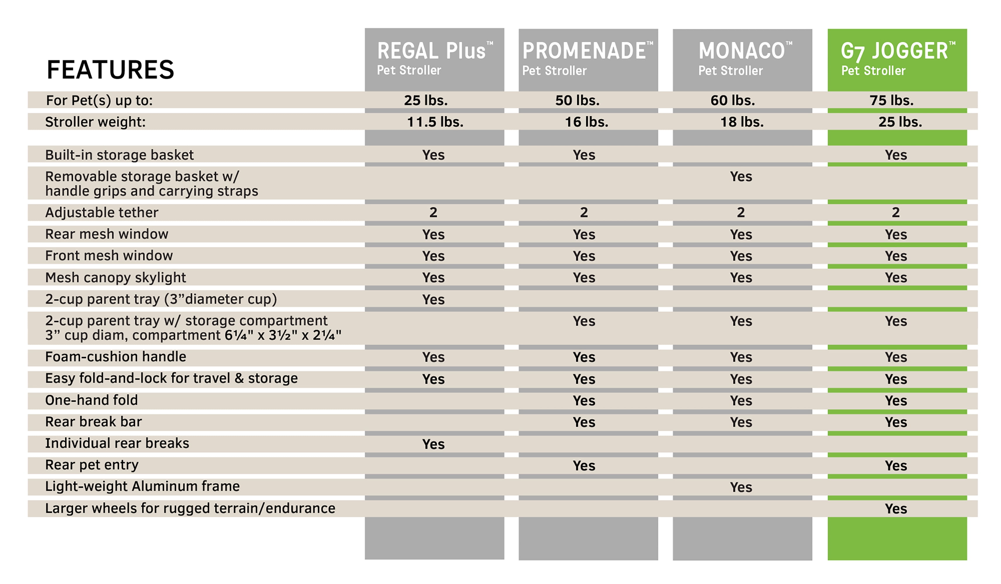 No tools required Flat fold for convenient storage 2 interior adjustable tethers for pet containment and safety Removable thick poly-filled pad Front wheel shock absorbers and a rear wheel single brake bar for safety Front convertible wheel swivels on smooth surfaces and can be locked for rough surfaces Parent tray with 2 cup holders and a large accessory compartment with a lid Holds pets up to 75 lbs Smart-Wheels are easy on easy off never run flat tires Smart-Fold mechanism conveniently allows folding of the stroller from the handle Smart-Reach offers more kick space when pushing the stroller for a more comfortable pace Smart-Basket is enclosed with a rear zipper to provide easy access Smart-Zippers are pre-zipped and never need to be threaded Dog jogging stroller has Smart-Canopy mesh opens up out of the way giving the pet more space when opened